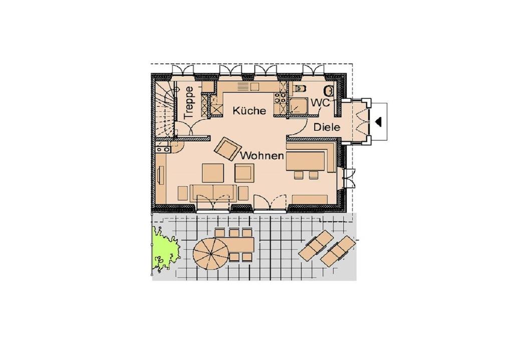 Entréhall med garderob, duschrum/WC, ljust vardagsrum och matsal med Mylin kakelugn, TV och DVD-spelare, fullt utrustat kök med öppen planlösning och utgång till terrassen/trädgården i söder- och österläge, hall med tvättmaskin och torktumlare samt trappa till övervåningen. Övervåning: Sovrum med dubbelsäng och andra TV, duschrum/WC med bastu, andra sovrum med två enkelsängar. Vind: Lekrum/gillestuga med ytterligare en liten TV.