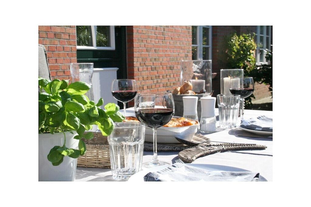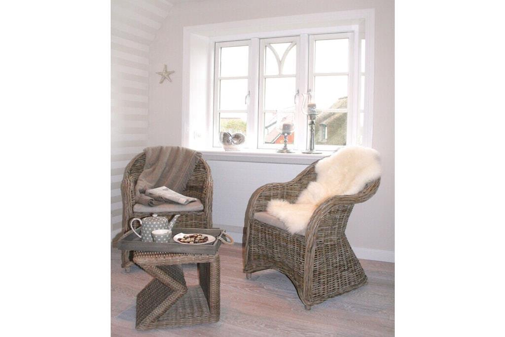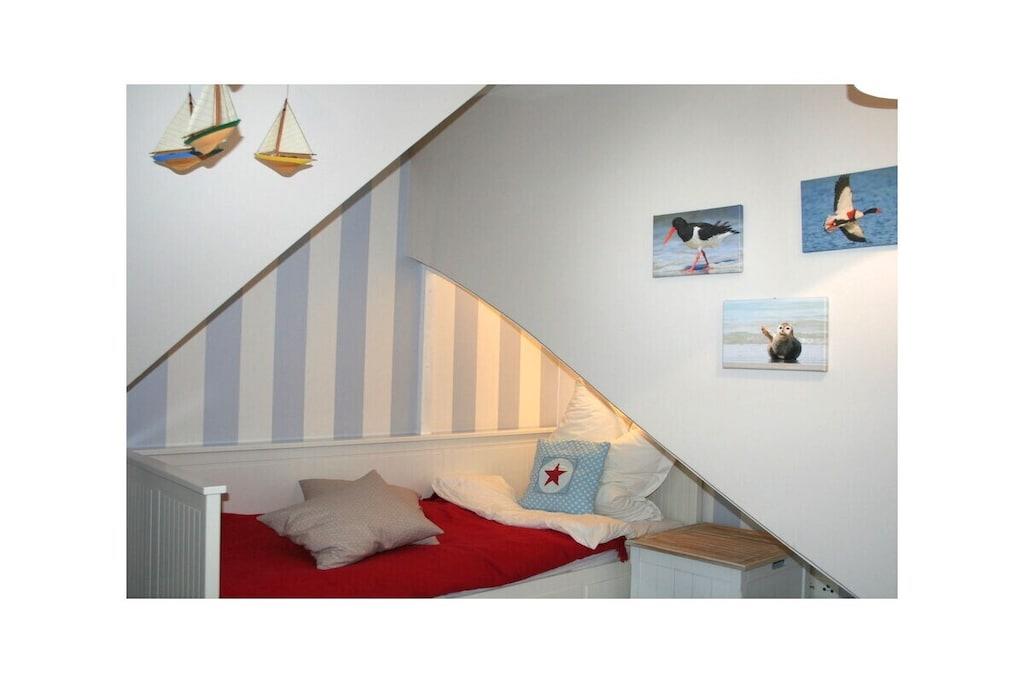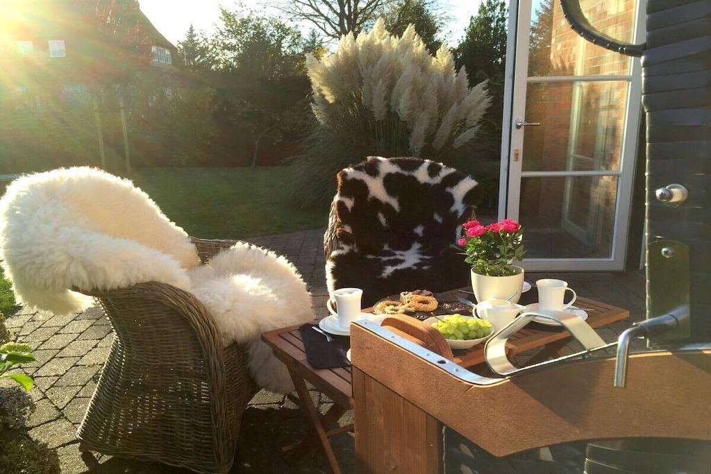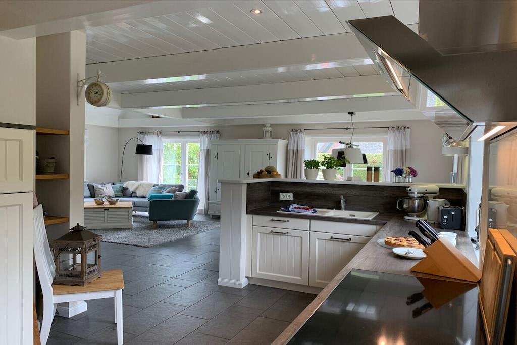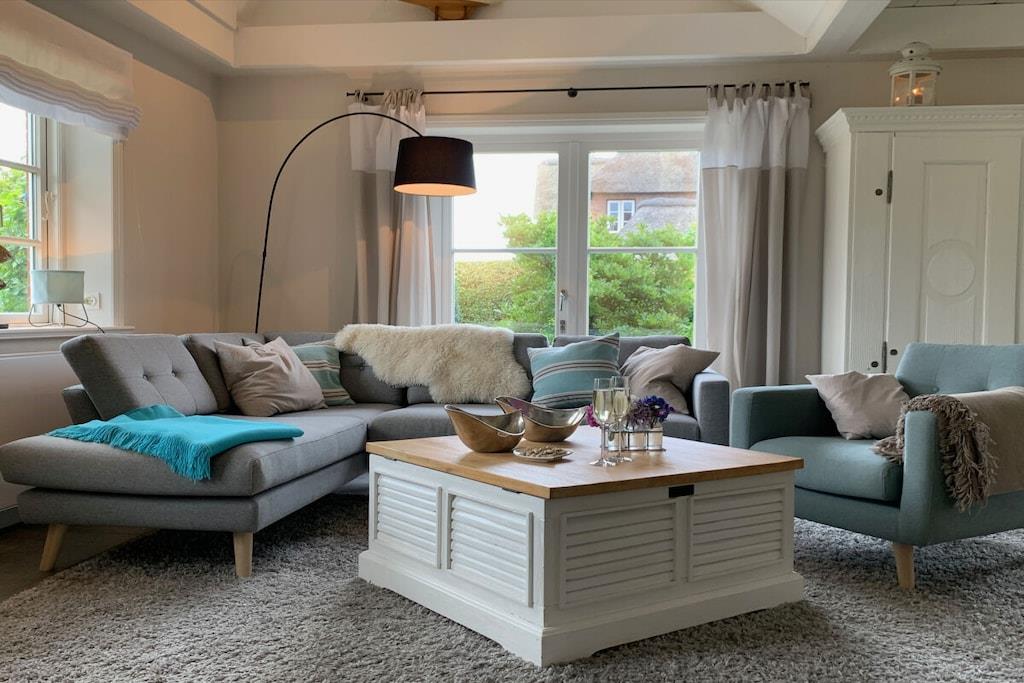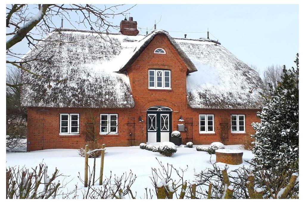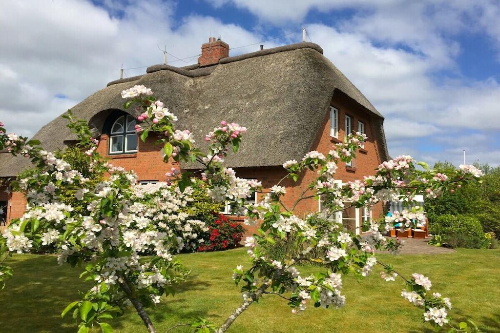 Experience the Föhr passion in this exclusive, detached thatched-roof house, which we will be making even cozier with a comprehensive renovation in November 2024. High-quality furnishings are complemented by thoughtful details, giving this spacious house its hygge charm. In autumn and winter, you can feel the warmth of the historic tiled stove. The sauna heats up nicely at 90 degrees Celsius, or you can choose a more relaxing 60 degrees. A rain shower, relaxation room, and direct garden access complete your sauna experience. For creative culinary moments, you'll find a very well-equipped kitchen. Take time to cook and bake, perhaps a cake with freshly harvested apples, pears, or plums from the garden. Three large showers offer plenty of room to move around in the bathrooms, making it easily accessible for people with disabilities. Please call us for details. Heated loungers (with TV) in the upstairs bathroom are highly recommended for small children during a leisurely family bath. ... 1 living room with dining area and open-plan kitchen, cozy warmth from a historic Mylin tiled stove 1 entrance hall 1 ground floor bedroom with double bed and desk 1 en suite bathroom with large shower, bench, and double vanity 1 first floor bedroom with double bed 1 first floor children's room with two single beds 1 playroom/chill-out room 1 guest WC 1 first floor bathroom with family shower, bathtub, heated bench, and relaxation area 1 sauna area with sanarium and shower, relaxation loungers, and garden access 1 laundry/utility room