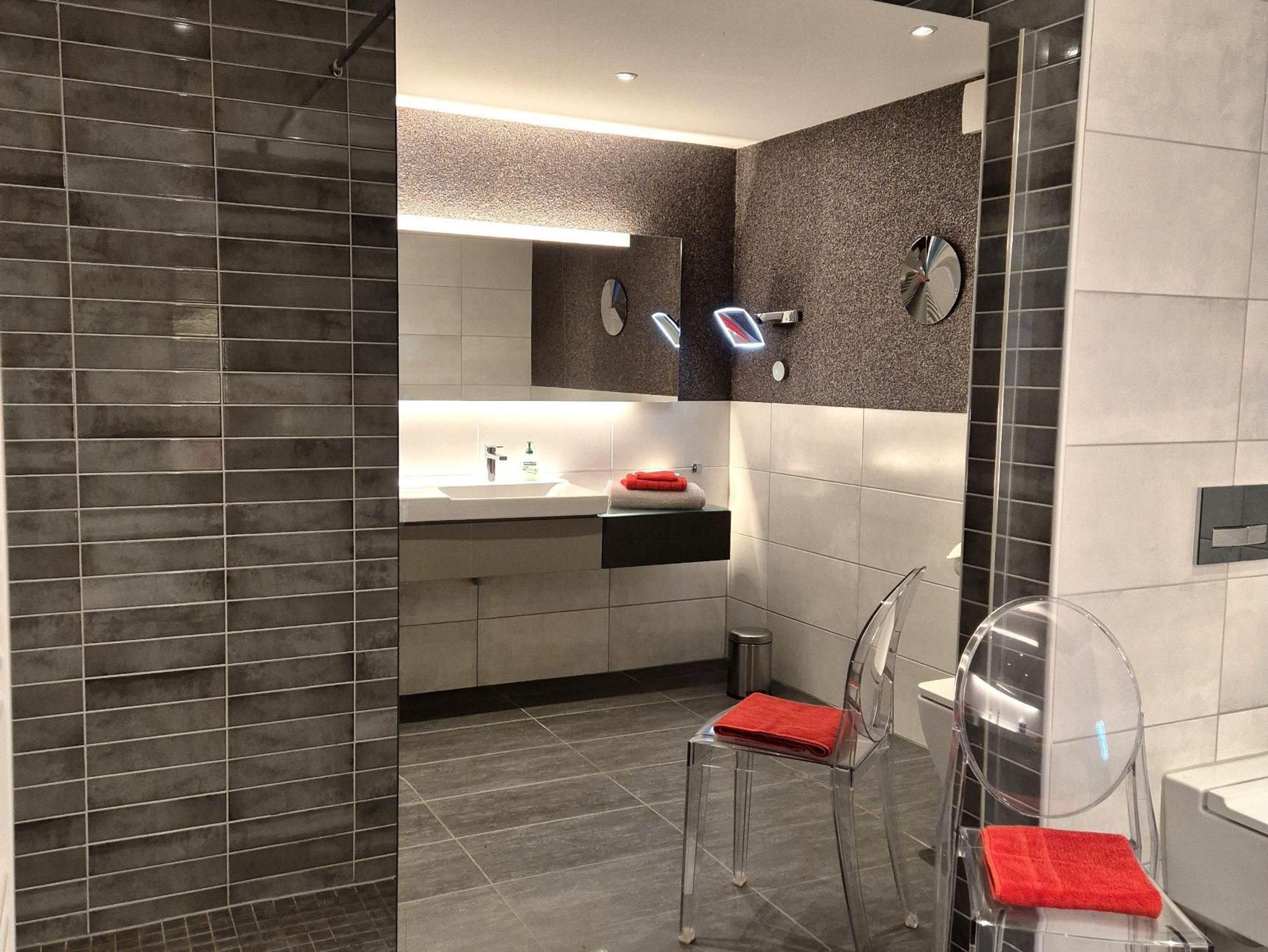 Sanitär: bodenebene Dusche, Föhn, Handtuchheizkörper, Schminkspiegel.