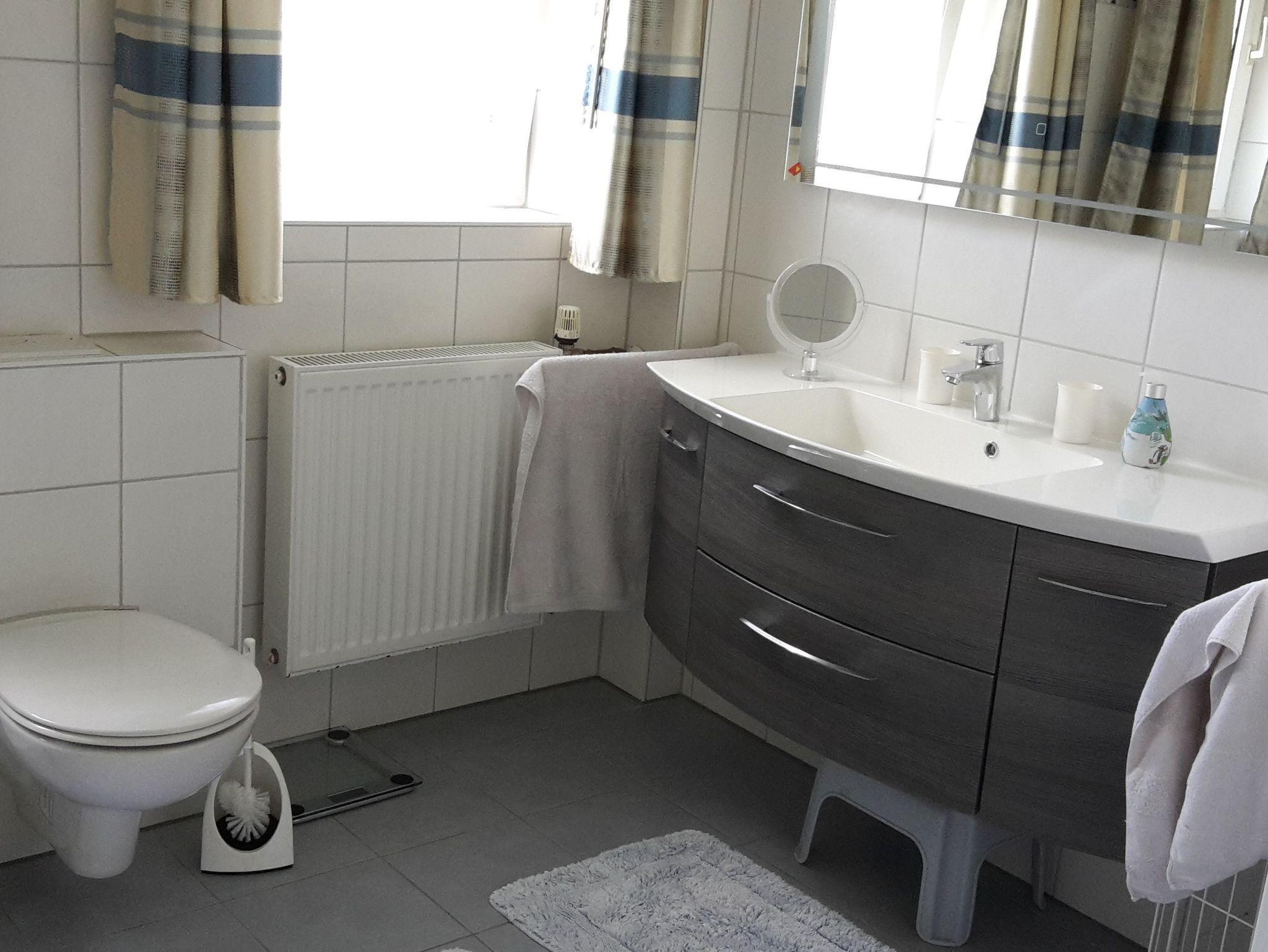 Sanitär: Föhn, Handtuchheizkörper, Schminkspiegel.