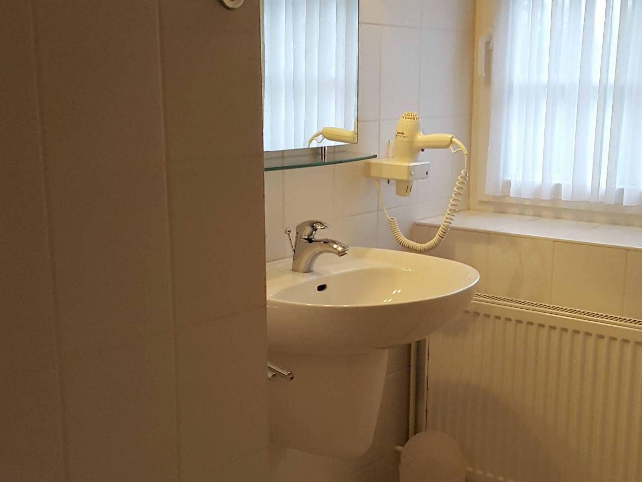 Sanitär: Föhn, Handtuchheizkörper, Schminkspiegel.