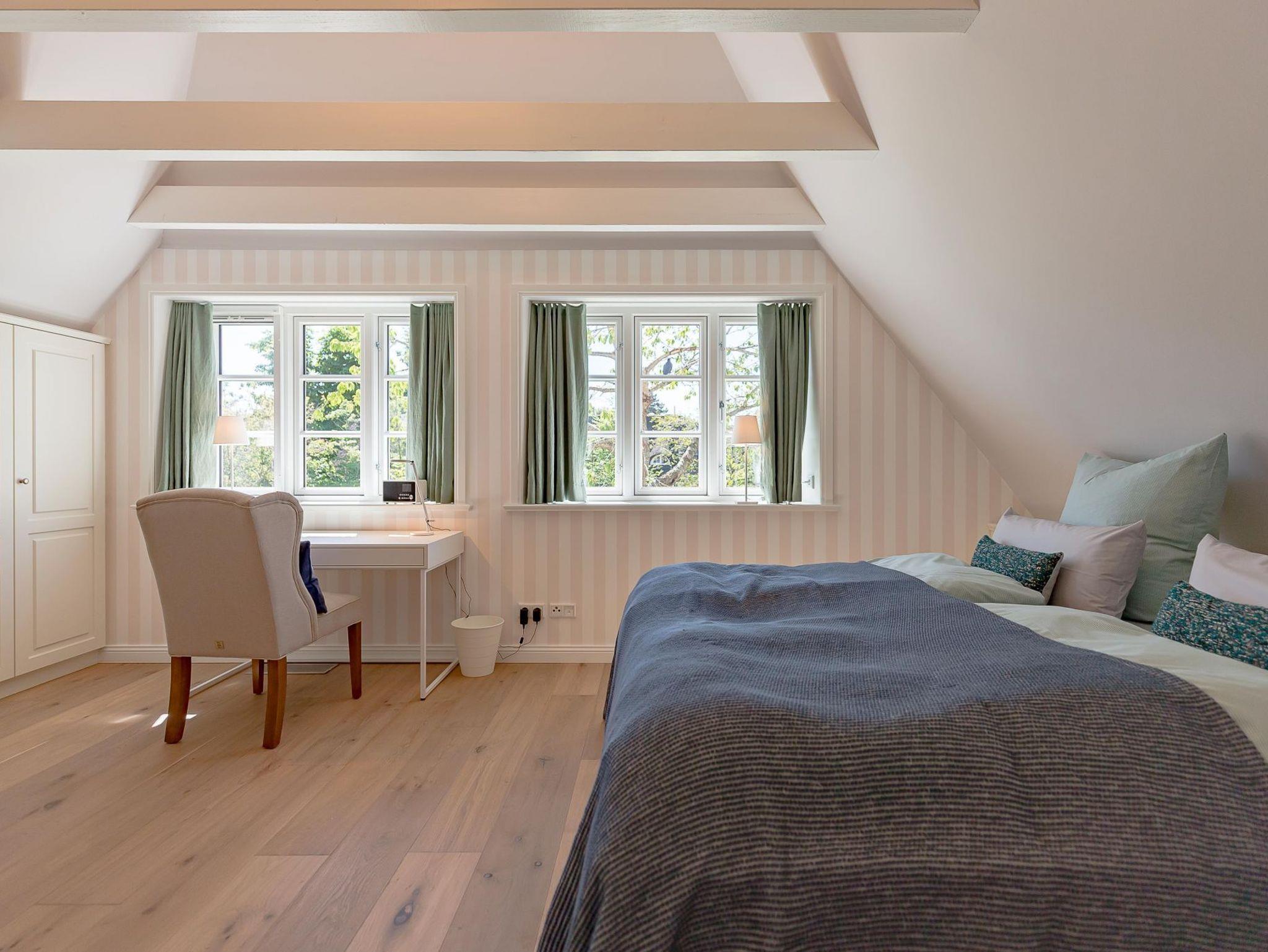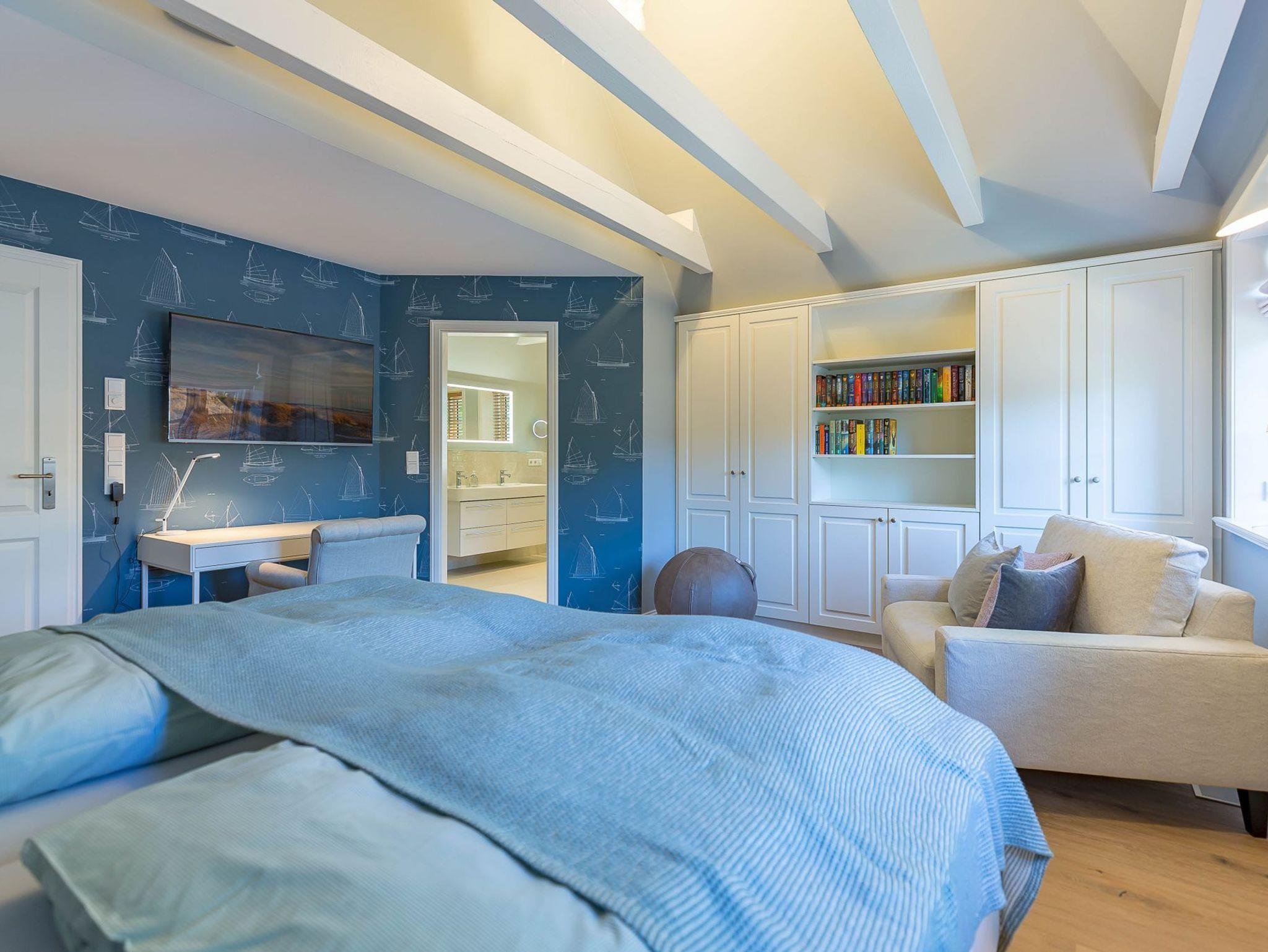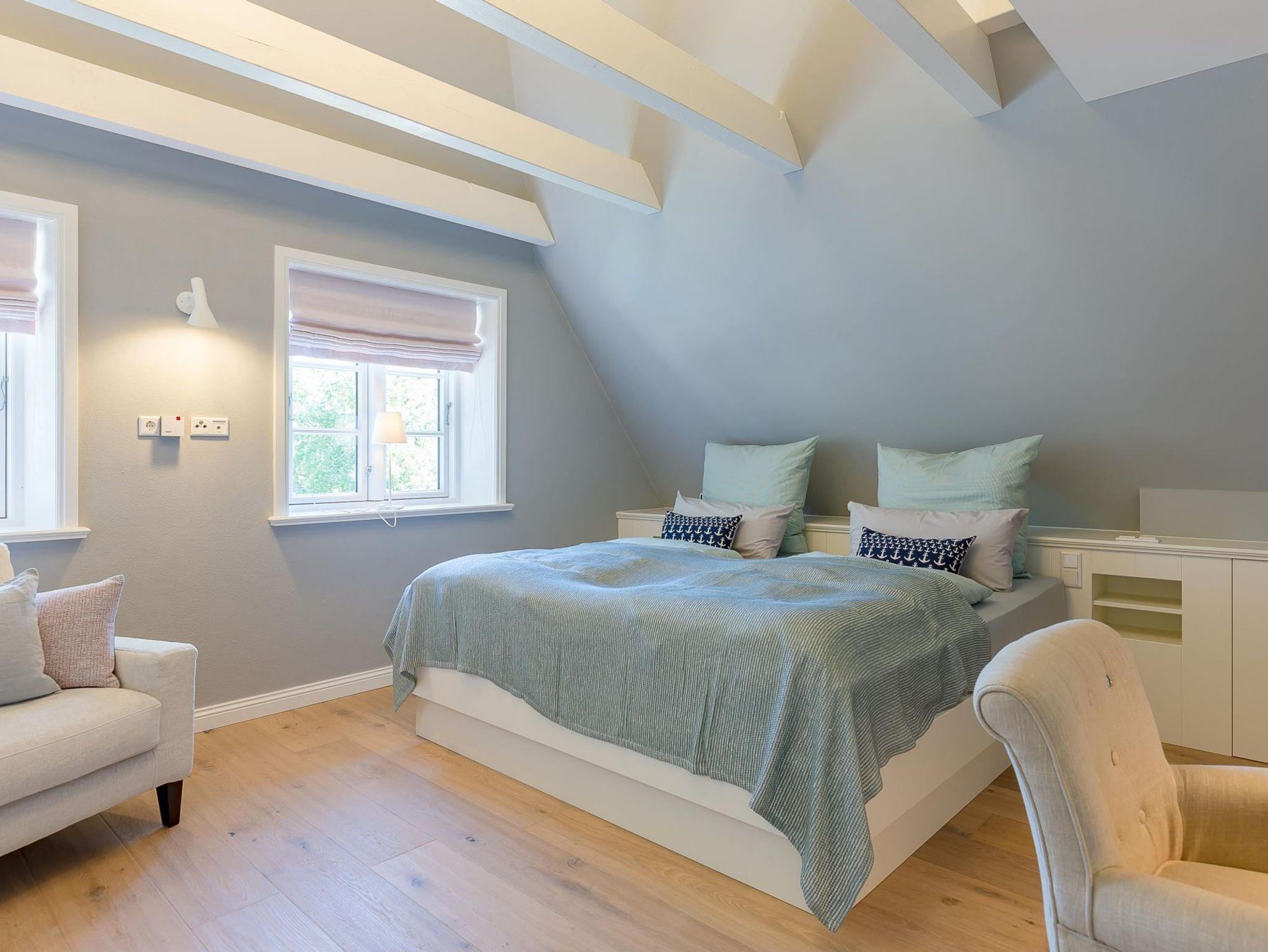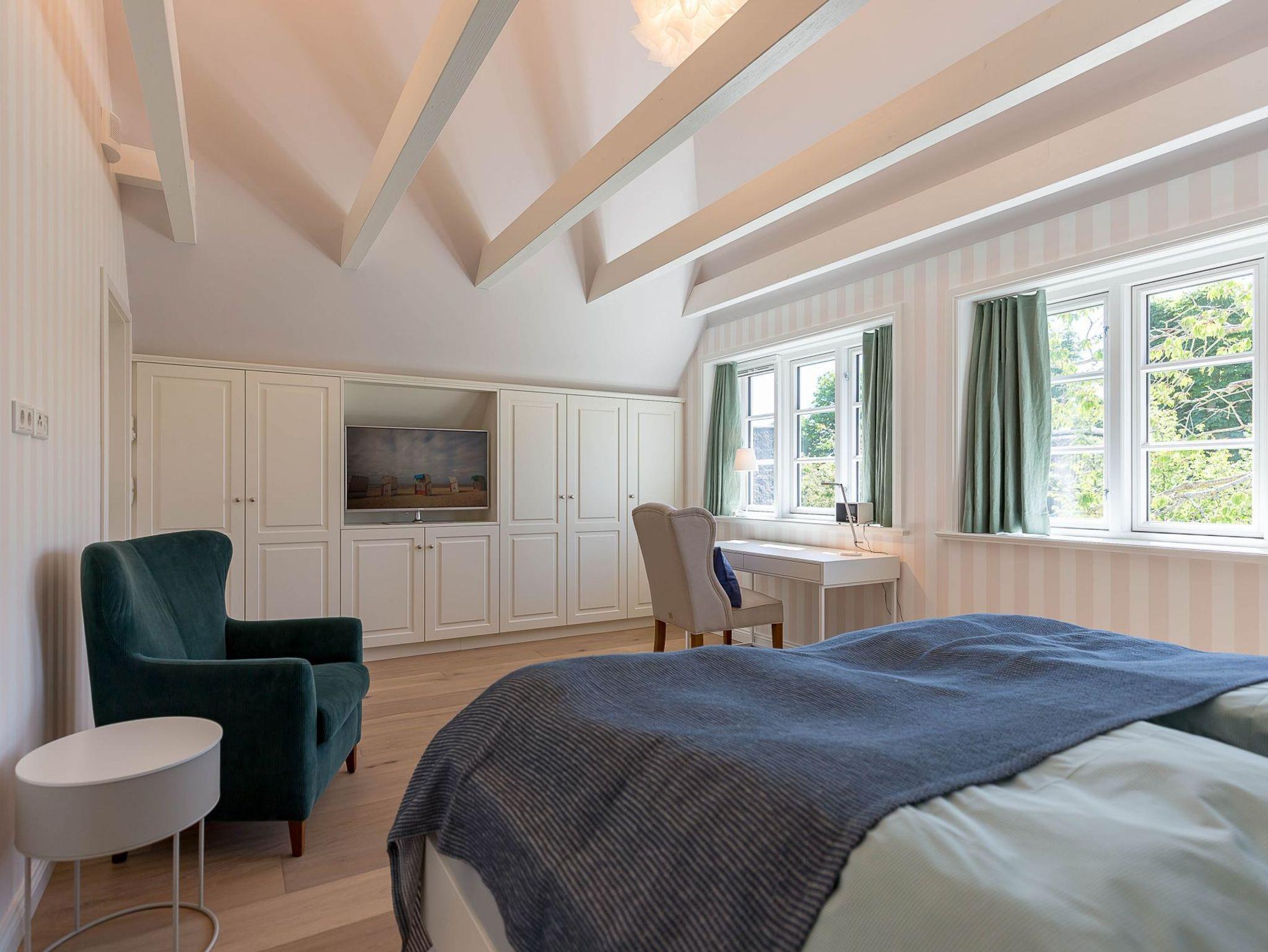 Im Obergeschoss finden Sie zwei weitere großzügige Schlafräume mit offener Kehlbalkendecke und en suite Bad. Beide Schlafräume sind ebenfalls jeweils mit einem TV und auch einem Schreibtisch ausgestattet. Ein Arbeitszimmer mit Alkoven ist einem Schlafzimmer vorgelagert. Die ebenfalls im Obergeschoss befindliche Sauna mit großer Walk-in-Dusche und Kneippgarnitur macht Ihren Wellnesstag zum Erlebnis.