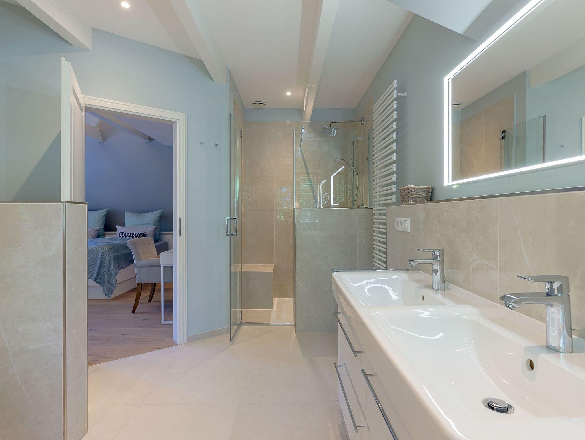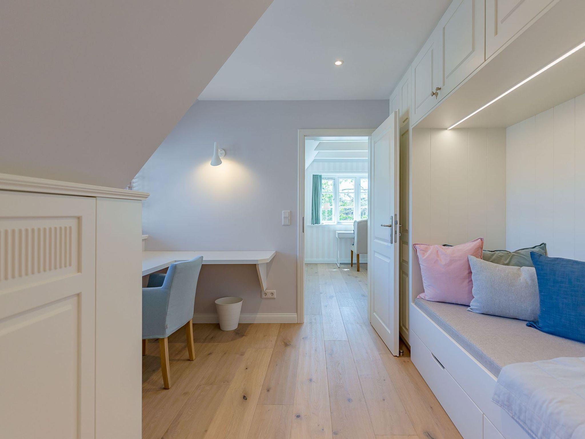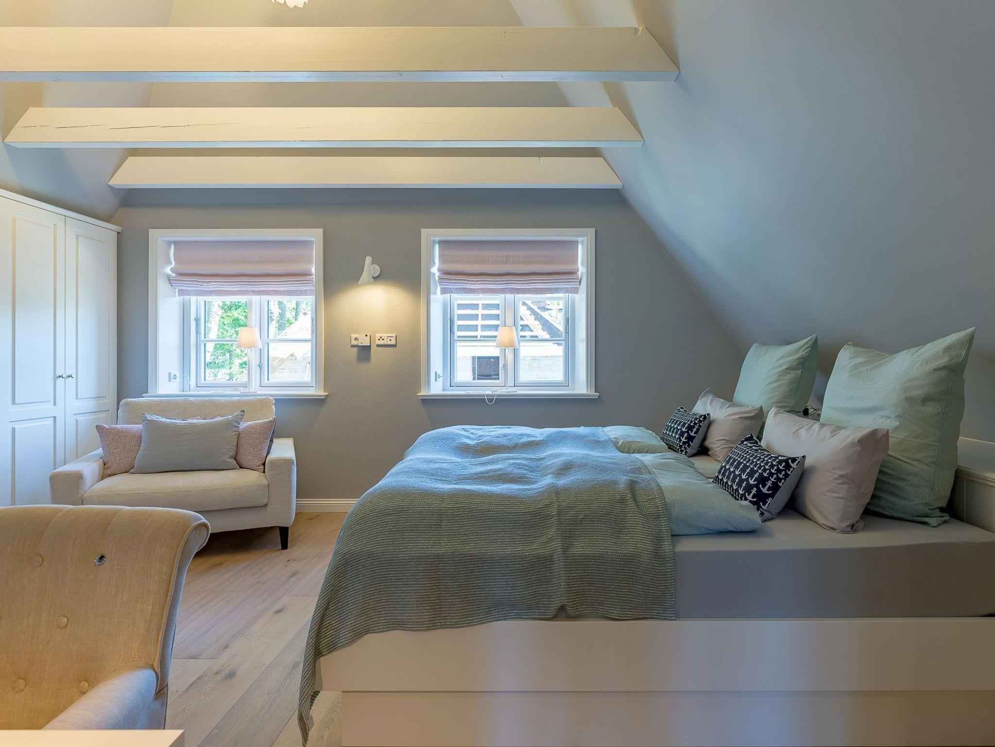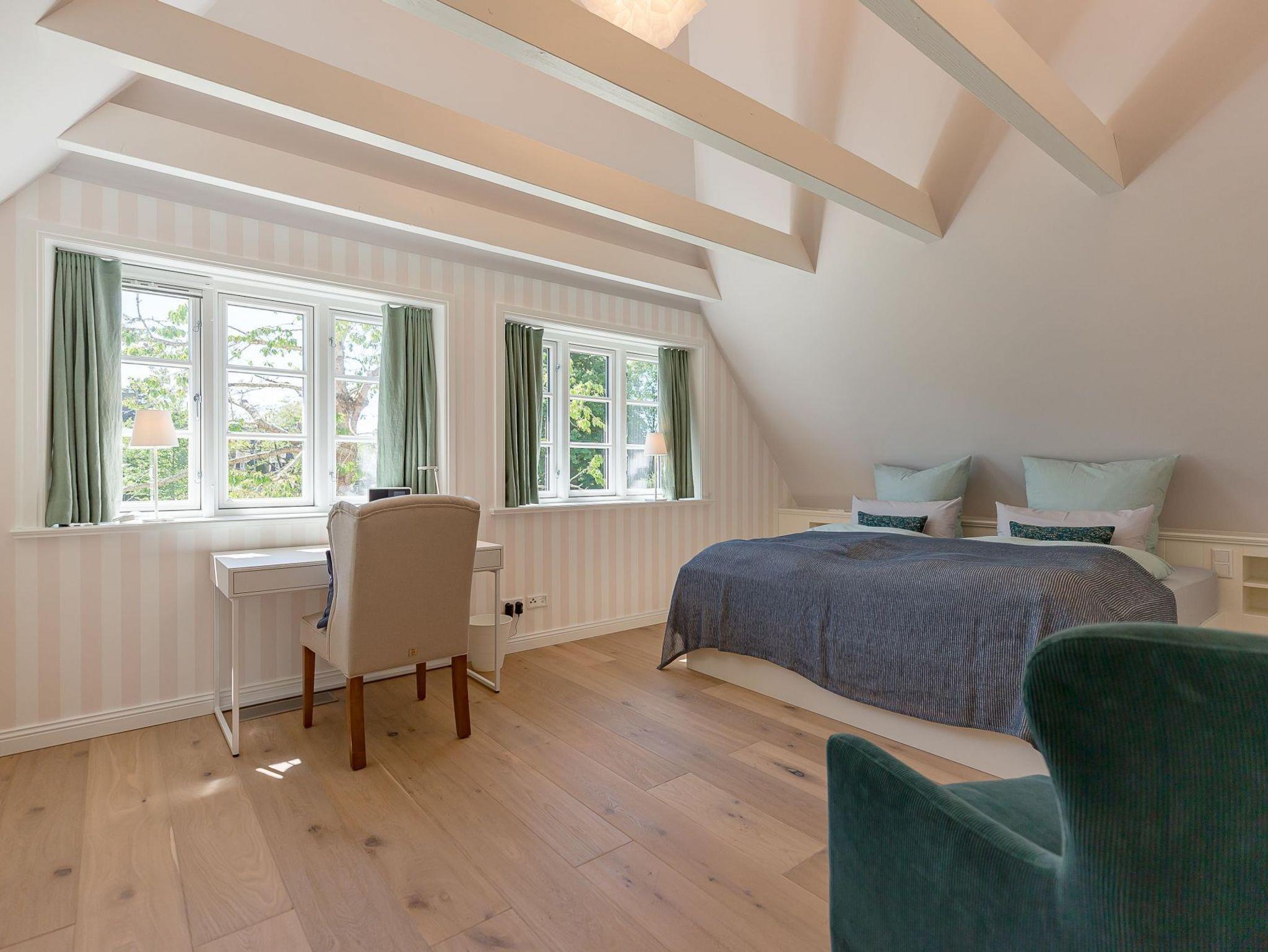 Im Obergeschoss finden Sie zwei weitere großzügige Schlafräume mit offener Kehlbalkendecke und en suite Bad. Beide Schlafräume sind ebenfalls jeweils mit einem TV und auch einem Schreibtisch ausgestattet. Ein Arbeitszimmer mit Alkoven ist einem Schlafzimmer vorgelagert. Die ebenfalls im Obergeschoss befindliche Sauna mit großer Walk-in-Dusche und Kneippgarnitur macht Ihren Wellnesstag zum Erlebnis.