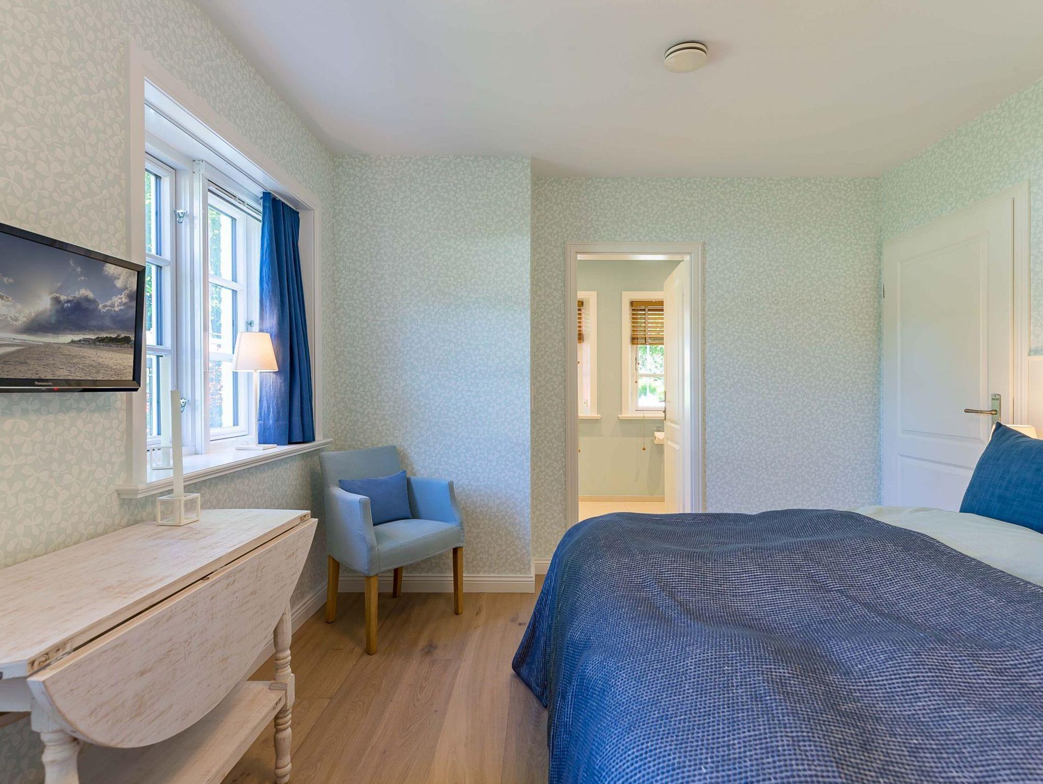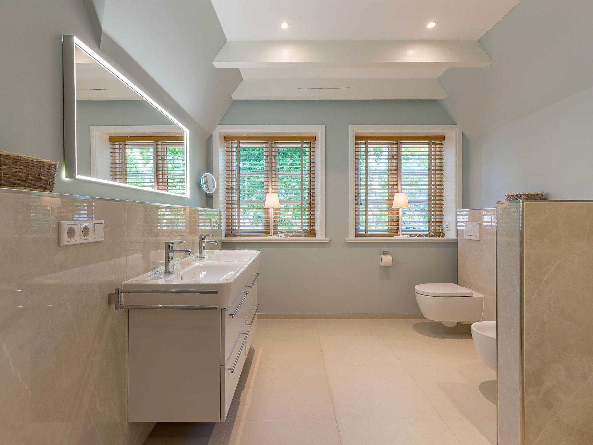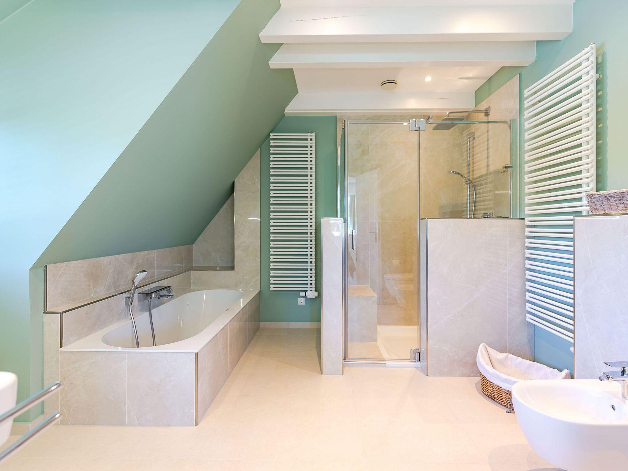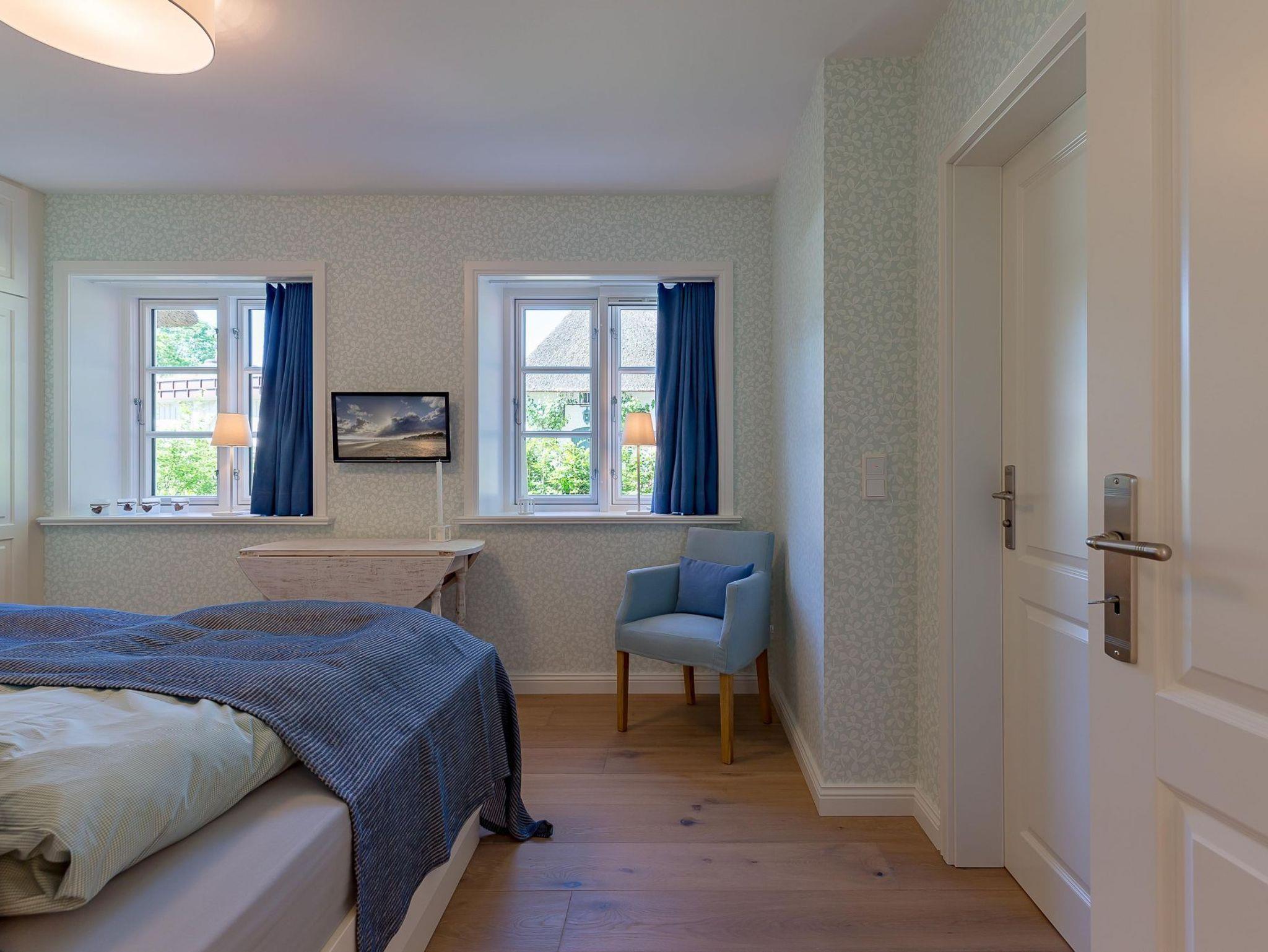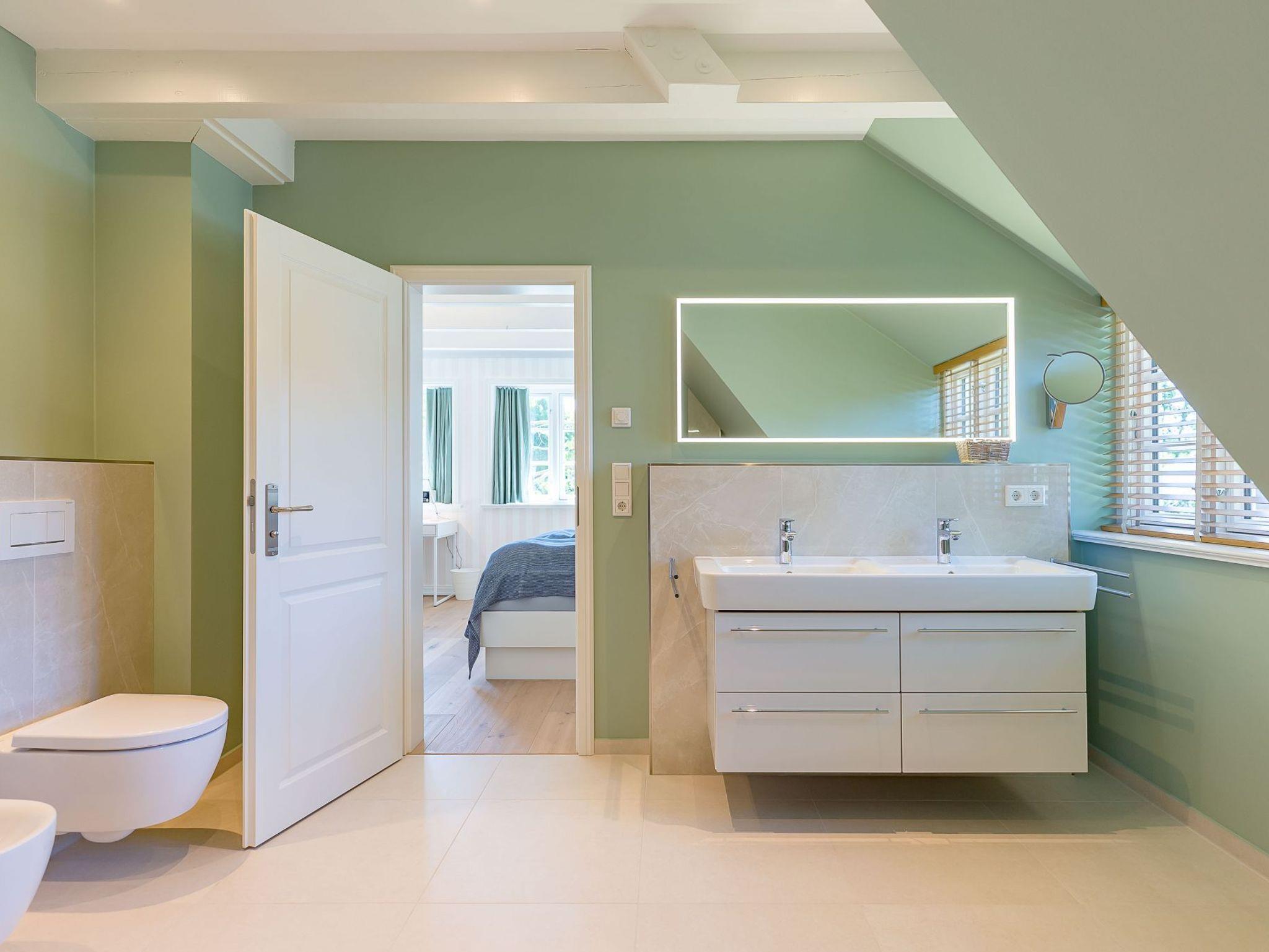 Im Obergeschoss finden Sie zwei weitere großzügige Schlafräume mit offener Kehlbalkendecke und en suite Bad. Beide Schlafräume sind ebenfalls jeweils mit einem TV und auch einem Schreibtisch ausgestattet. Ein Arbeitszimmer mit Alkoven ist einem Schlafzimmer vorgelagert. Die ebenfalls im Obergeschoss befindliche Sauna mit großer Walk-in-Dusche und Kneippgarnitur macht Ihren Wellnesstag zum Erlebnis.