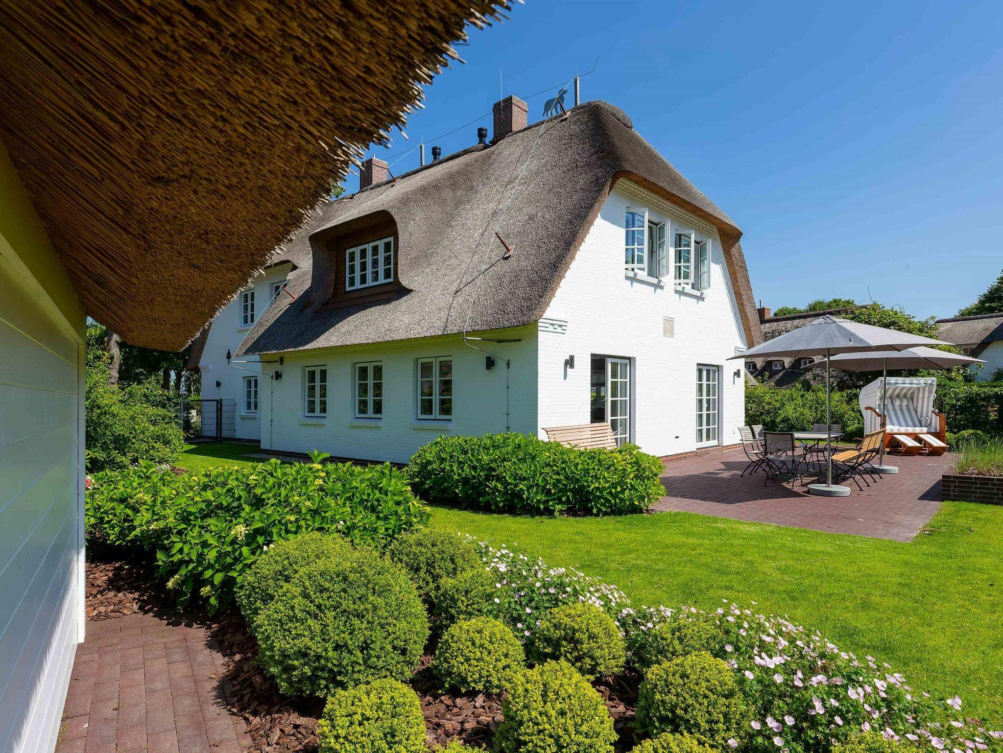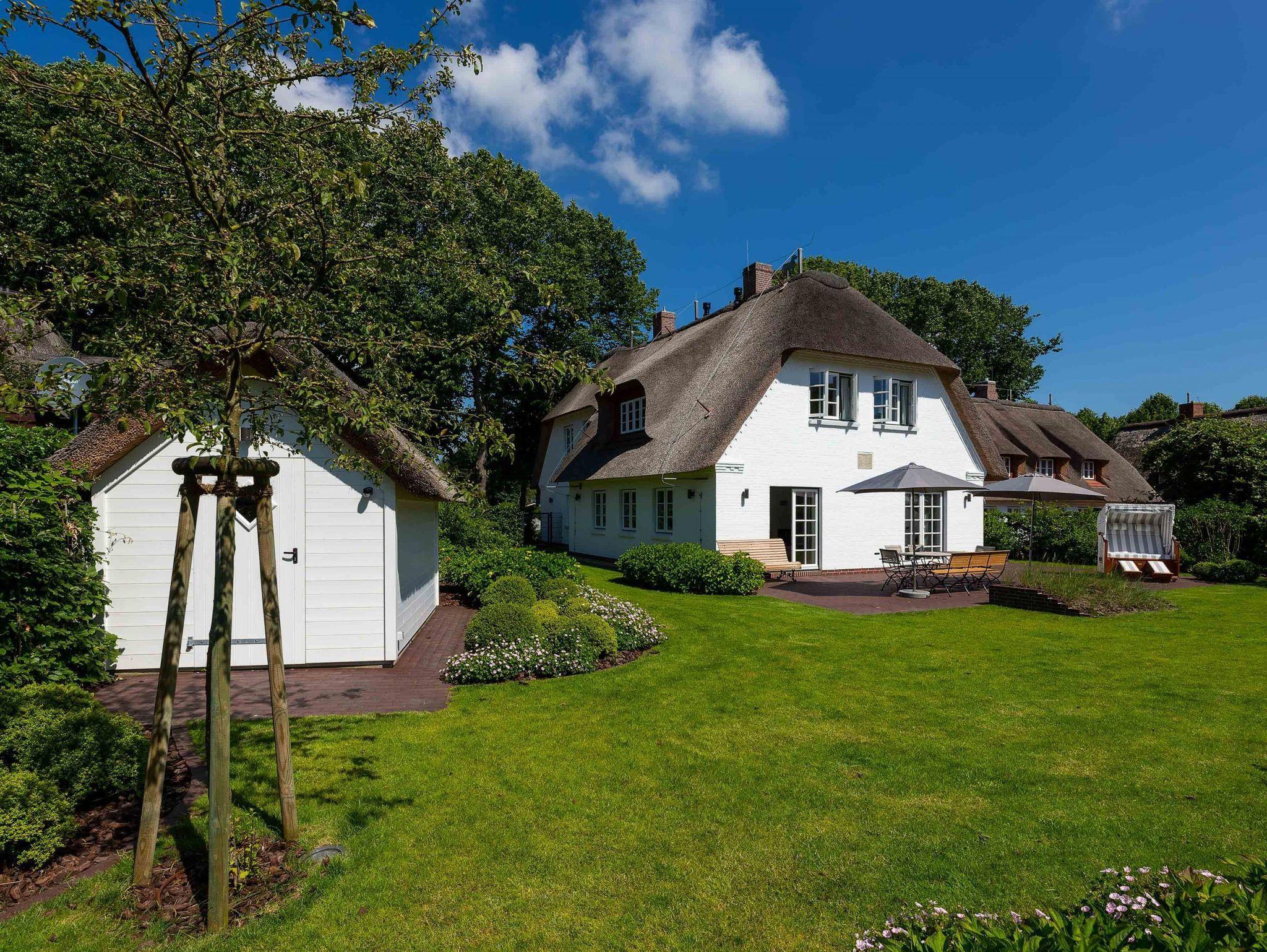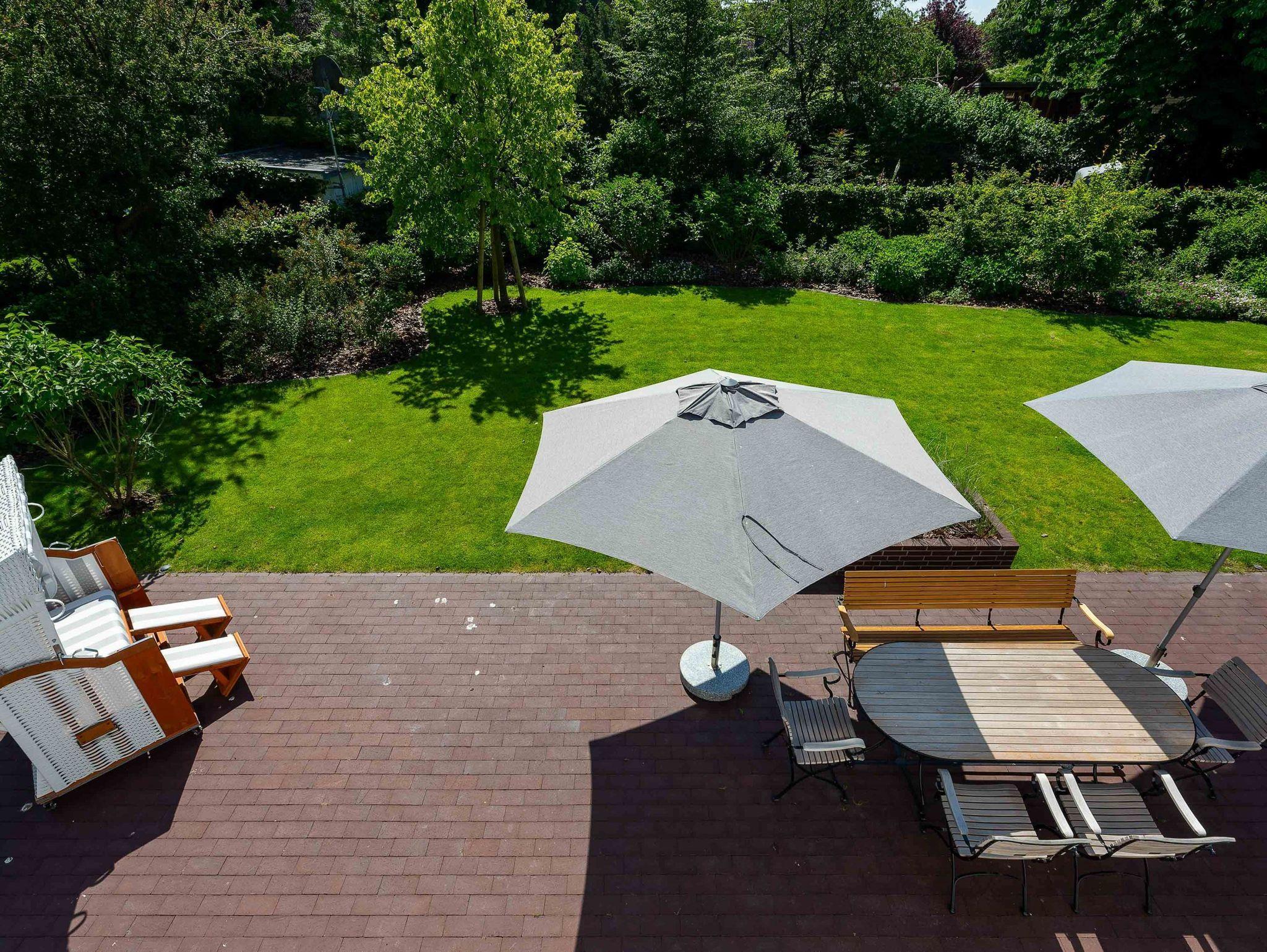 Das Haus ist ein echtes Schmuckstück und bietet abgewandt von der Straße im Südwesten einen großen eingefriedeten Garten mit umlaufender Frühstücks- und Sonnenterasse. Zum Entspannen stehen dort Bänke und andere Sitzgelegenheiten mit einem großen Gartentisch zur Verfügung. Der Strandkorb lädt zum herrlichen Sonnenbaden ein. Eine automatische Bewässerung, die nachts angesteuert wird, lässt die Pflanzen gedeihen.