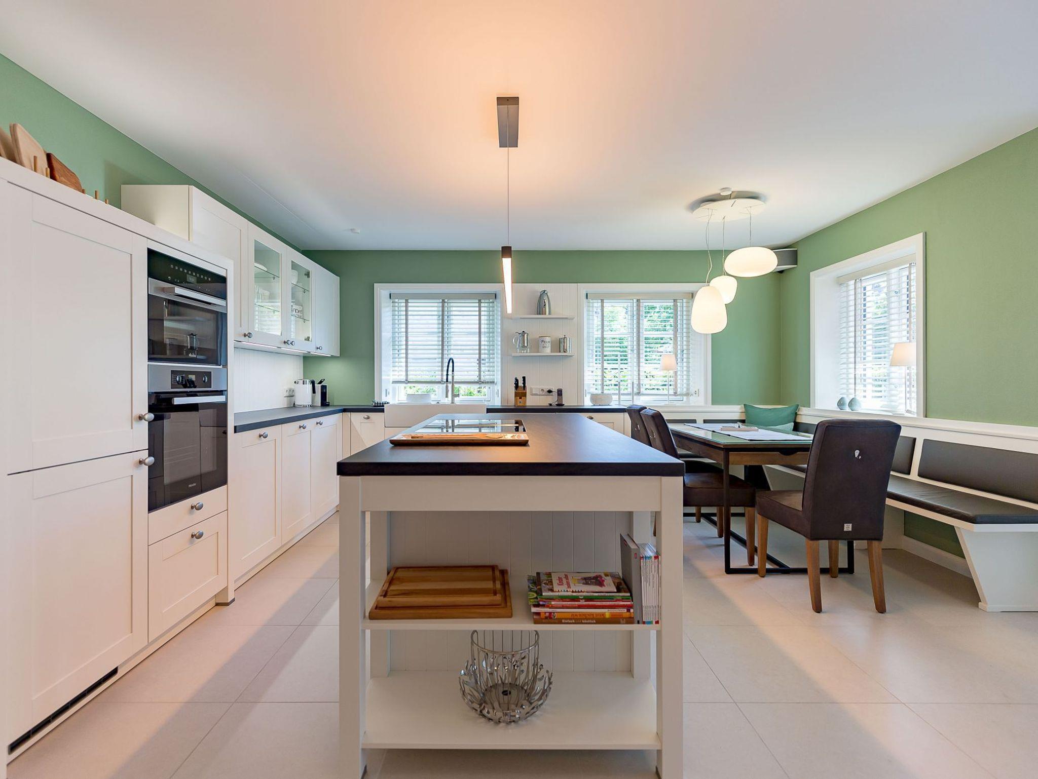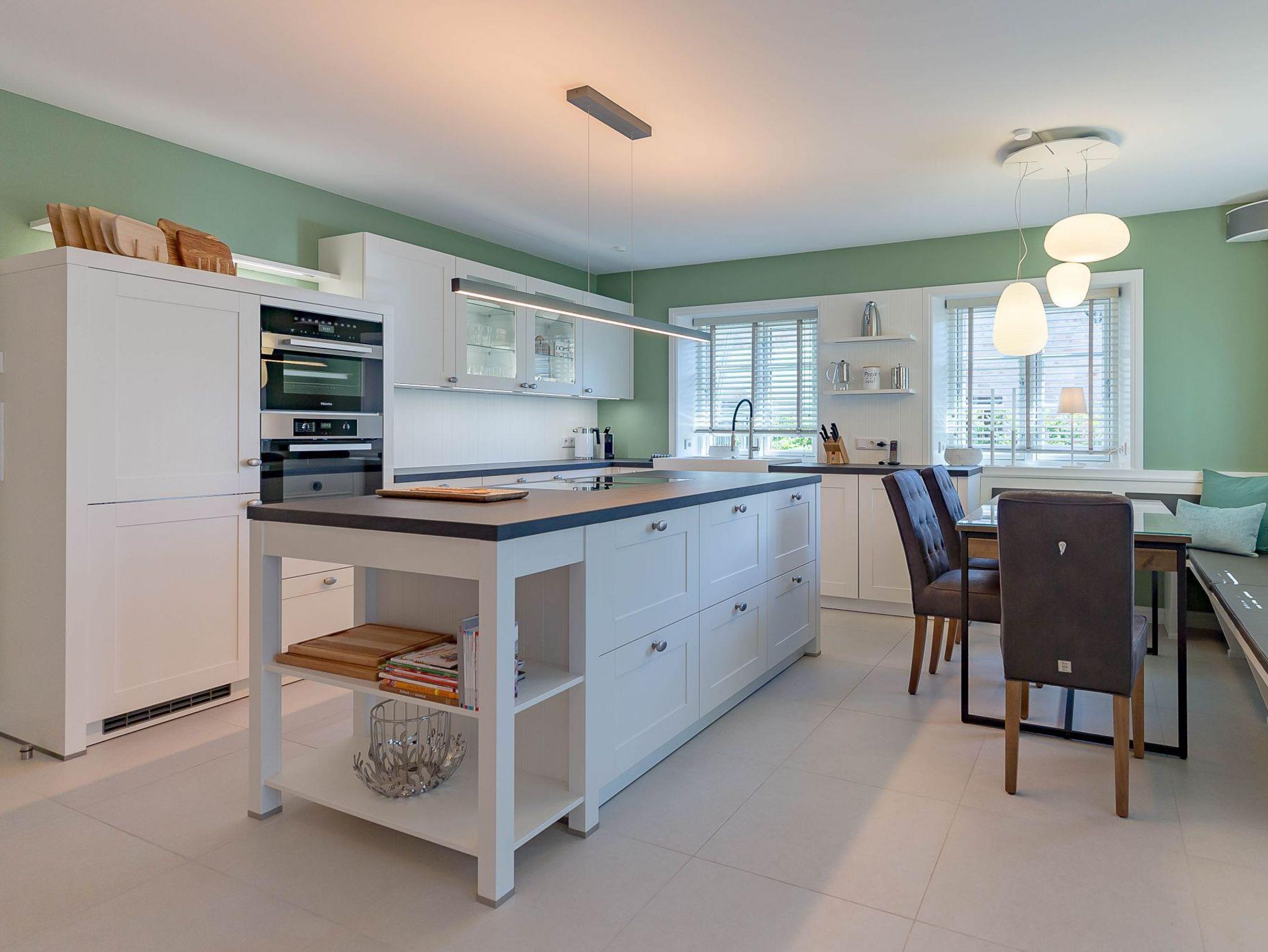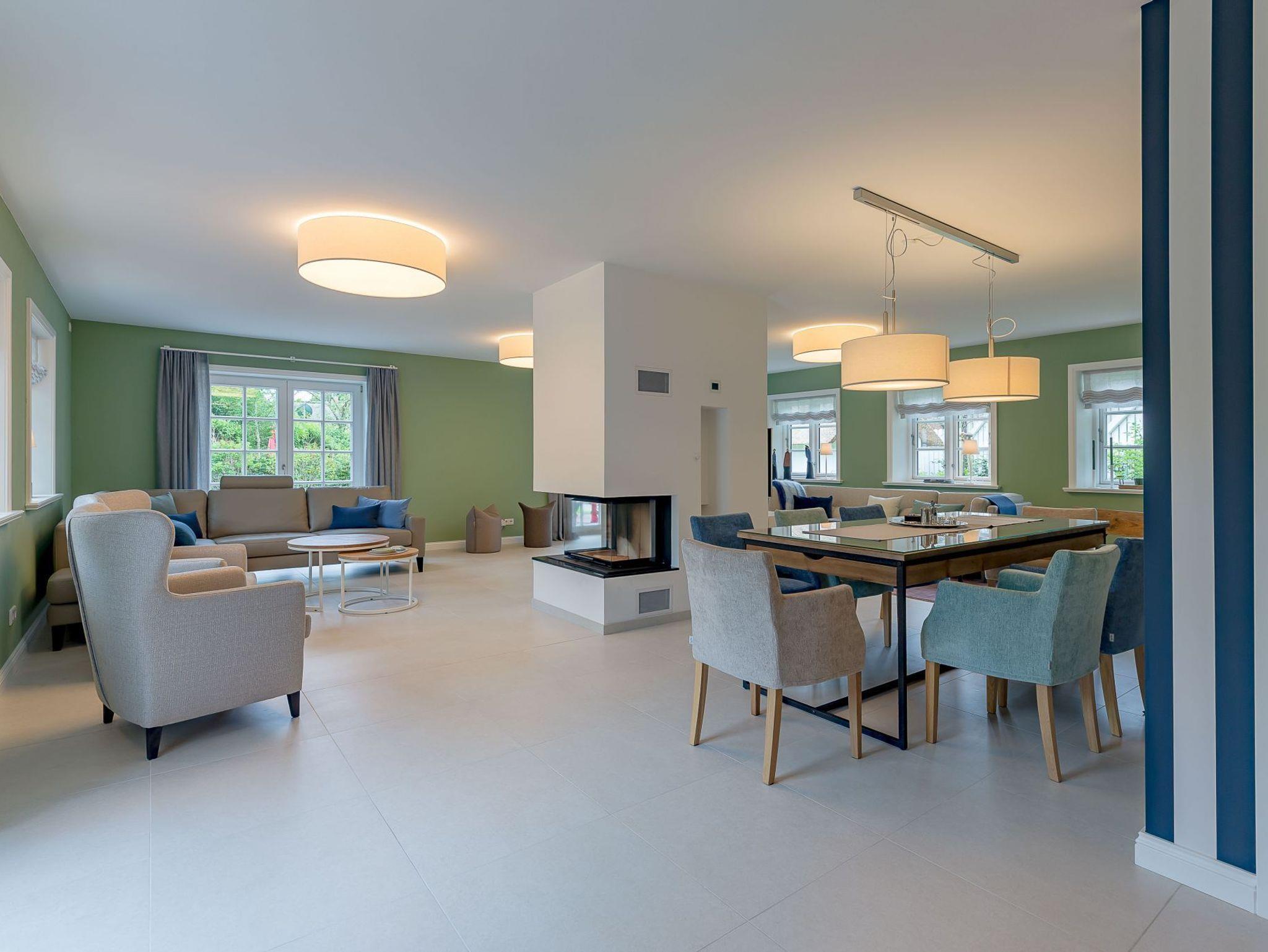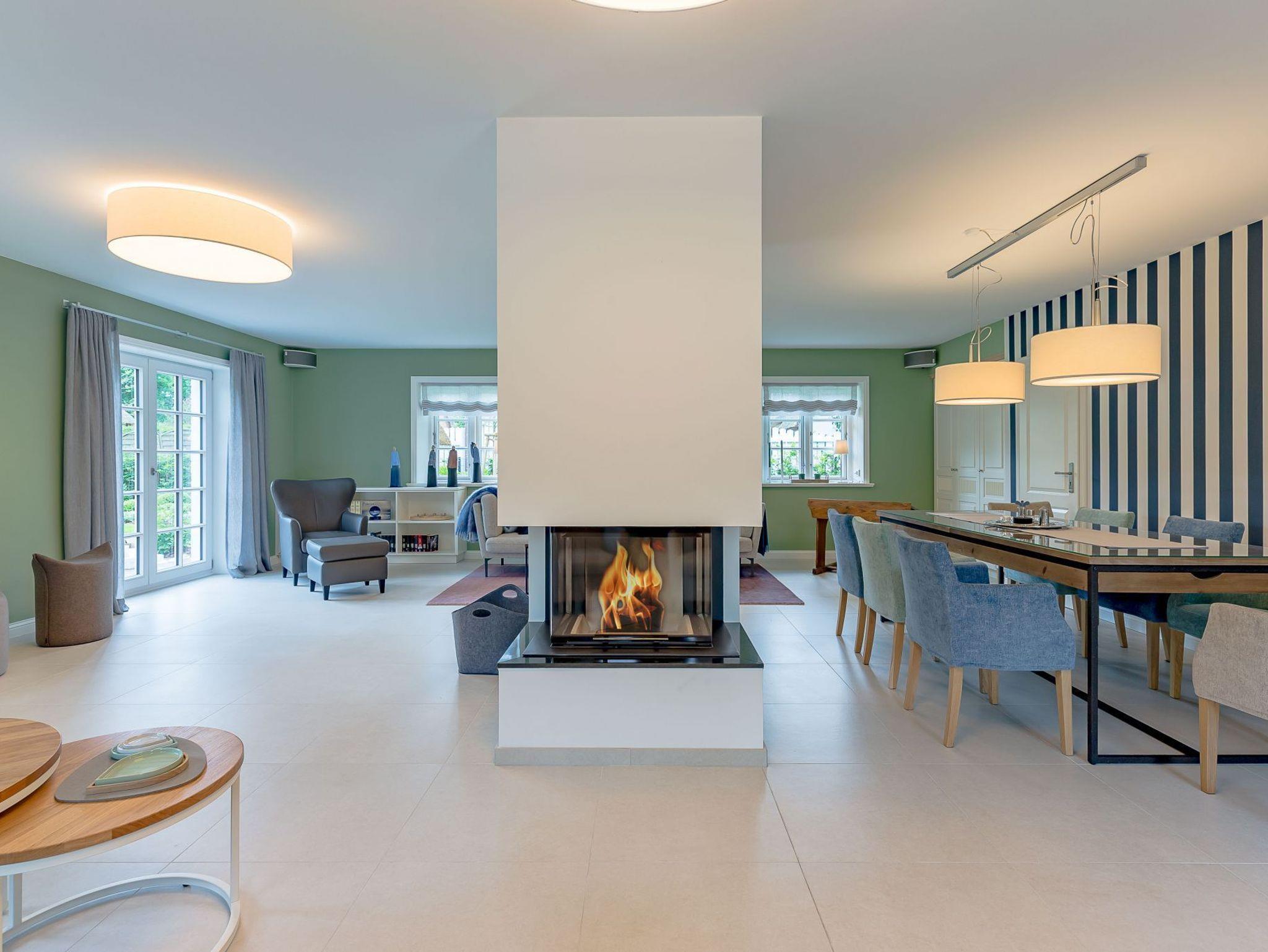 Auch im Haus wurde an alles gedacht, was den Aufenthalt angenehm und zum Erlebnis macht. Schon beim Betreten wirkt es beruhigend und einladend. Im Erdgeschoss befinden sich nicht nur ein Gäste-WC und ein Hauswirtschaftsraum mit Waschmaschine und Trockner, sondern auch ein Schlafzimmer mit en suite Bad, das keine Wünsche offen lässt. Die große, offene Wohnraumküche mit gemütlicher Übereckbank und Kochinsel bietet genügend Möglichkeiten, der Kreativität beim gemeinsamen Kochen freien Raum zu lassen. Sie ist mit den modernsten Küchenutensilien voll ausgestattet und hält ein Kochfeld mit Bora Abzugssystem bereit. Der dreiseitig offene Kamin bildet das Herzstück des Wohnzimmers. Hier kann man gemütlich mit seinen Liebsten an einem großen Esstisch speisen, oder auf einem großen Überecksofa mit zwei Sesseln das Kaminfeuer genießen. Ein Fernseher mit Soundanlage sowie eine Musikanlage runden das Angebot ab. Das lange und gemütliche Fernsehsofa lädt zu unterhaltsamen oder aber spannenden Abenden ein. Auch bei sportlichen Großereignissen finden hier alle ihren Platz.