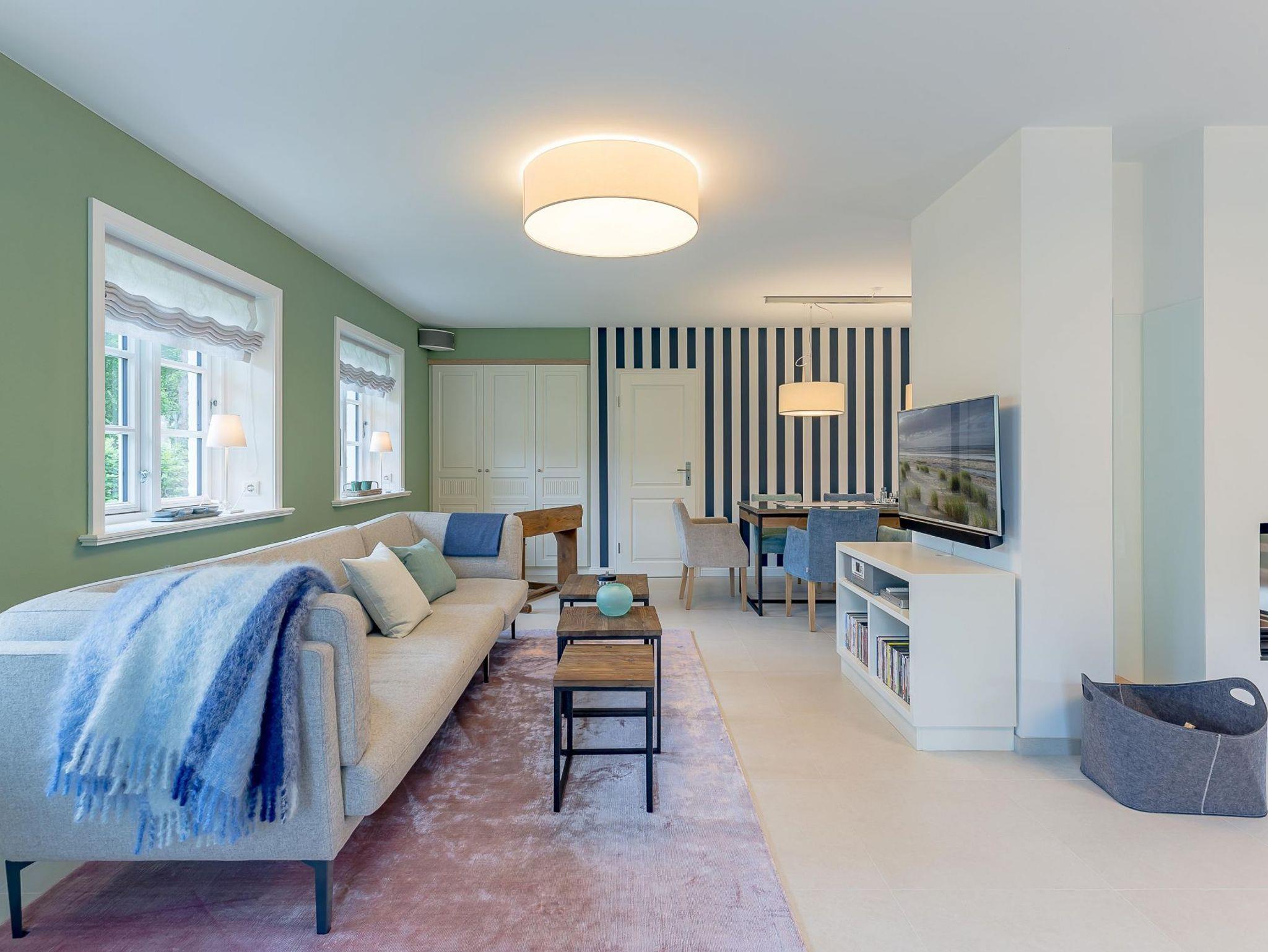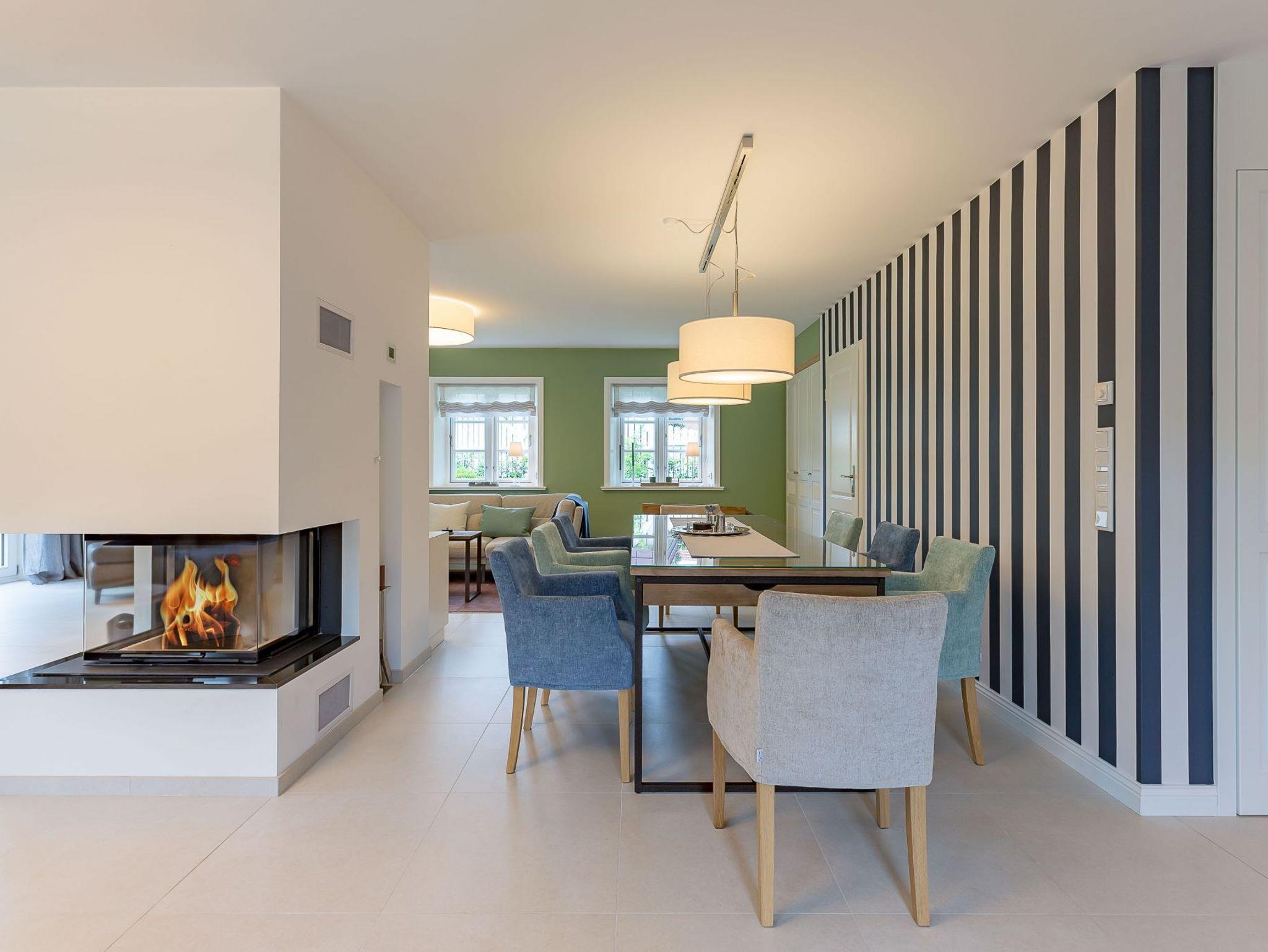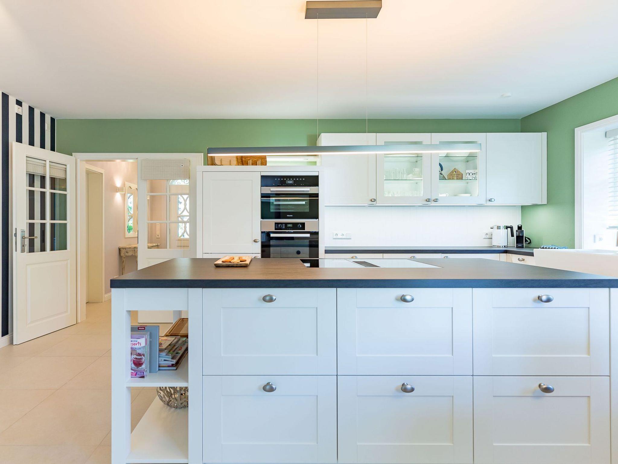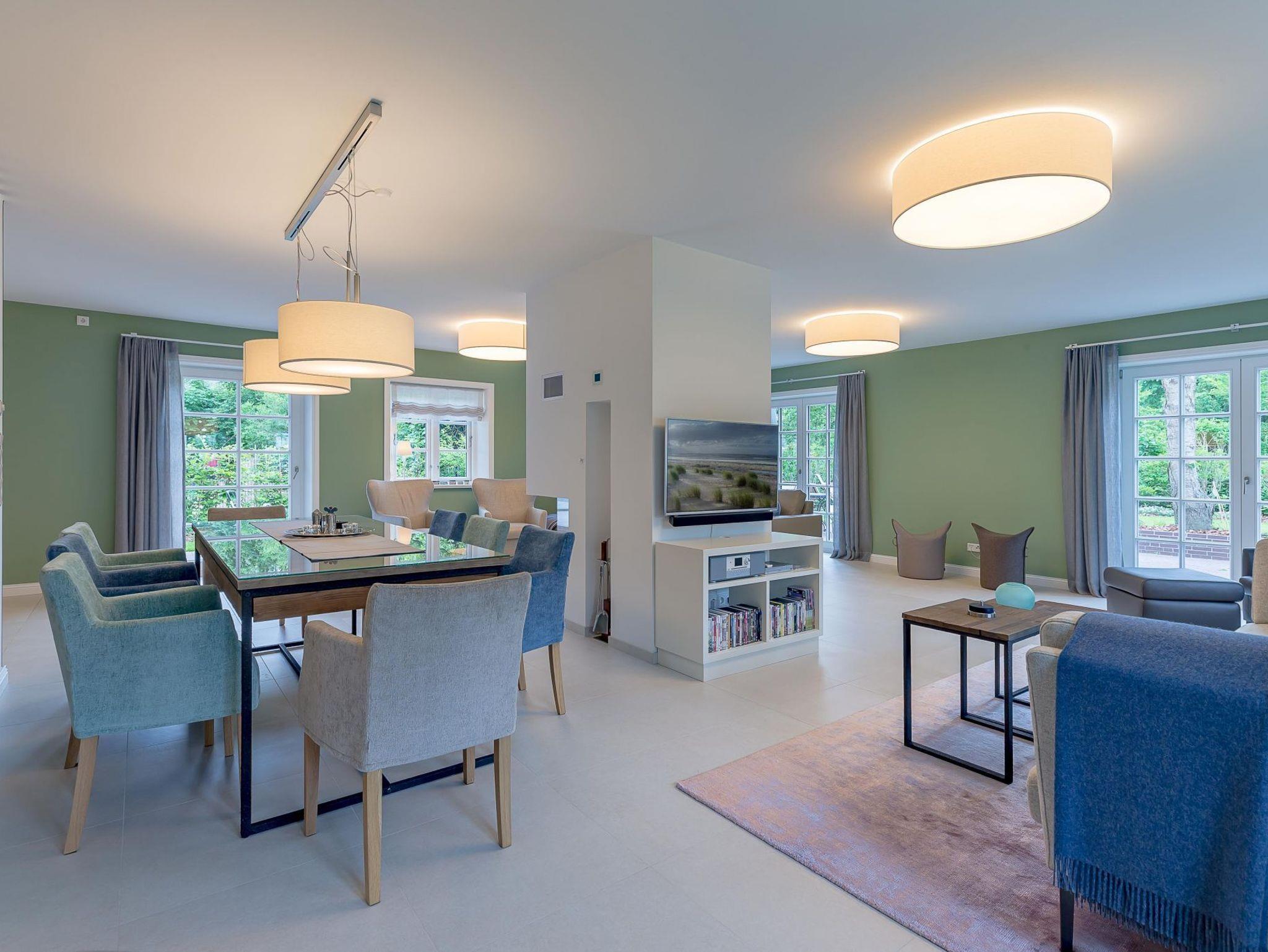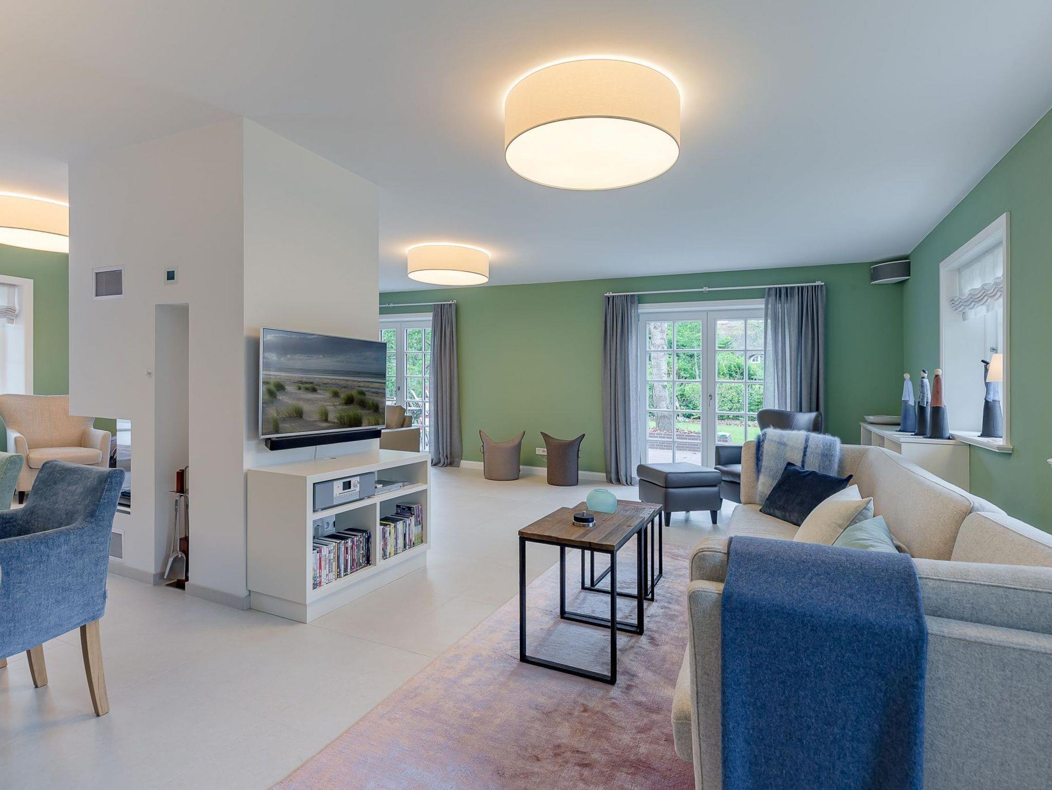Auch im Haus wurde an alles gedacht, was den Aufenthalt angenehm und zum Erlebnis macht. Schon beim Betreten wirkt es beruhigend und einladend. Im Erdgeschoss befinden sich nicht nur ein Gäste-WC und ein Hauswirtschaftsraum mit Waschmaschine und Trockner, sondern auch ein Schlafzimmer mit en suite Bad, das keine Wünsche offen lässt. Die große, offene Wohnraumküche mit gemütlicher Übereckbank und Kochinsel bietet genügend Möglichkeiten, der Kreativität beim gemeinsamen Kochen freien Raum zu lassen. Sie ist mit den modernsten Küchenutensilien voll ausgestattet und hält ein Kochfeld mit Bora Abzugssystem bereit. Der dreiseitig offene Kamin bildet das Herzstück des Wohnzimmers. Hier kann man gemütlich mit seinen Liebsten an einem großen Esstisch speisen, oder auf einem großen Überecksofa mit zwei Sesseln das Kaminfeuer genießen. Ein Fernseher mit Soundanlage sowie eine Musikanlage runden das Angebot ab. Das lange und gemütliche Fernsehsofa lädt zu unterhaltsamen oder aber spannenden Abenden ein. Auch bei sportlichen Großereignissen finden hier alle ihren Platz.