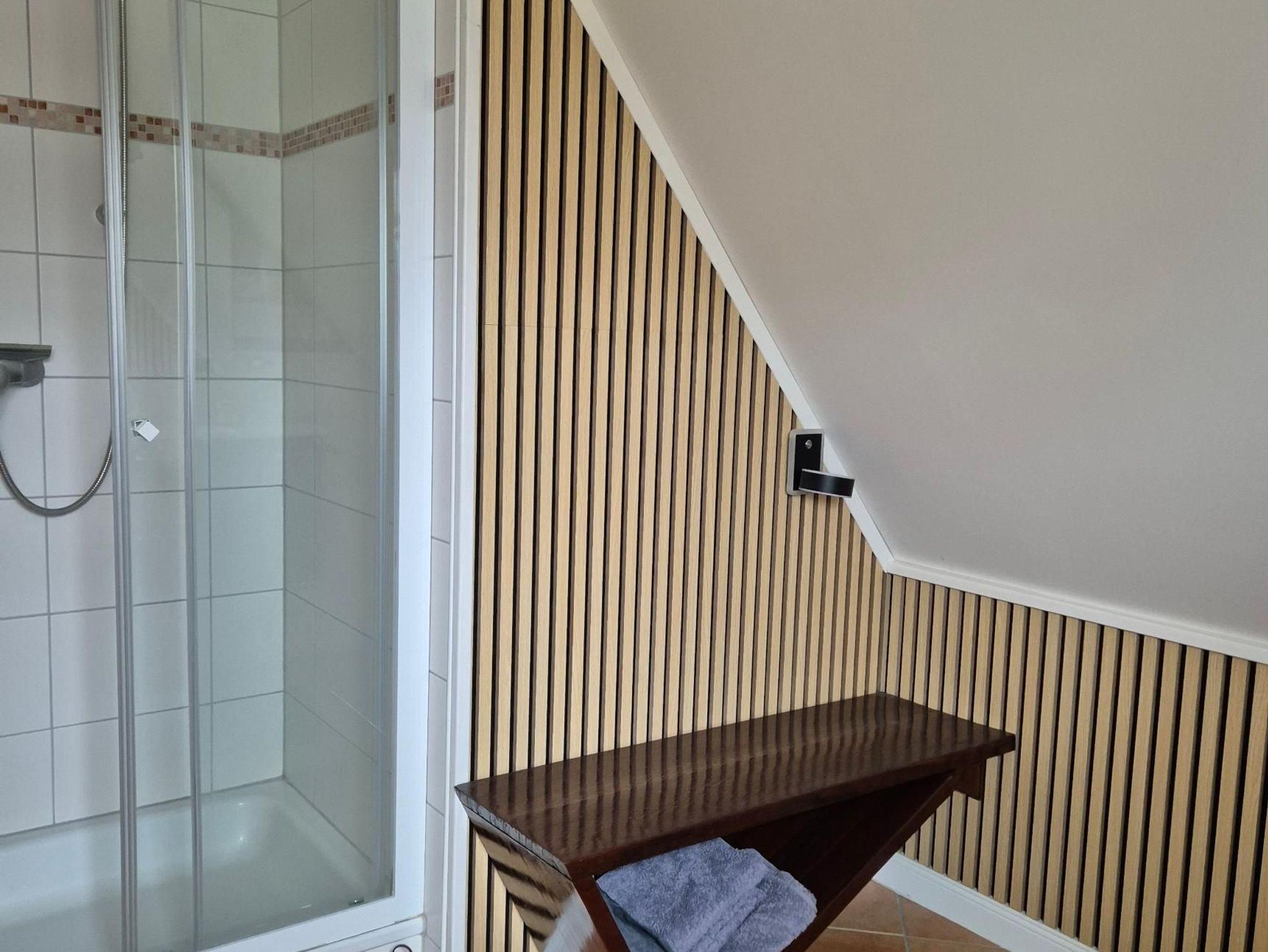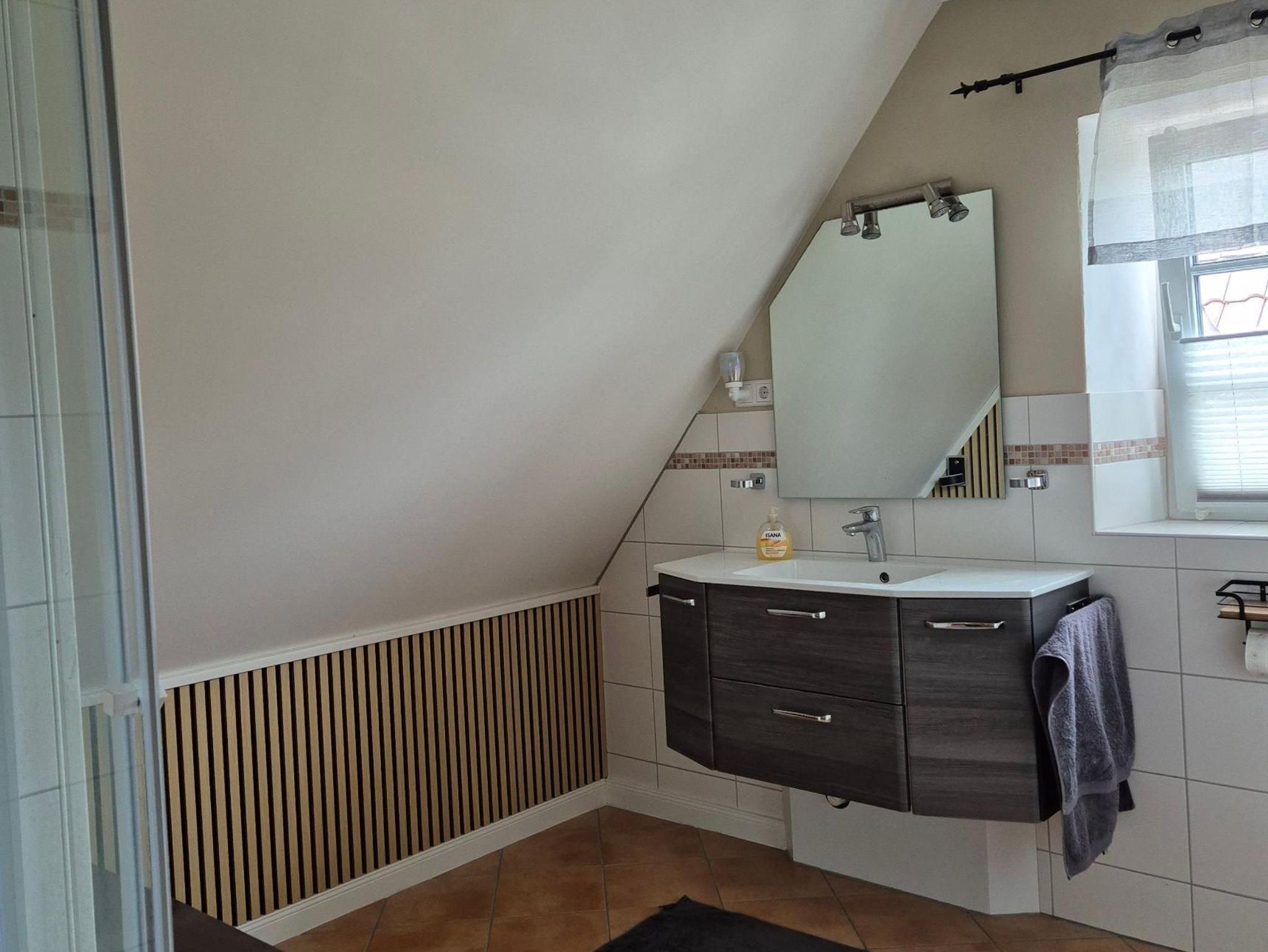 Sanitär: bodenebene Dusche, Föhn, Handtuchheizkörper.