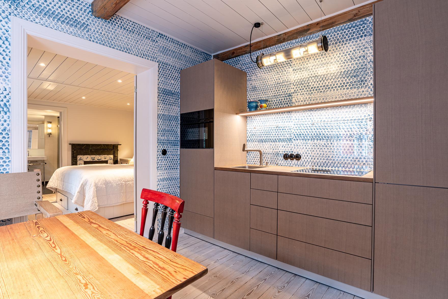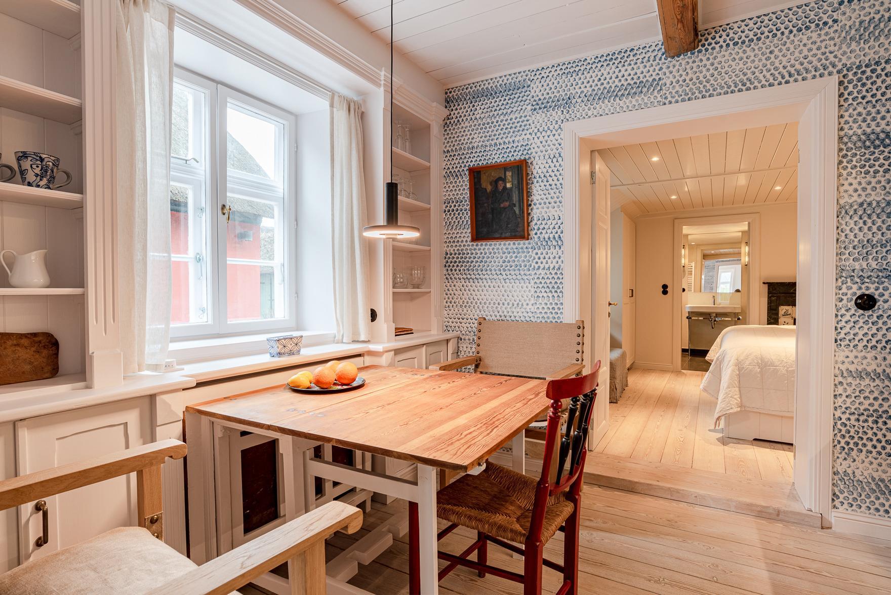 Die kleinere Sönnes Stuuv mit 60qm wird durch den alten Haupteingang des Hauses betreten. Dem großzügigen Eingangsbereich schließt sich das mit bequemen Sitzmöbeln ausgestattete Wohnzimmer an. In der vollausgestatteten Küche bietet sich der Küchentisch zum ausgiebigen Speisen, Zeitung lesen, langen Gesprächen an. Das Schlafzimmer ist mit einem großen äußerst bequemen Bett und viel Stauraum ausgestattet. Daran anschließend befindet sich das geräumige, moderne Bad, von dem aus sich eine Blickachse durch die gesamte Wohnung , durch das Fenster über Hunderte von Metern in die Allee vor dem Haus eröffnet. Hervorzuheben ist auch hier die stilsichere Ausstattung sowie wiederum Gemälde des Nieblumer Malers Fritz Chors (1884 - 1962). Zum Verweilen lädt auch eine Sitzecke vor dem Haus ein.