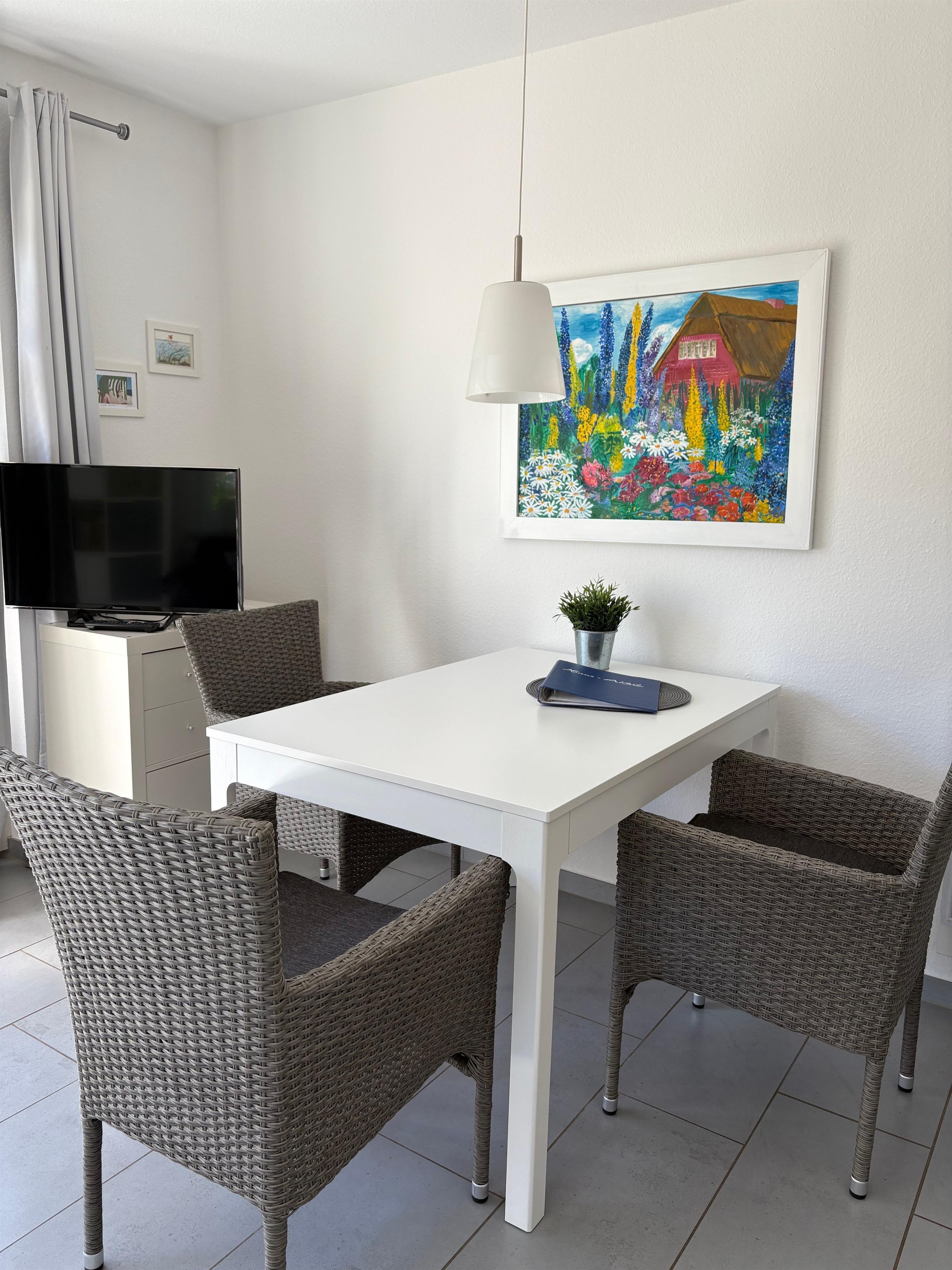 Neben dem offenen Wohn- und Essbereich mit direktem Zugang zur eigenen Südterrasse mit Strandkorb und Terrassenmöbeln, erwartet Sie das separate Schlafzimmer mit Doppelbett (1,60m x 2,00m), ein Bad mit Dusche/WC und ein extra Lesezimmer für die ganz ruhigen Momente.