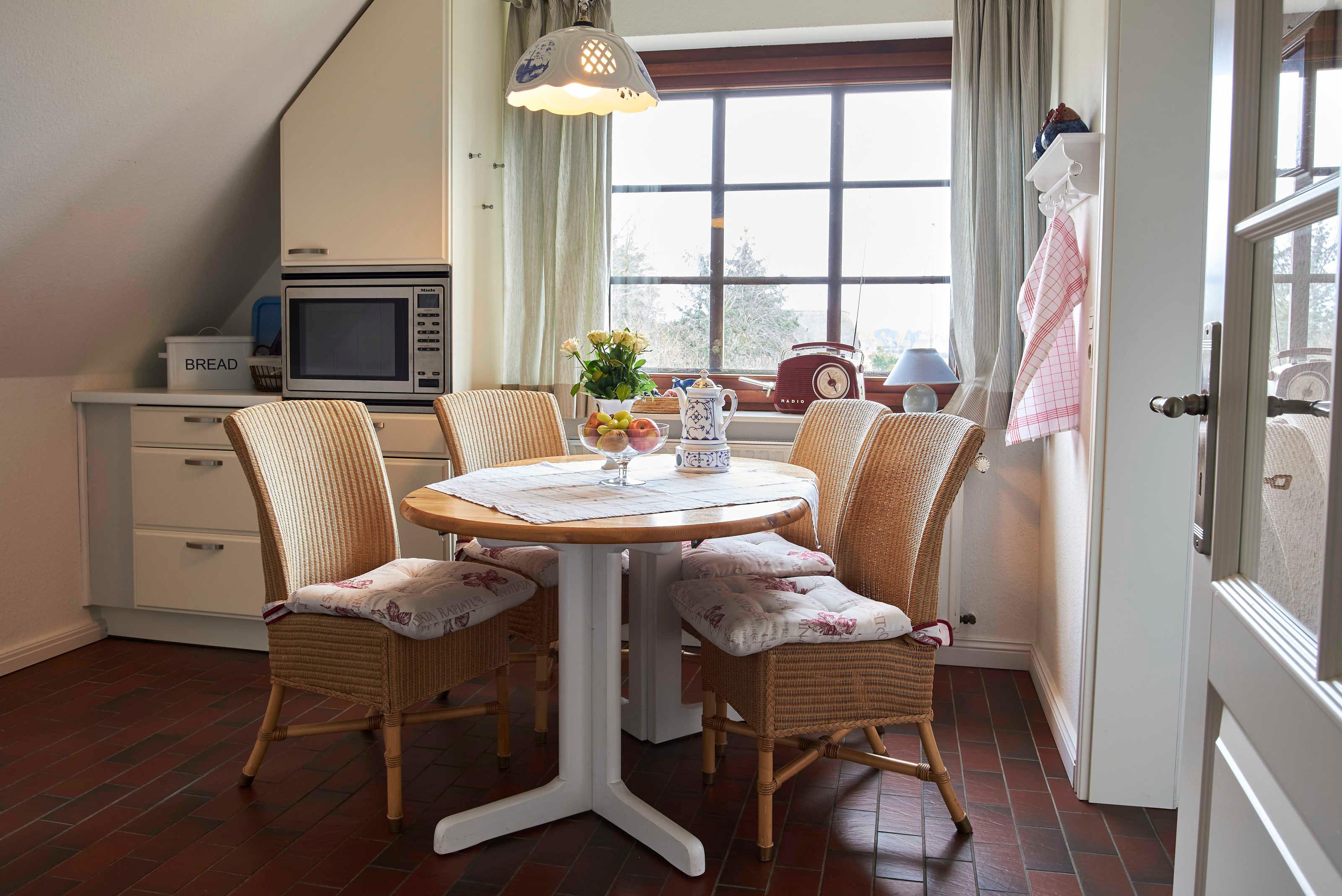 Die großzügige Küche mit separatem Essbereich ist ausgestattet mit einem Ceranfkochfeld, Backofen, Mikrowelle, Geschirrspüler Kaffeemaschine, Wasserkocher usw.