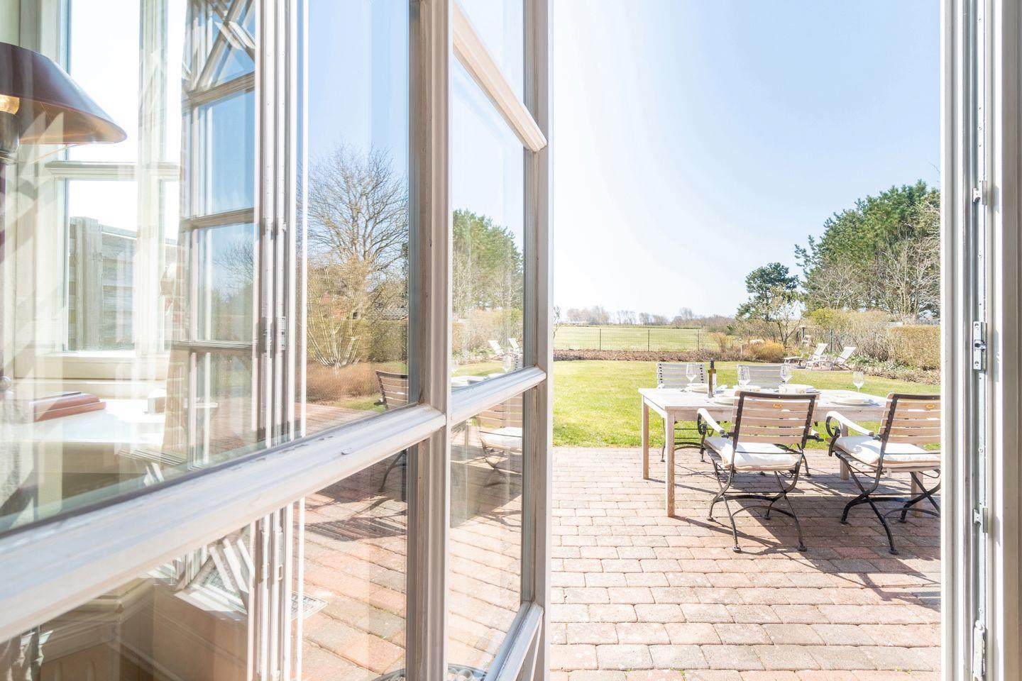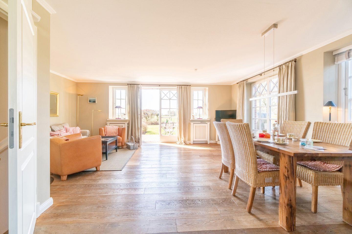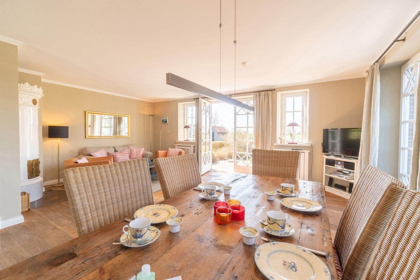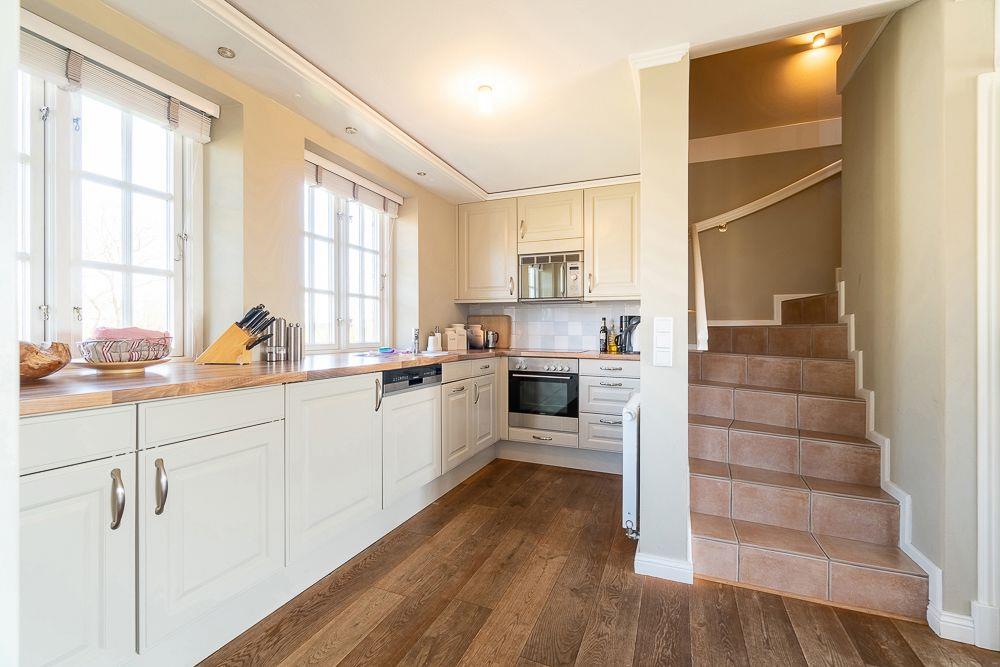 Im Erdgeschoss befindet sich das großzügige, lichtdurchflutete Wohn- und Esszimmer mit offener Küche. Von hier aus gelangen Sie direkt auf die eigene Terrasse mit Strandkorb und in den Garten. Der Original Mylin-Kachelofen im Wohnbereich sorgt auch an kühleren Tagen für eine angenehme Atmosphäre.