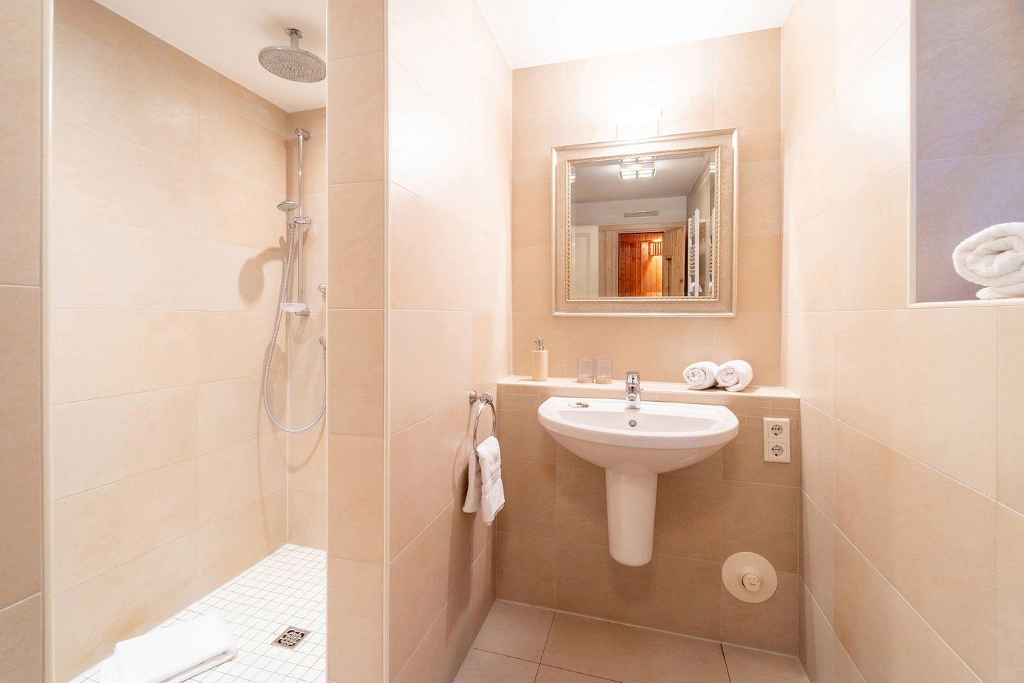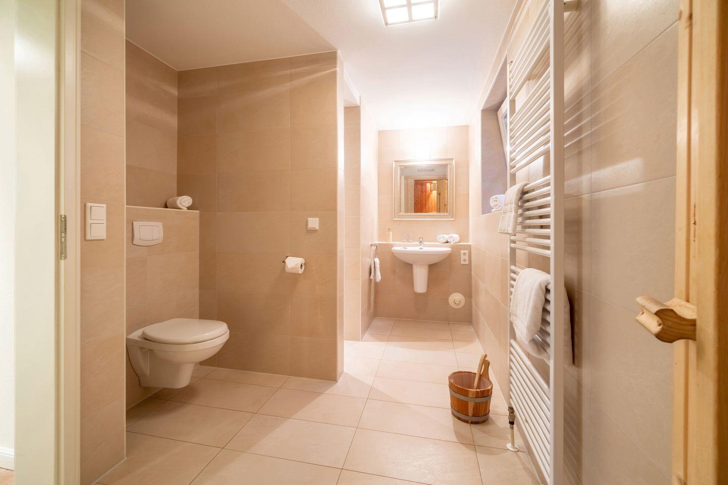 Im Souterrain finden Sie das zweite Duschbad mit einer bodengleiche Regendusche sowie die hauseigene Sauna vor. Zudem befindet sich in dieser Etage ein Hauswirtschaftsraum mit Waschmaschine und Trockner.
