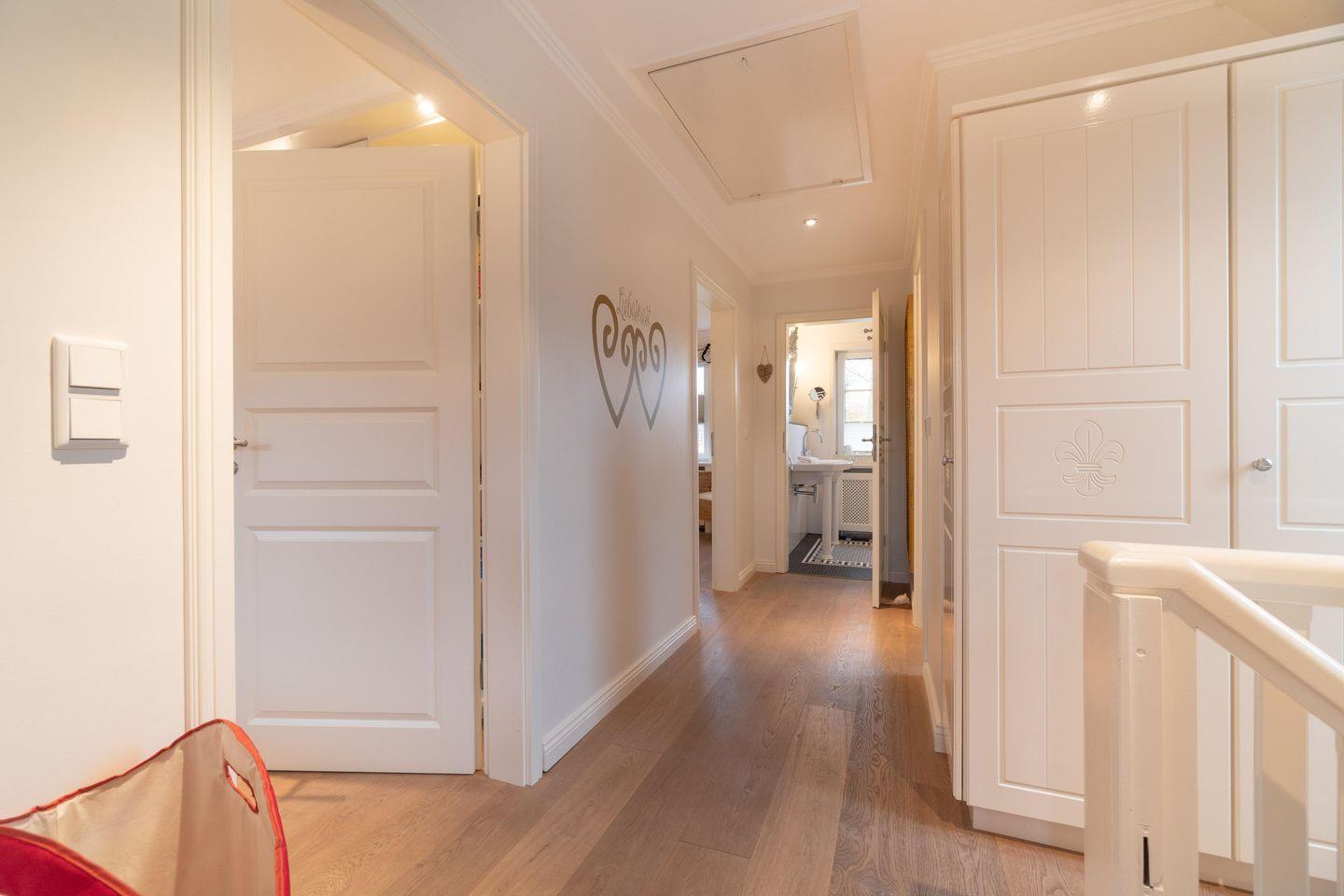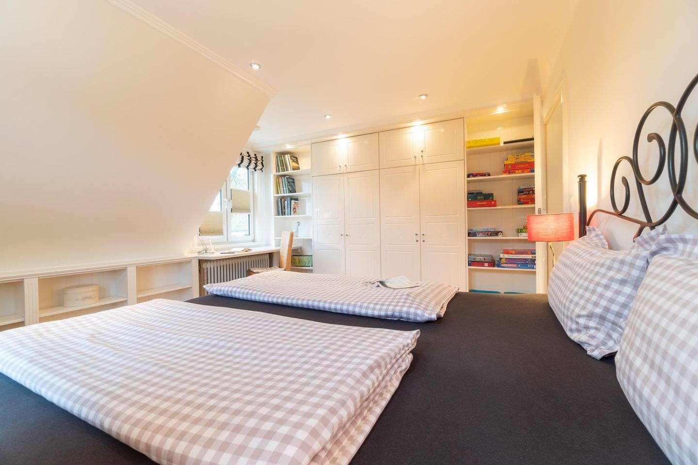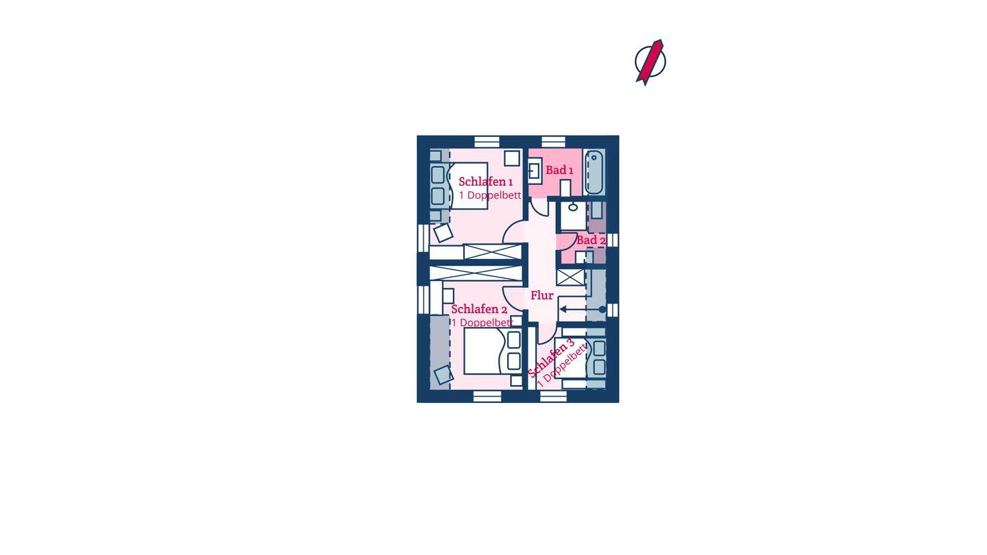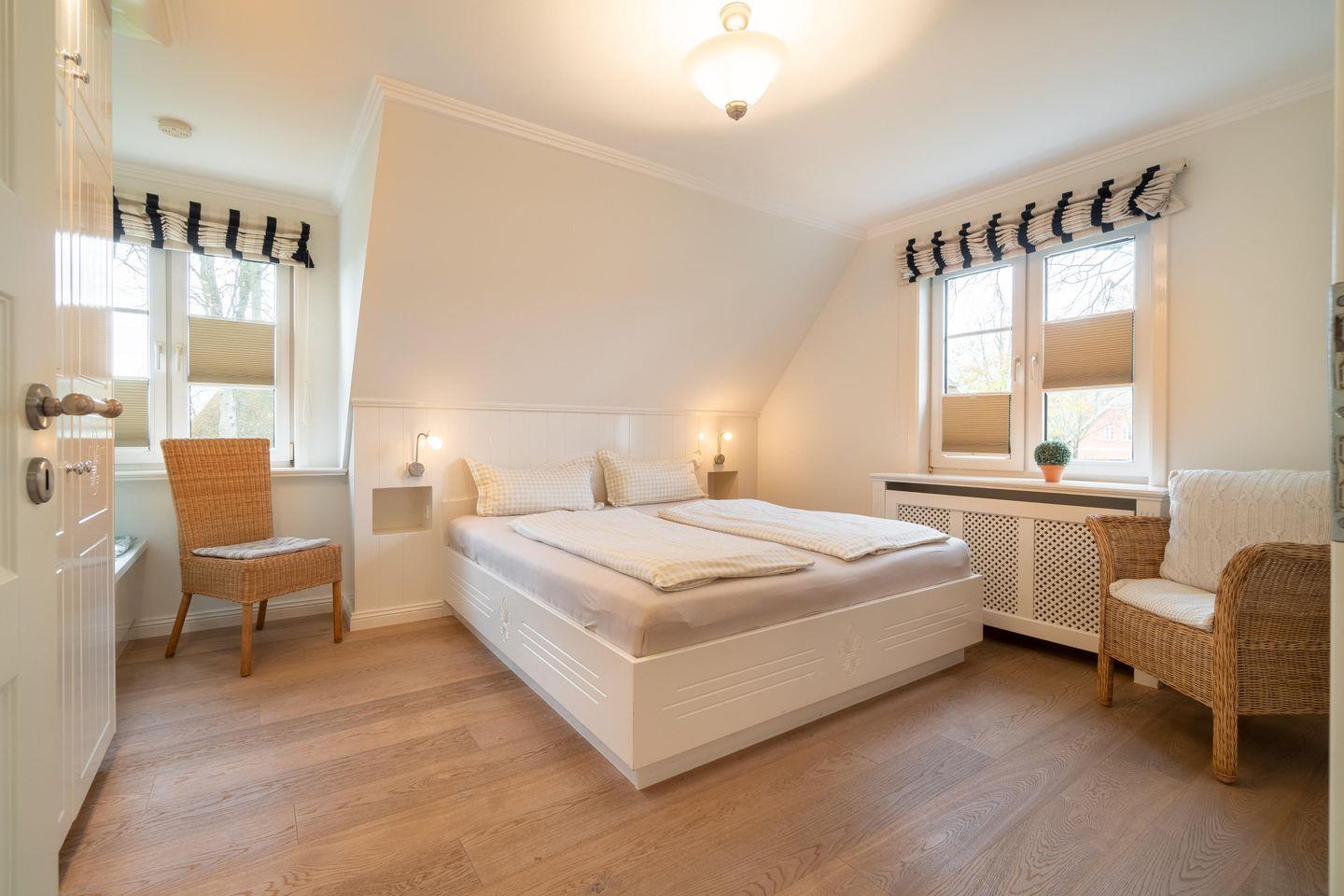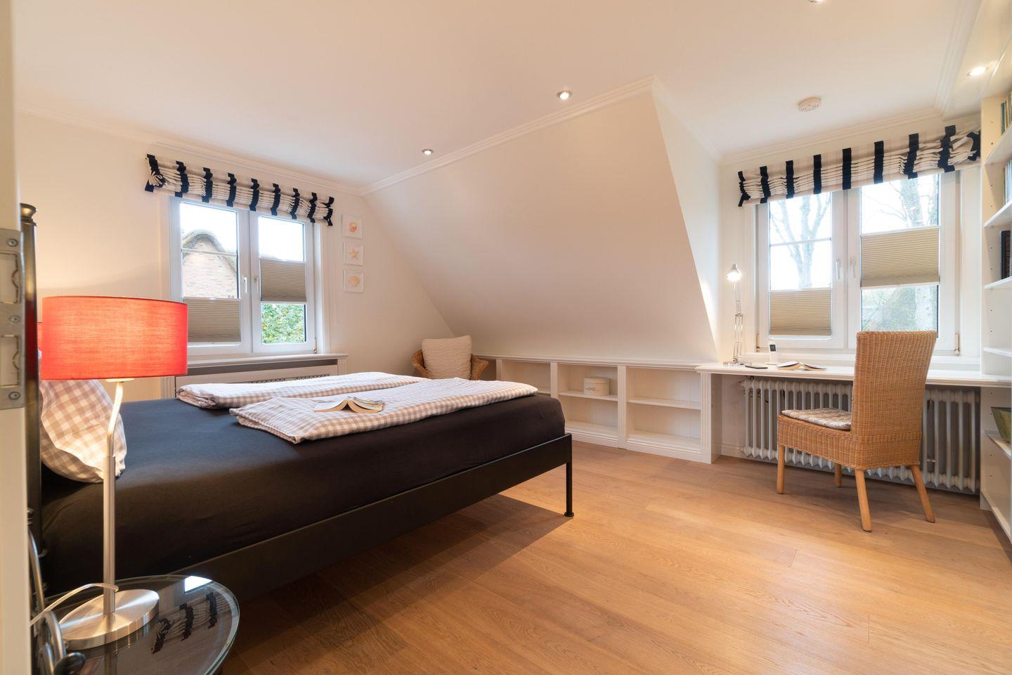 Im Obergeschoss sind die drei Schlafzimmer - jeweils mit 1 Doppelbett ausgestattet -, das zweite Duschbad und ein Wannenbad gelegen. Eines der Schlafzimmer verfügt über einen Schreibtisch.