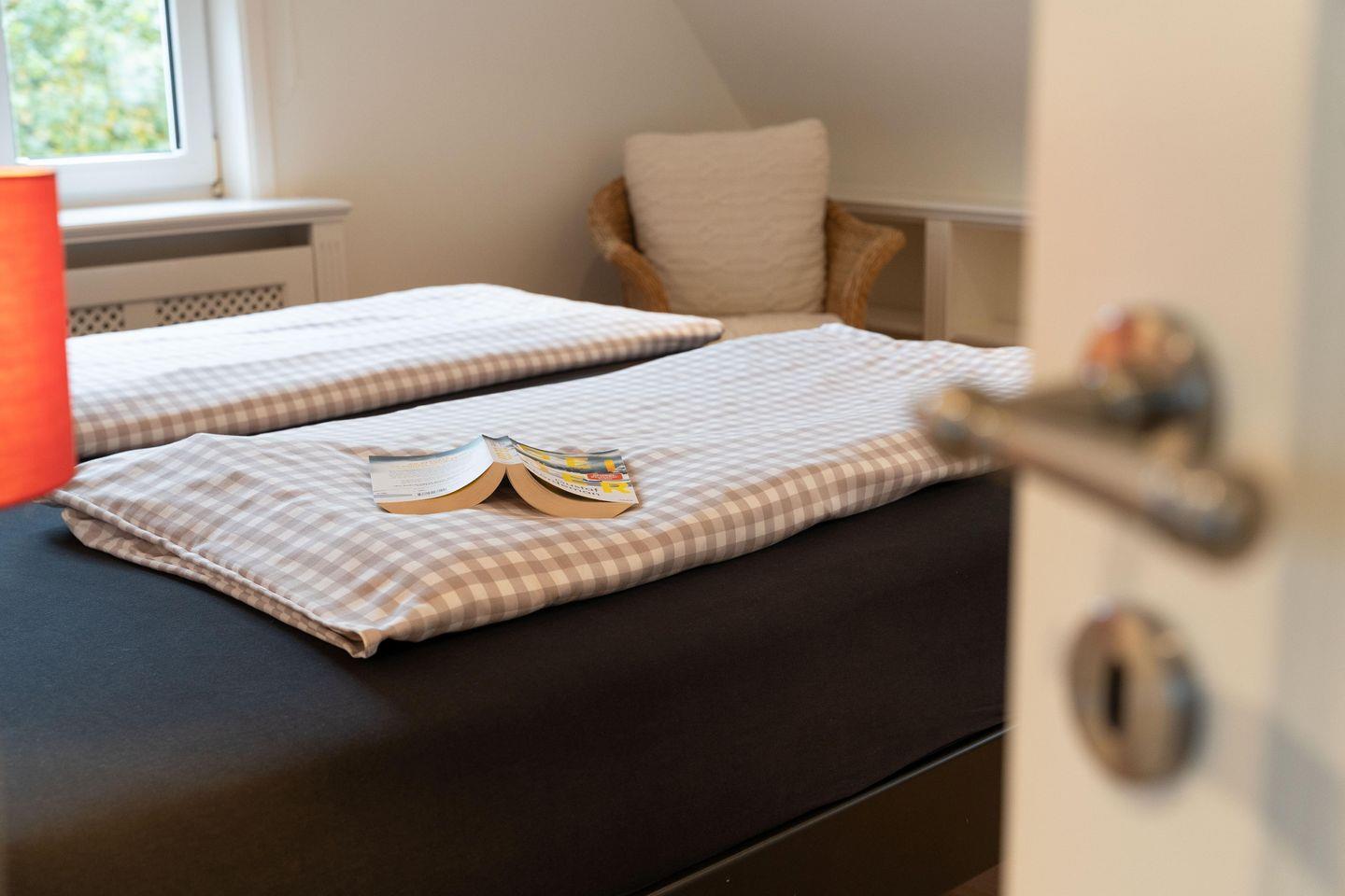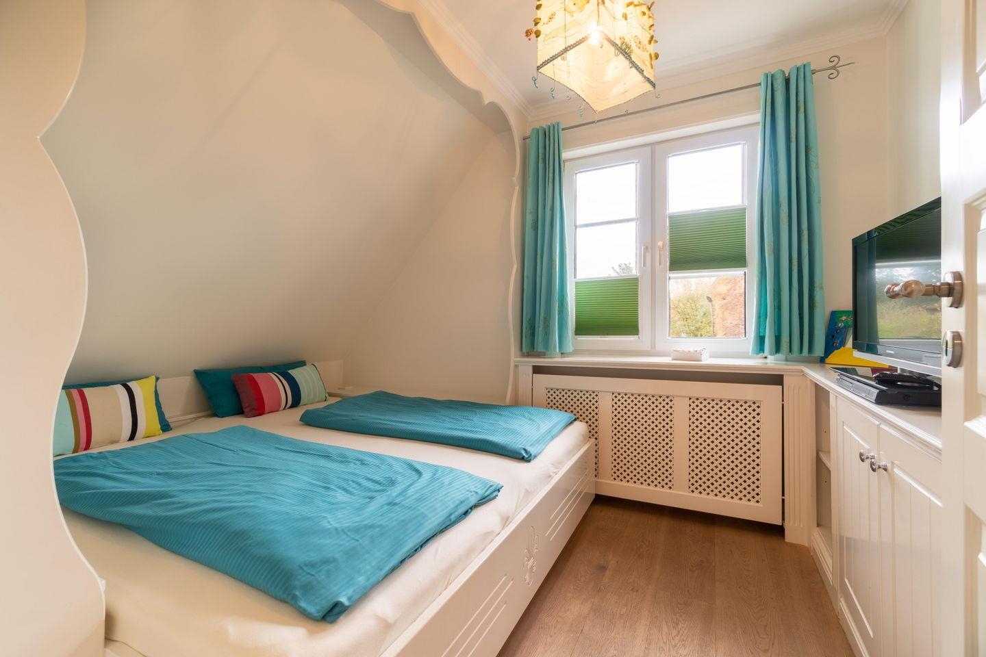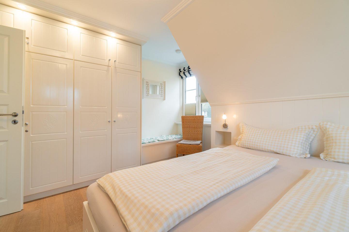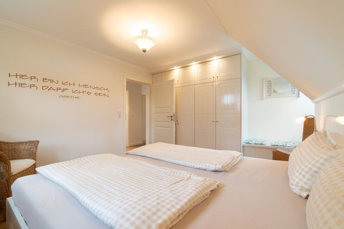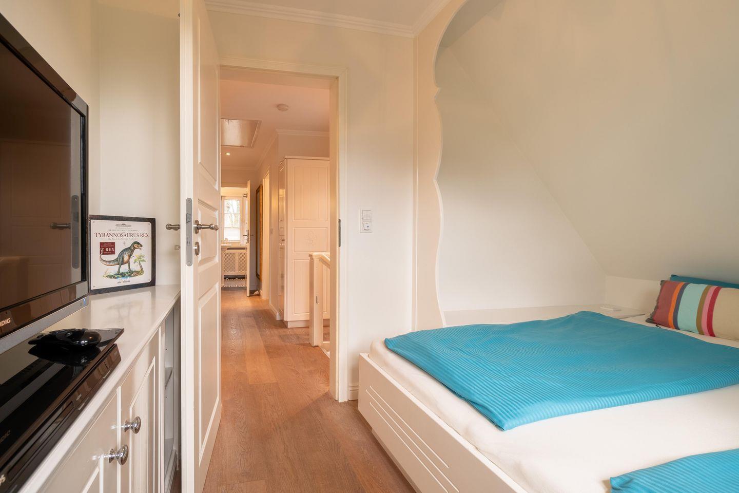 Im Obergeschoss sind die drei Schlafzimmer - jeweils mit 1 Doppelbett ausgestattet -, das zweite Duschbad und ein Wannenbad gelegen. Eines der Schlafzimmer verfügt über einen Schreibtisch.