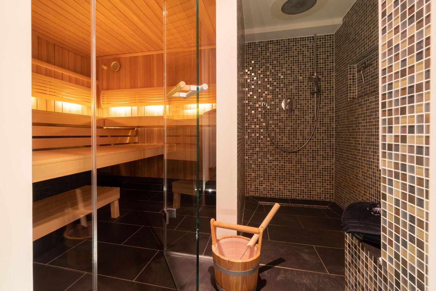 Im Souterrain befindet sich die hauseigene Sauna samt Ruheraum. Für eine einzigartige Atmosphäre sorgen der "Sternenhimmel" mit integriertem Relaxsound in der Sauna, sowie separater Musikanlage für die entspannten Momente im Ruheraum. Im Hauswirtschaftsraum stehen Ihnen eine Waschmaschine und ein Wäschetrockner der Marke Miele kostenlos zur Verfügung.