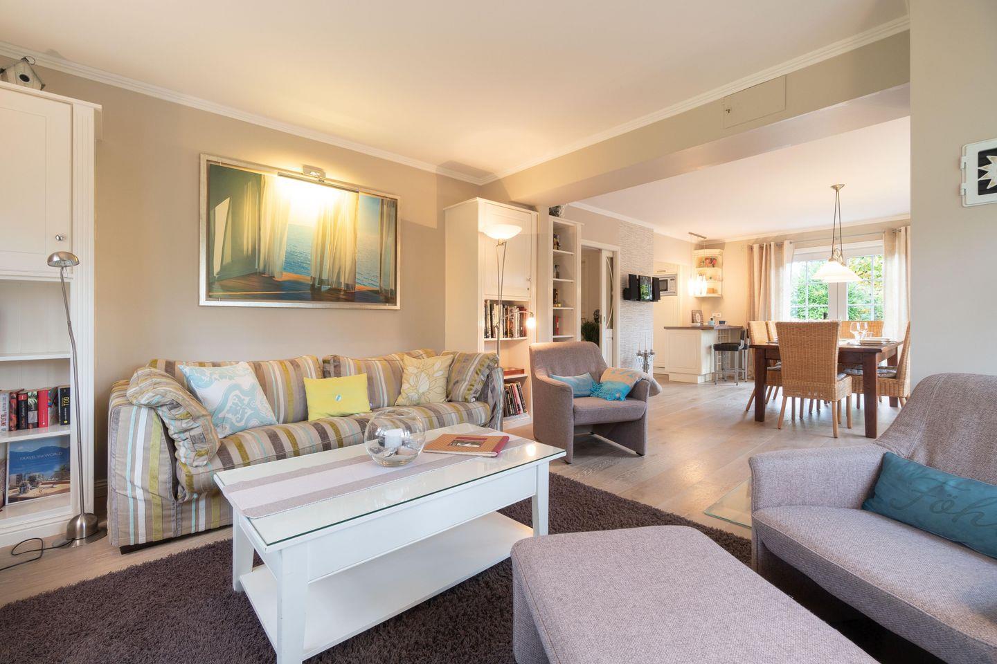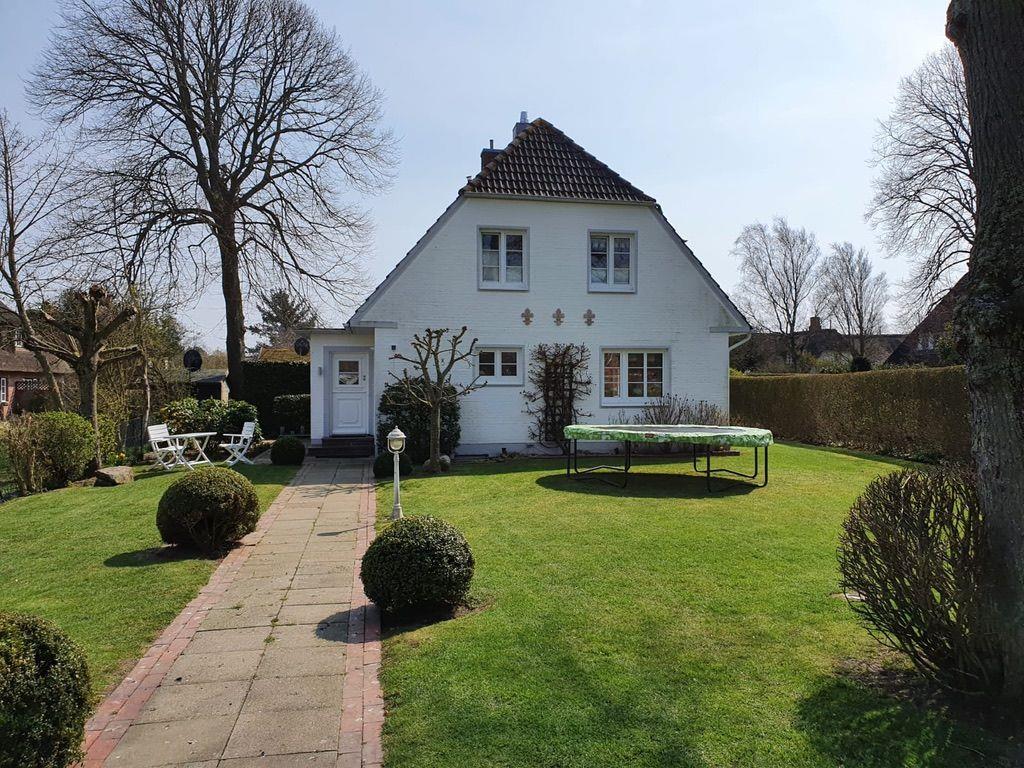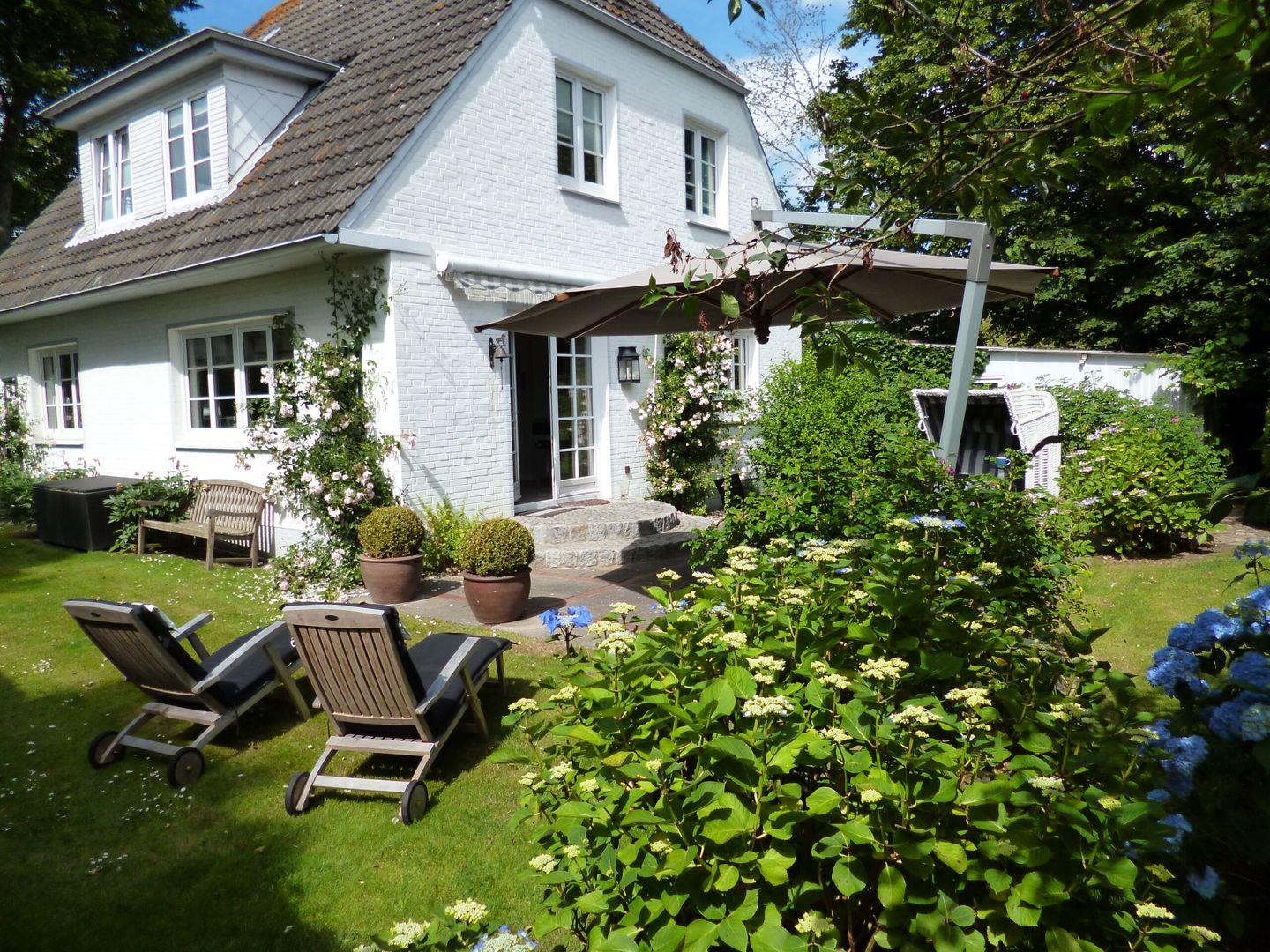 Freistehendes Ferienhaus in besonderer Lage im pittoresken Nieblum mit eigener Sauna, offenem Kamin und blickgeschütztem Garten mit Terrasse und Strandkorb sowie kleinem Kinderspielplatz direkt auf dem Grundstück.