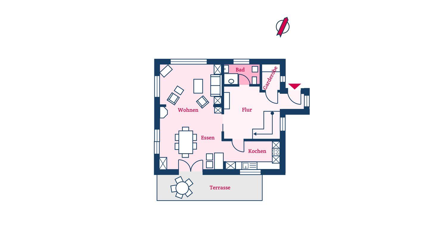 Im Erdgeschoss befinden sich der großzügige Wohn- und Essbereich mit offener Küche und ein Duschbad sowie ein separater Garderobenraum. Der Kamin im Wohnbereich spendet wohlige Wärme an kühlen Abenden. Über den Essbereich gelangen Sie auf die Terrasse und in den eigenen, 800 m² großen Garten.