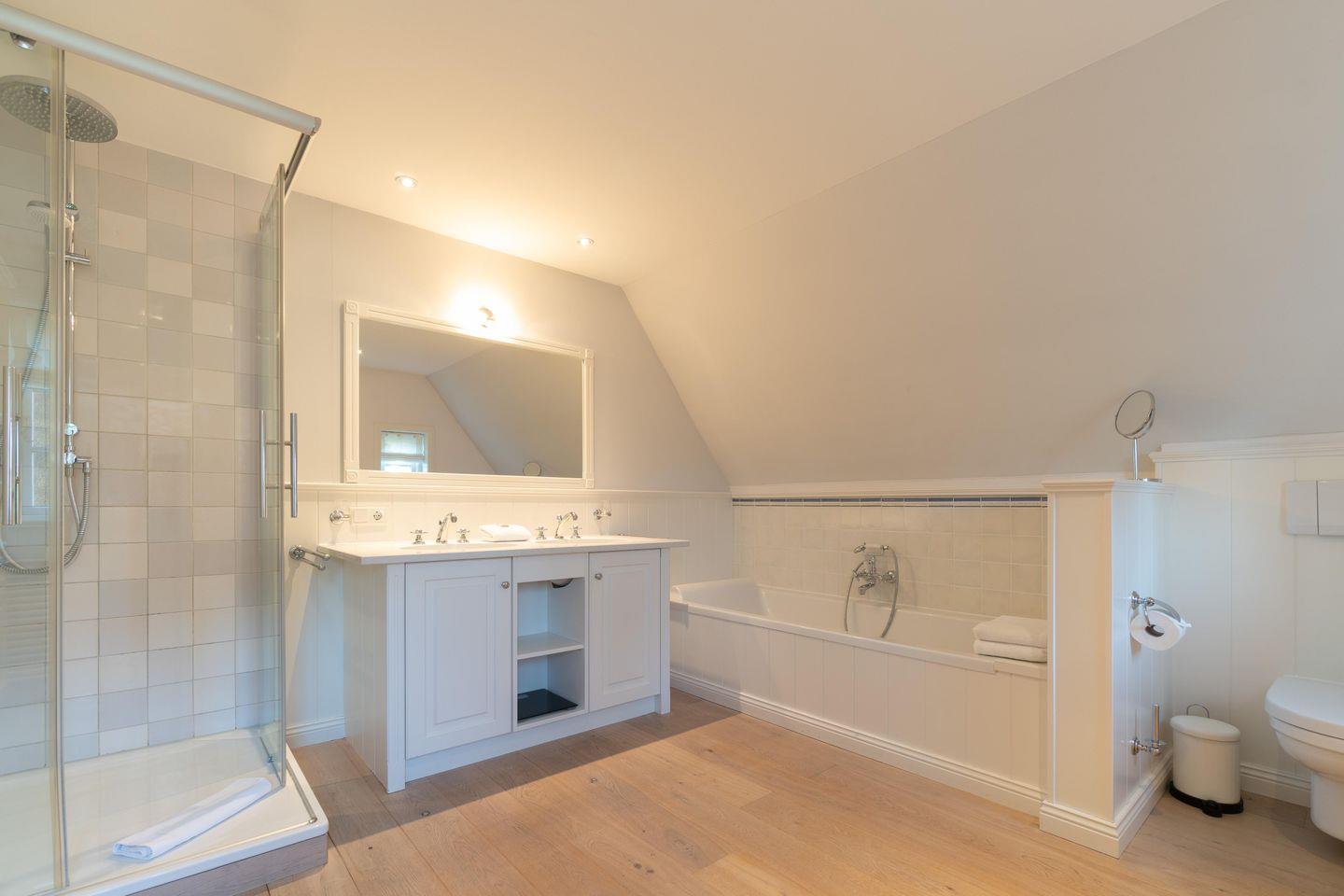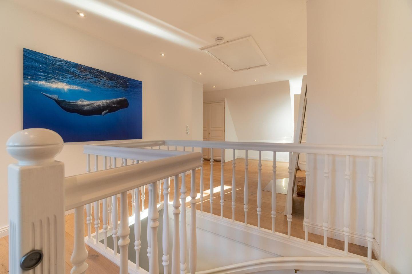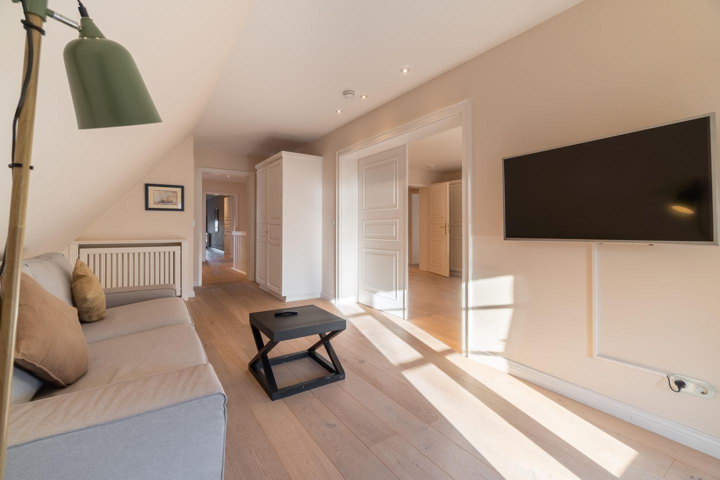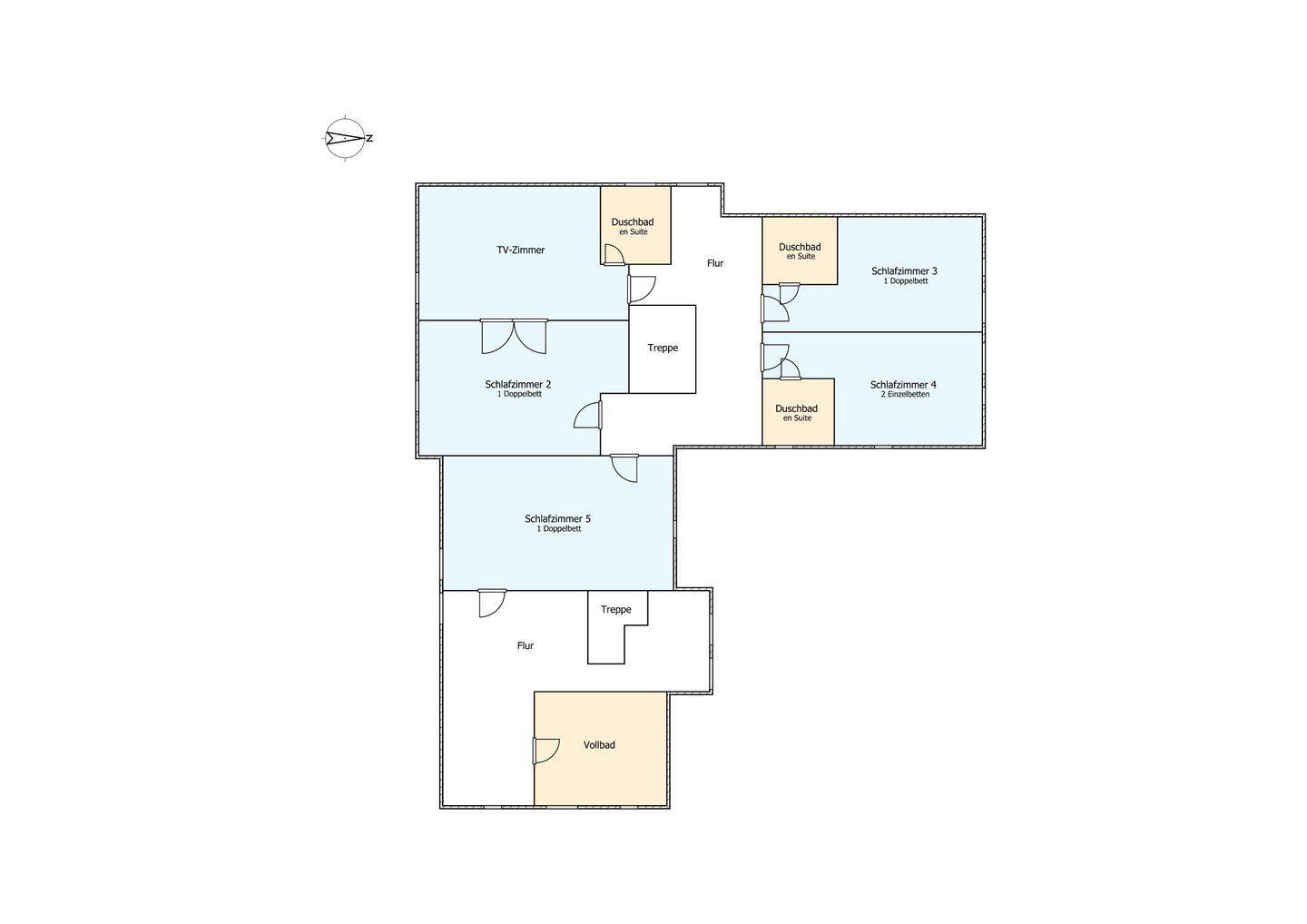 Im Obergeschoss sind die vier weiteren Schlafzimmer - drei mit je einem Doppelbett und eines mit zwei Einzelbetten -, das dritte TV-Zimmer sowie das zweite Vollbad gelegen. Drei der Schlafzimmer verfügen jeweils über ein Duschbad en Suite.