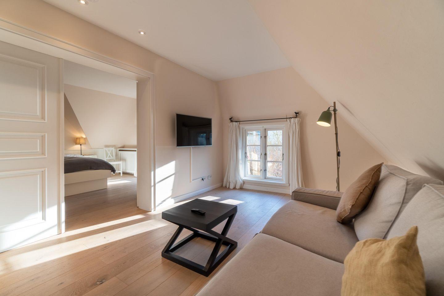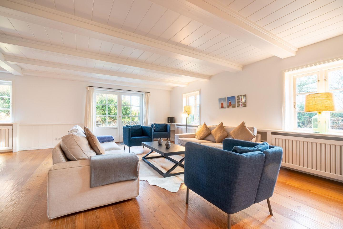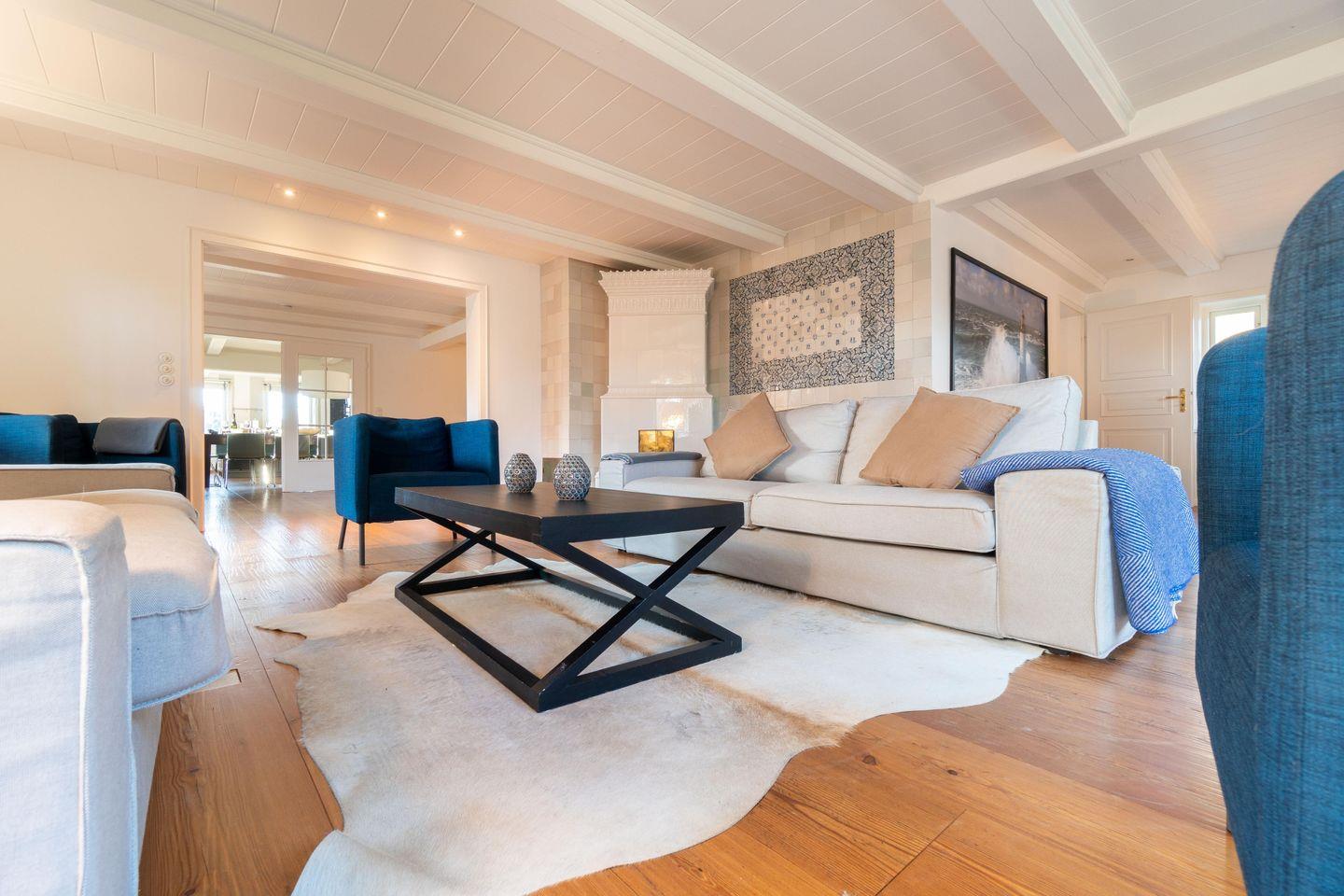Zu den Highlights der Ferienunterkunft zählen wir u. a. die hauseigene Sauna mit Wellnessbereich, den antiken Kachelofen, sowie den Garten mit Terrasse und Strandkorb.