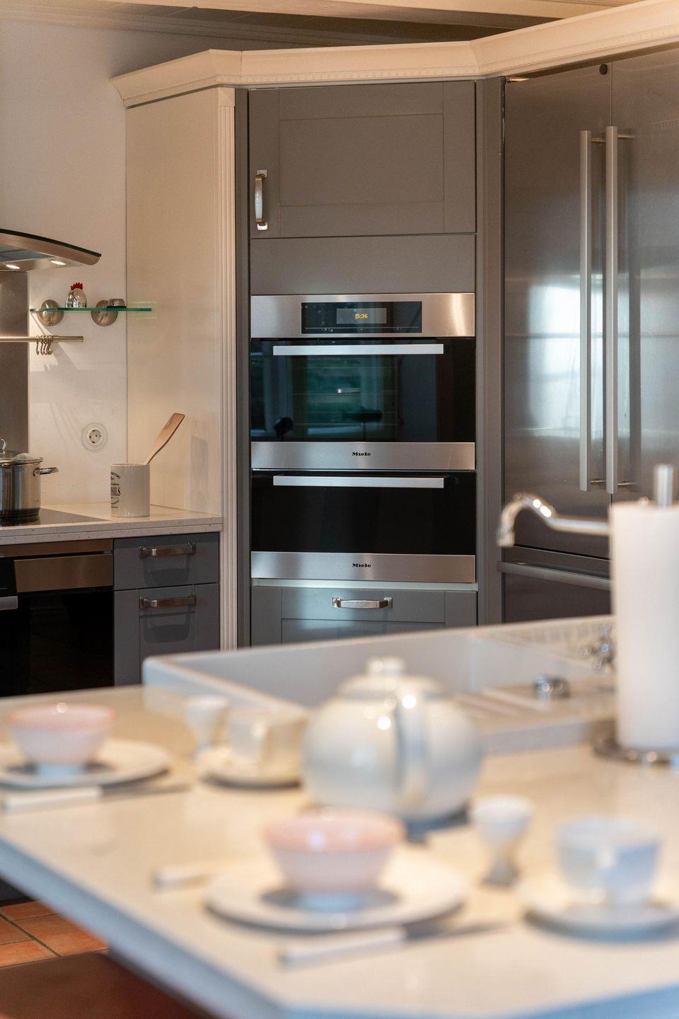 Im Erdgeschoss befinden sich das großzügige Wohnzimmer, zwei TV-Zimmer, ein Esszimmer mit angrenzender Küche, ein Schlafzimmer mit Doppelbett und Duschbad en Suite, sowie ein Vollbad. Über das Wohnzimmer und das Esszimmer gelangen Sie direkt in den Garten und auf die Terrasse. Der antike Kachelofen im Wohnzimmer sorgt auch an kühleren Tagen für eine angenehme Atmosphäre. Im Wohnzimmer steht Ihnen zudem ein Arbeitsbereich mit einem Schreibtisch zur Verfügung. Das Herzstück der Küche bildet sicherlich die großzügige Kochinsel, die jeden Hobbykoch begeistern wird.