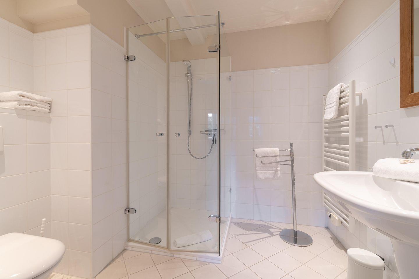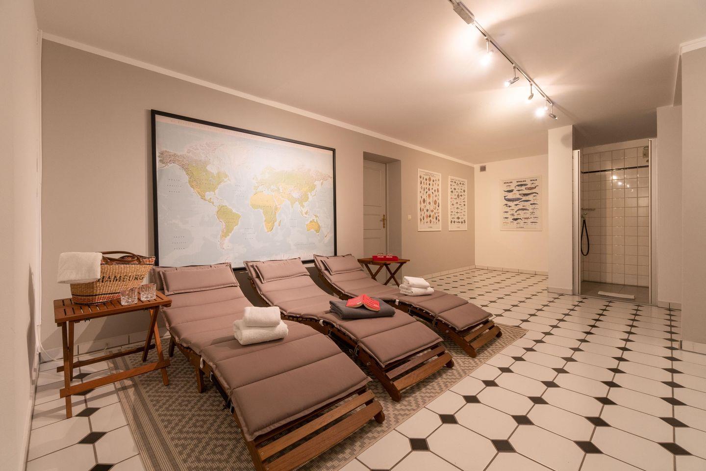 Im Souterrain stehen Ihnen die hauseigene Sauna mit separater, offener Dusche im Wellnessbereich, sowie das Gäste-WC zur Verfügung.