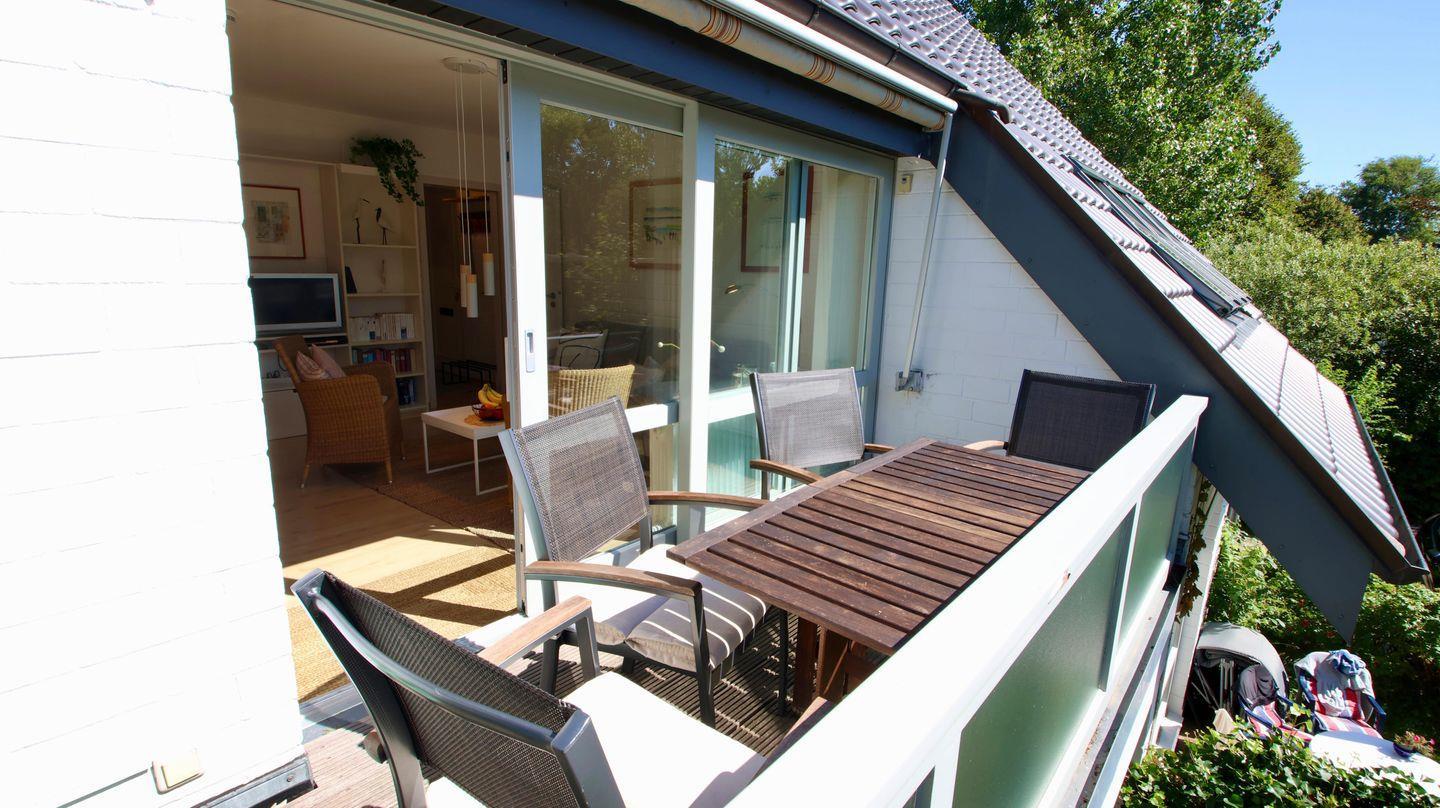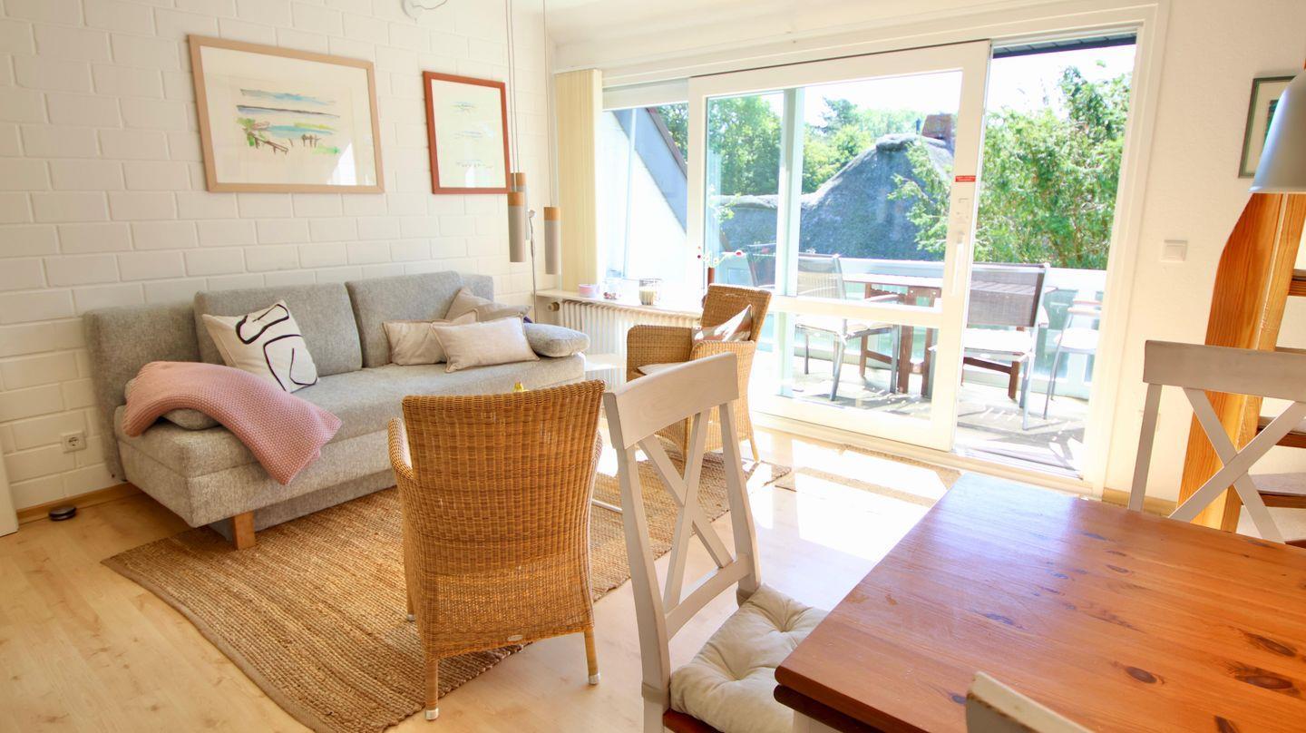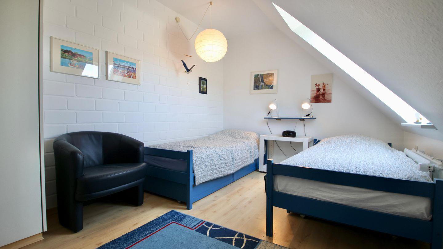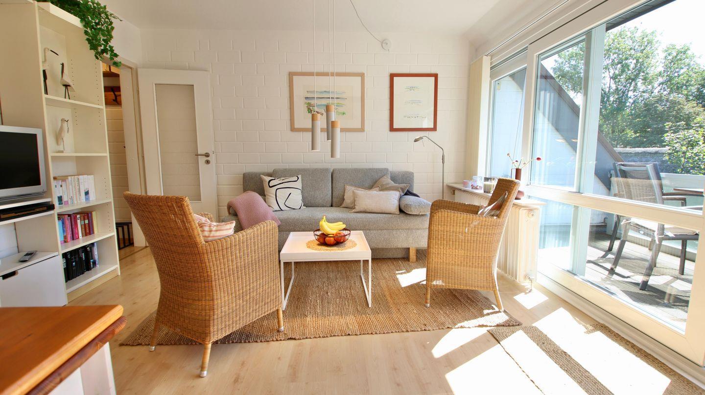 Helle 3-Zimmer-Ferienwohnung im Obergeschoss mit sonnigem Balkon. Die individuelle Wohnung verfügt über einen gemütlichen Wohn- Essbereich mit Zugang zur kleinen, aber gut ausgestatteten Küche. Der Balkon, der mit einer großen Markise versehen ist, erreichen Sie über den Wohn-Essbereich. Auf dieser Ebene befindet sich das Schlafzimmer mit zwei einzelnen Betten. Direkt daneben liegt das erste von zwei Duschbädern. Auf der 2. Ebene gibt es ein zusätzliches Schlafzimmer mit Doppelbett und bad-en-suite. Hervorzuheben ist der ausreichende Stauraum in beiden Schlafzimmern, der durch die Einbauschränke gegeben wird. Im Souterrain des Hauses finden Sie die kleine Sauna sowie das Schwimmbad. Den Sandstrand in Nieblum erreichen Sie in wenigen Gehminuten.