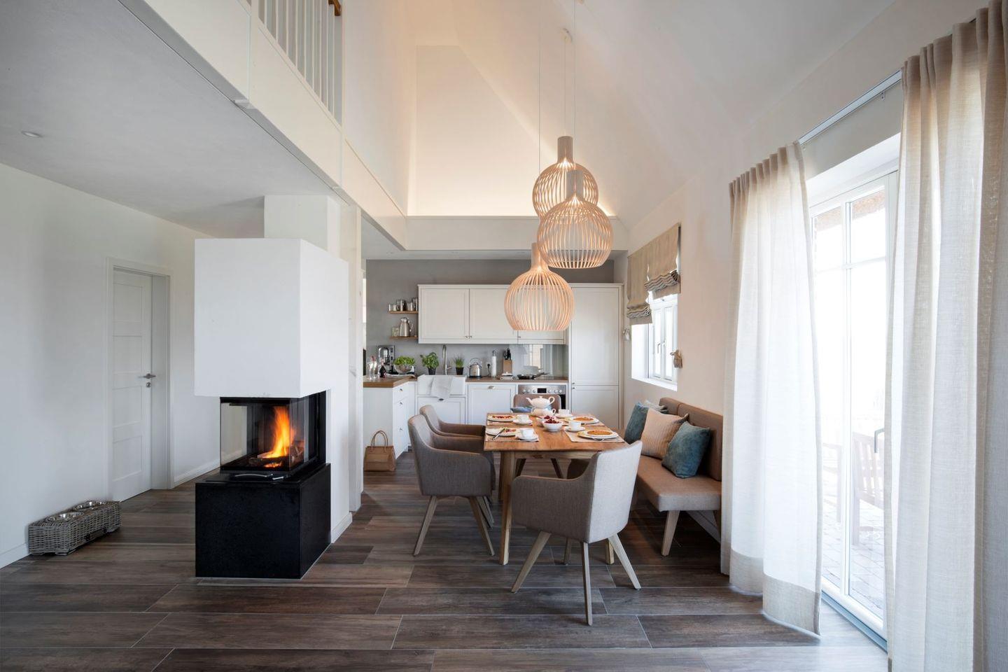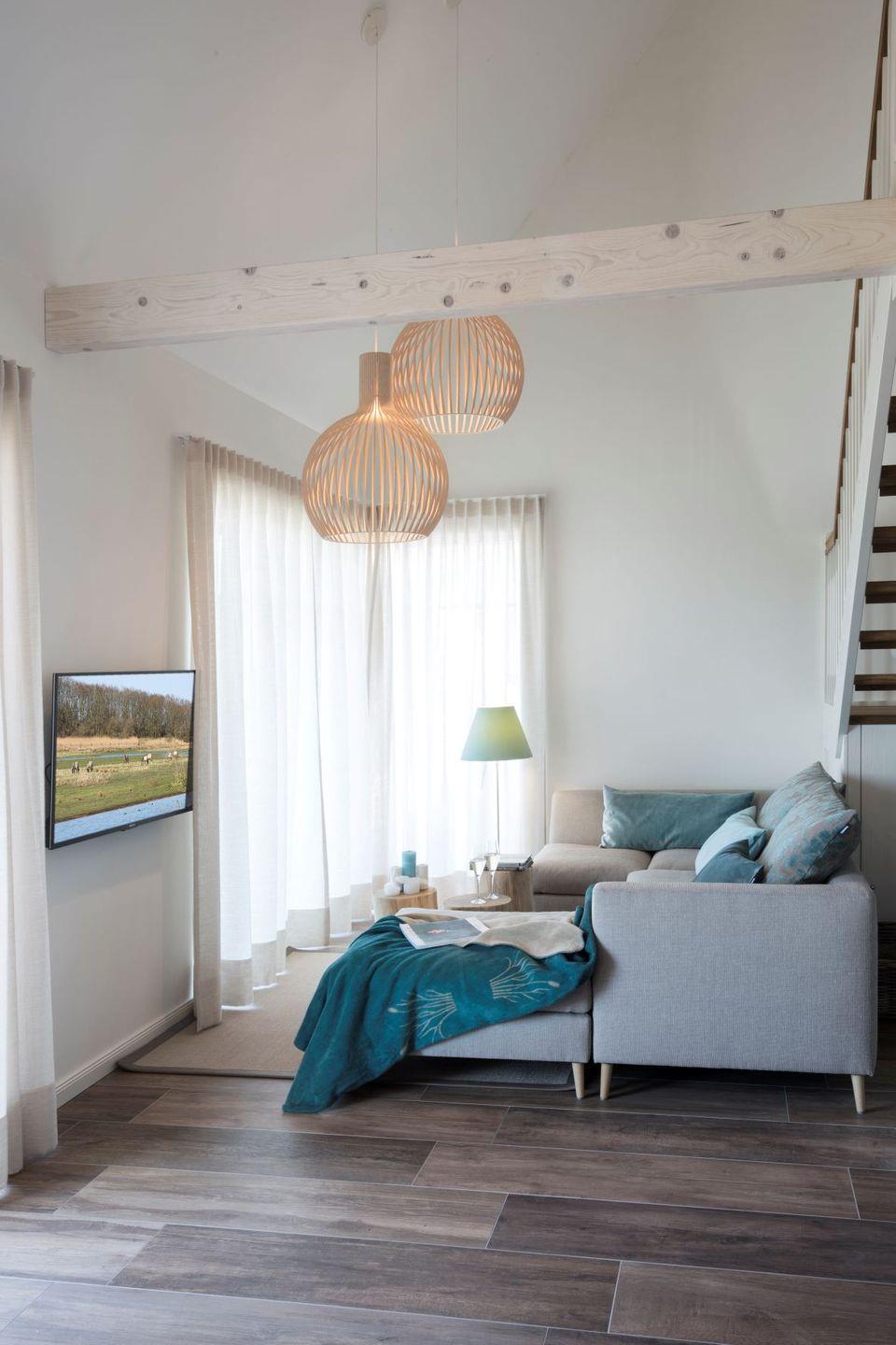 Auf 110 Quadratmetern Wohnfläche genießen Sie die Annehmlichkeiten der exklusiven Einrichtung. Kamin, Sauna und großzügige Terrasse mit hölzerner Sitzecke und eigenem Standkorb sind nur einige Aspekte der Wohlfühl-Oasen in dieser wunderbaren Künstlerkate Herbststurm.