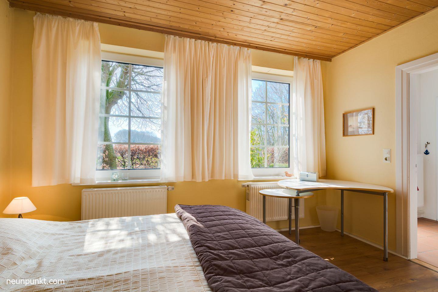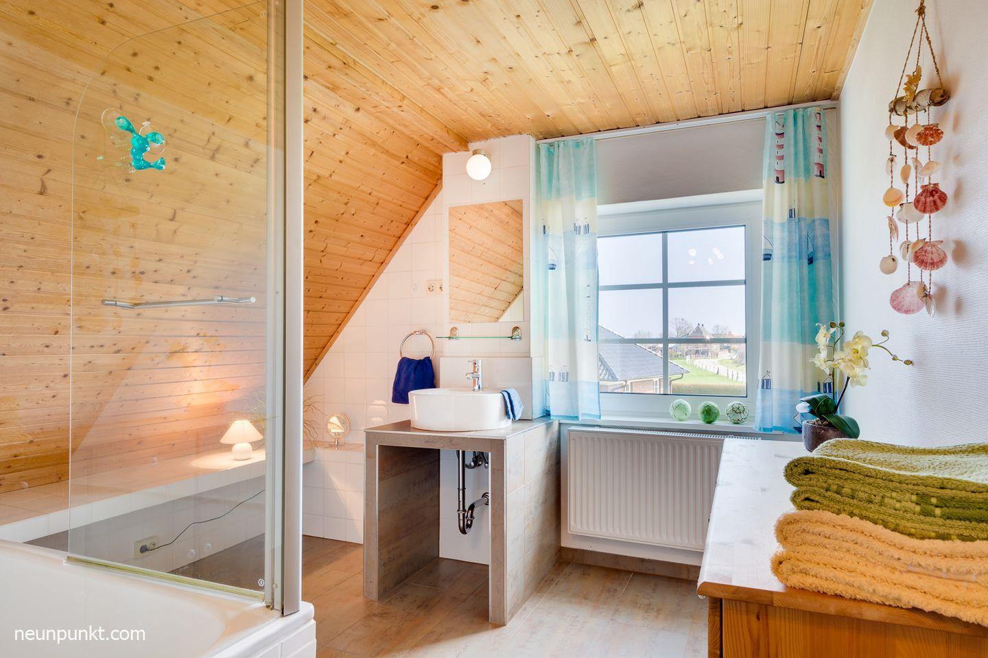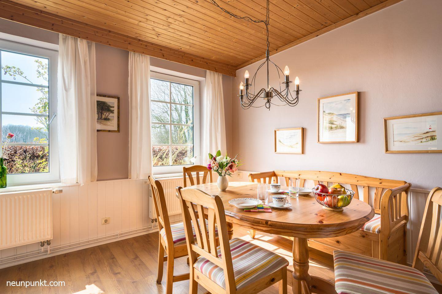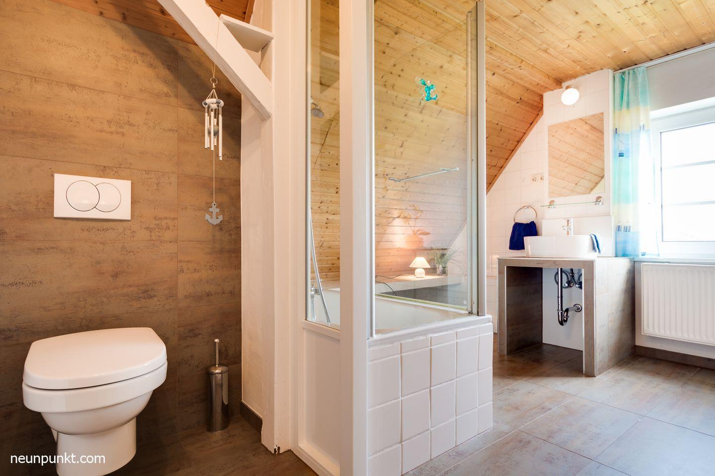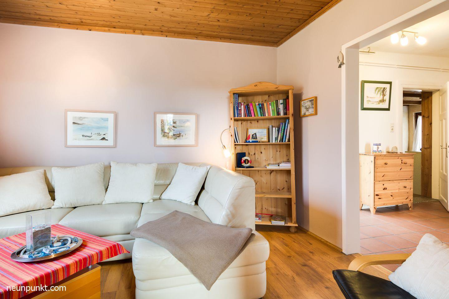 Das gemütliche Wohnzimmer mit Ecksofa und Fernseher lädt zu einem netten Beisammensein ein. Die moderne separate Einbauküche inklusive Geschirrspüler und Backofen lässt keine Wünsche offen. Für Ihren Schlafkomfort sorgen drei Schlafzimmer. Zwei Zimmer sind mit Doppelbetten (EG: 2x 90x200cm (mit TV) und OG: 140x200cm) ausgestattet, der dritte Schlafraum mit zwei Einzelbetten (2x 90x200cm). Das moderne helle Badezimmer verfügt über eine Badewanne. Darüber hinaus gibt es auch ein Gäste-WC und ein Duschbad im Erdgeschoss.