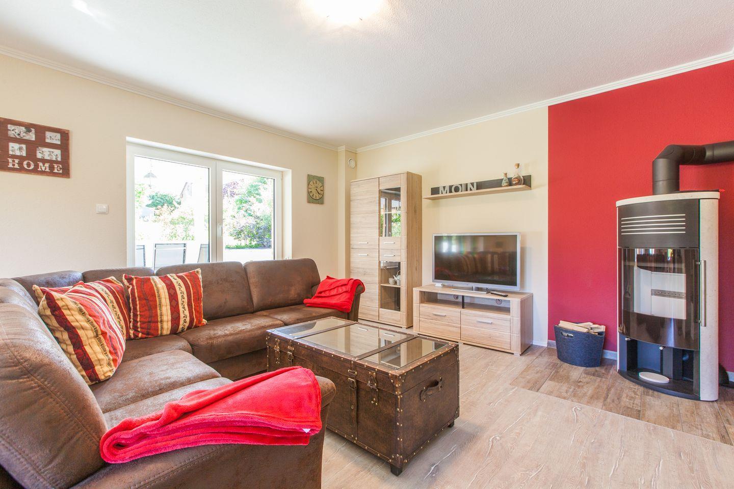 Gleich zu Beginn wird der Bungalow durch den großzügigen Flur -ausgestattet mit Bewegungsmelder- betreten und führt in den offenen Wohn-/ Esszimmerbereich, welcher durch den schönen Kaminofen zu gemütlichen Abenden einlädt.