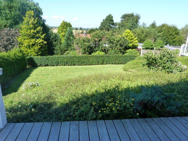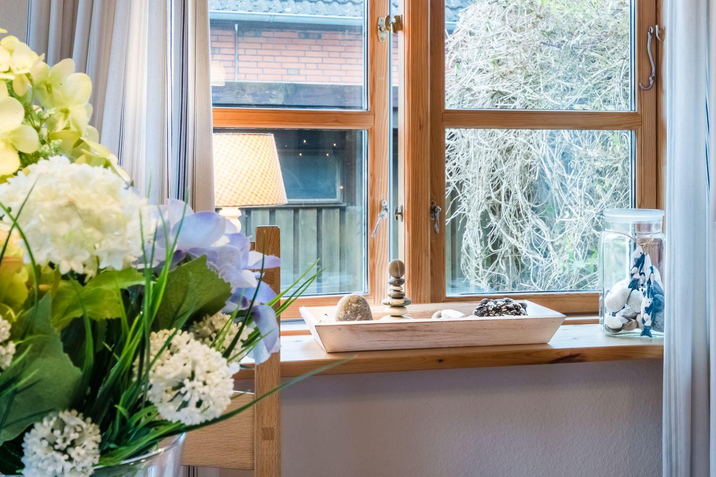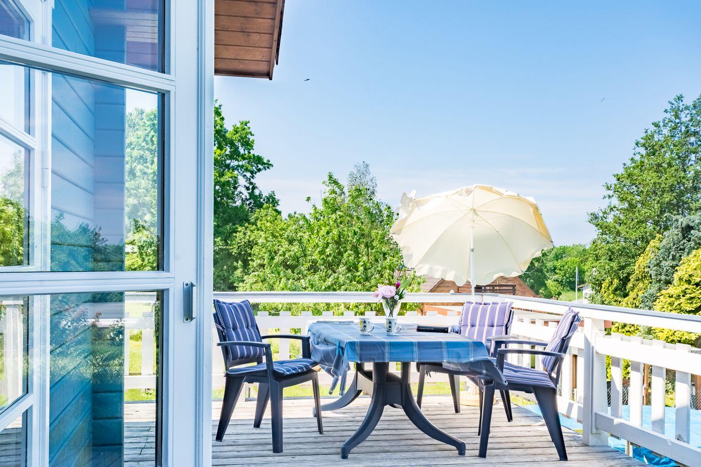 Auf der schönen hölzernen Terrasse finden Sie eine Sitzgruppe und können den Blick auf den grünen Garten genießen. In der Ferne sehen Sie sogar die Flensburger Förde und die dänische Küste.