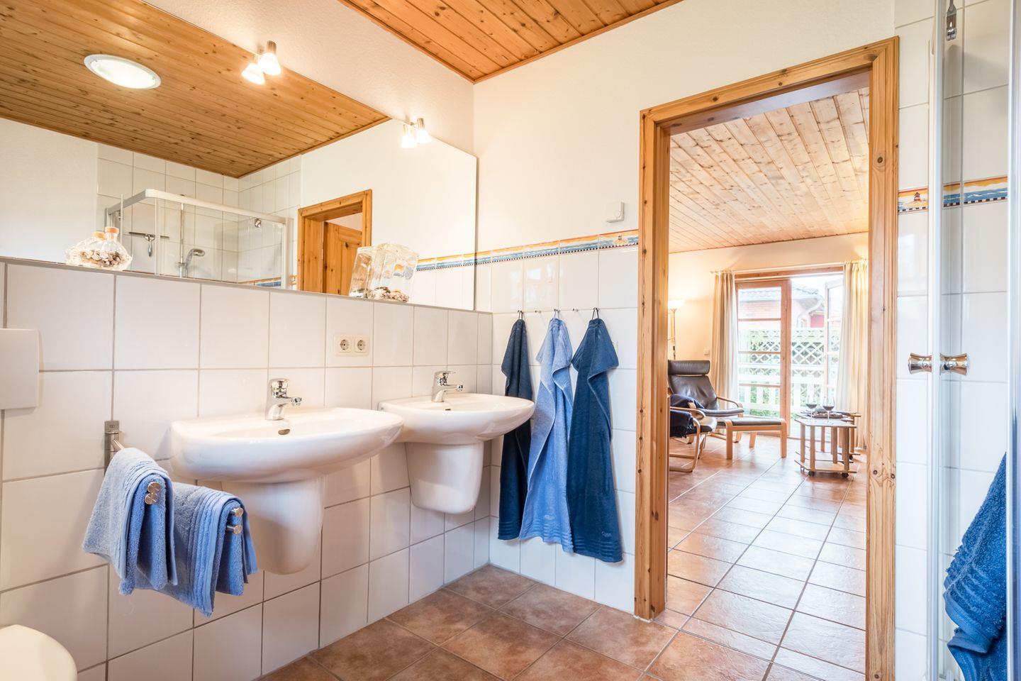 Direkt neben dem Wohnzimmer liegt das Elternschlafzimmer (2x 90x200cm). In einem weiteren Schlafzimmer finden Sie drei Einzelbetten (je 90x200cm), perfekt für Ihre Kinder.
