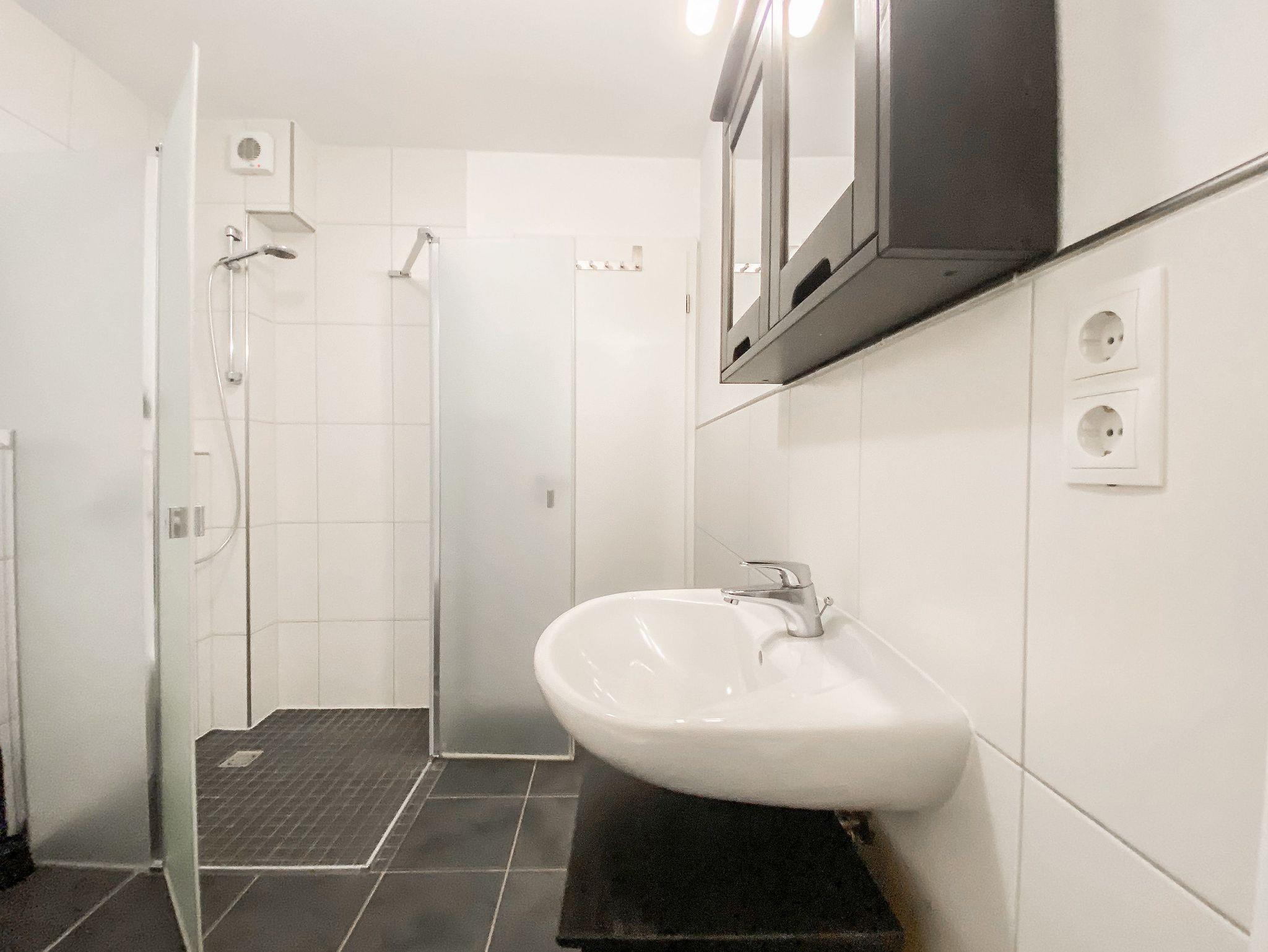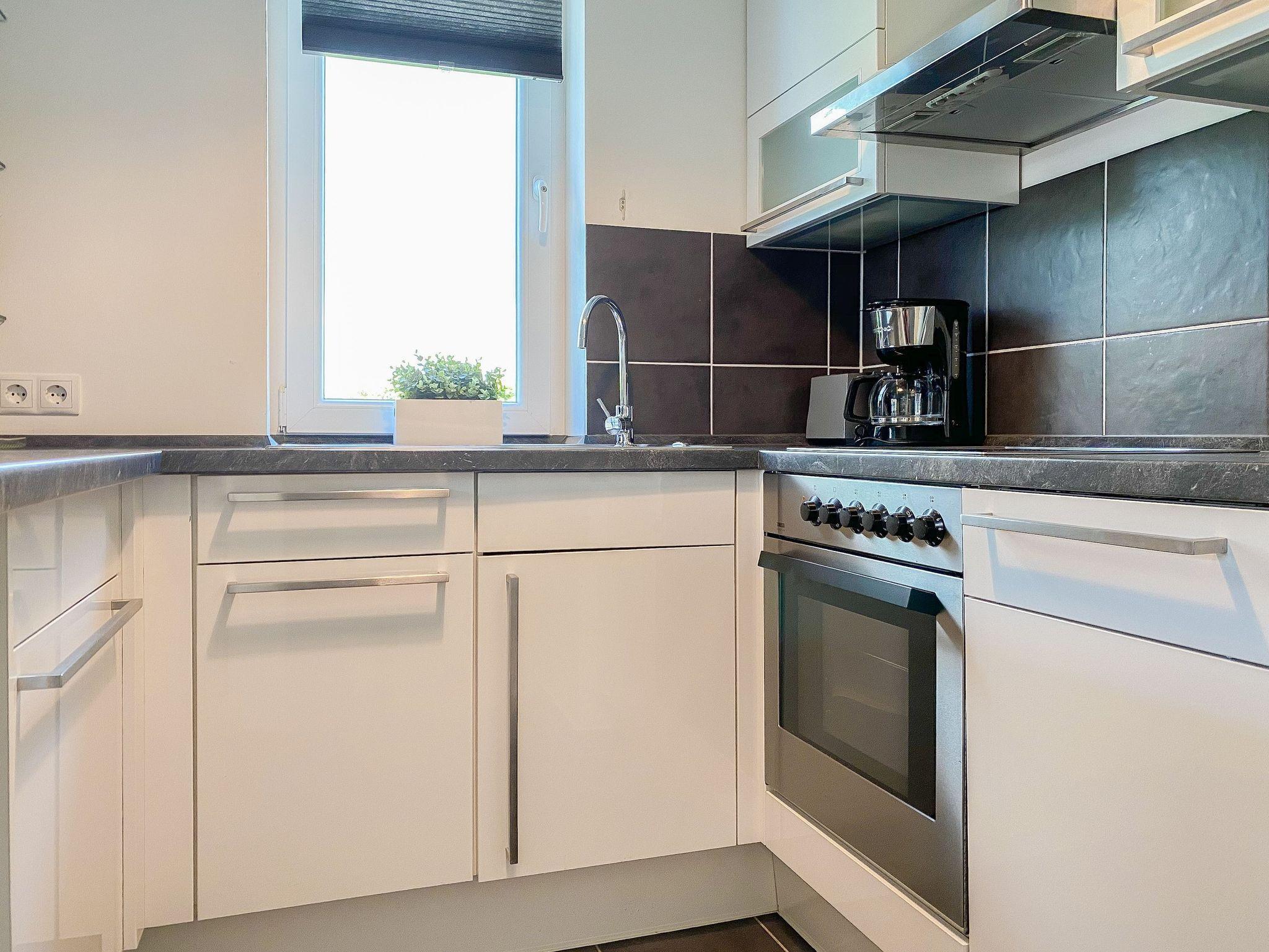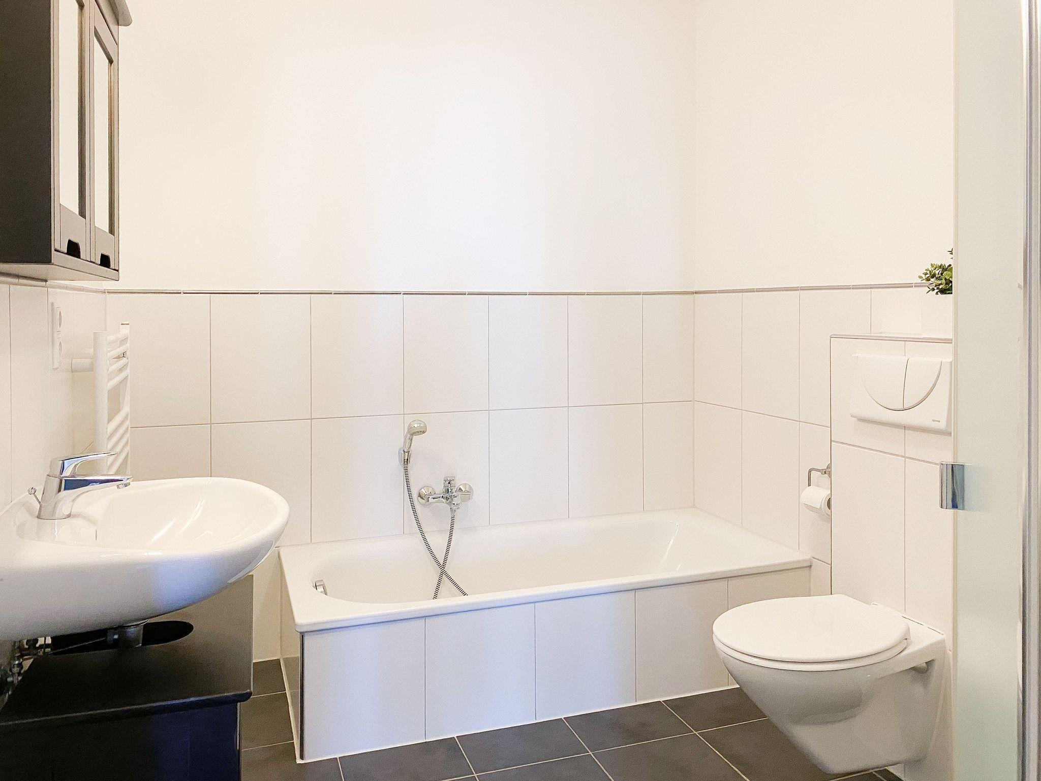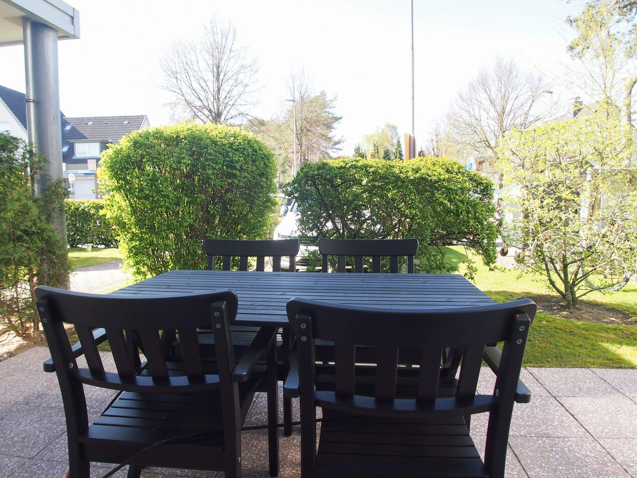 Der großzügige Wohnbereich ist mit einem Sofa mit Schlaffunktion (140x190), einem Relax-Sessel, Musikanlage und TV eingerichtet. Kostenloser Internetzugang steht über WLAN[nbsp] zur Verfügung. Die angrenzende Terrasse ist mit[nbsp] Gartentisch und Stühlen möbliert. Die bestens ausgestattete Einbauküche mit Küchentresen und Barhockern ist der Mittelpunkt der charmanten Wohnung. Der gemütliche Essbereich bietet ausreichend Platz für 4 Personen. Im separatem Schlafzimmer befindet sich ein Doppelbett (180x200), ein Kleiderschrank mit viel Staufläche sowie ein weiterer TV. Die Fenster lassen sich durch Vorhänge verdunkeln. Das moderne, großzügige Bad mit ist sowohl mit einer bodentiefen Walk-In Dusche als auch einer Badewanne ausgestattet. Waschmaschine und Trockner (Münzgeräte) sind vorhanden und stehen zur gemeinschaftlichen Nutzung zur Verfügung.