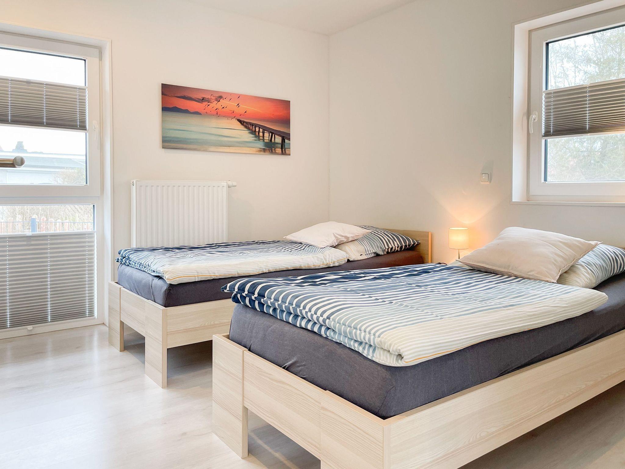Zwei separate Schlafzimmer sorgen für erholsame Nächte. Das Elternschlafzimmer ist mit einem gemütlichen Doppelbett (180x200 cm) ausgestattet, das zweite Zimmer bietet zwei Einzelbetten (je 90x200 cm). Beide Zimmer verfügen über Verdunkelungsplissees und einen eigenen Fernseher. Das überaus großzügige Badezimmer überzeugt mit Fussbodenheizung und bodentiefen Fenster, einer ebenerdigen XXL-Walk-in-Dusche, und ein zusätzliches Gäste-WC befindet sich im Eingangsbereich.
