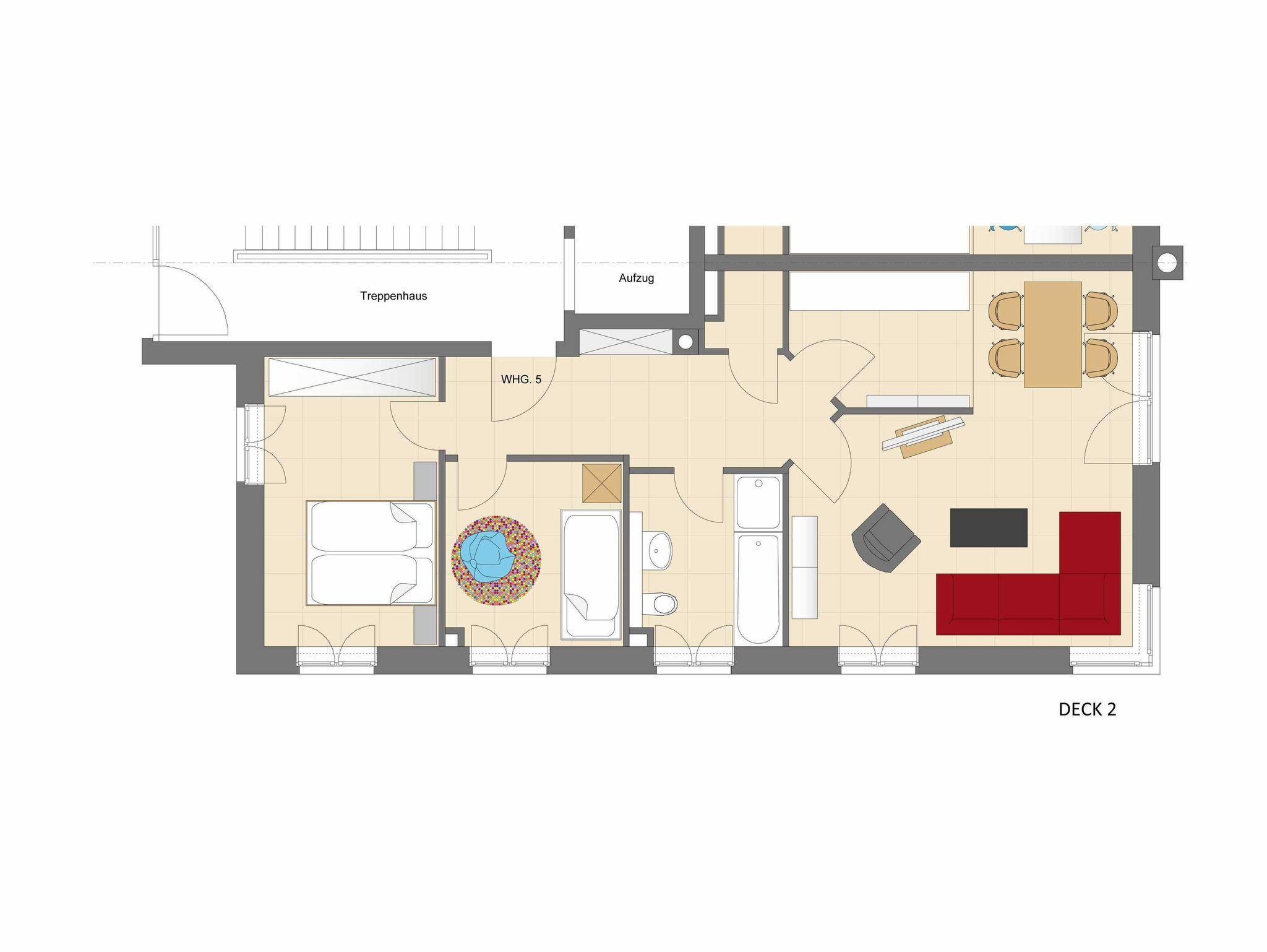 Die exklusive Ferienwohnung Deck 2 befindet sich im Erdgeschoss des Ferienhauses Ostsee Lodges mit Aufzug, Sauna und Fitnessbereich. Genießen Sie Ihren Urlaub in der 75 qm großen, lichtdurchfluteten Wohnung mit bodentiefen Fenstern, Südwest Terrasse und elektrischer Sonnenmarkise. Sie gelangen von der komfortablen halboffenen Küche in den großzügigen Wohn-Essbereich, einfach zum Wohlfühlen. In den 2 separaten Schlafzimmern mit TV erwartet Sie hoher Schlafkomfort mit höhenverstellbaren Lattenrosten. Ein Schlafzimmer ist mit einem Doppelbett, das andere mit einem spezial angefertigten Etagenbett (90x200) mit Buch- und Leseablage ausgestattet. Das hochwertige Bad mit viel Tageslicht ist mit einer Glaskomfortdusche, Badewanne, Fußbodenheizung und Handtuchwärmer ausgestattet. Im kleinen Hauswirtschaftsraum steht ein Waschtrockner. Carpot mit Ladestation und Fahrradhäuschen ist vorhanden.
