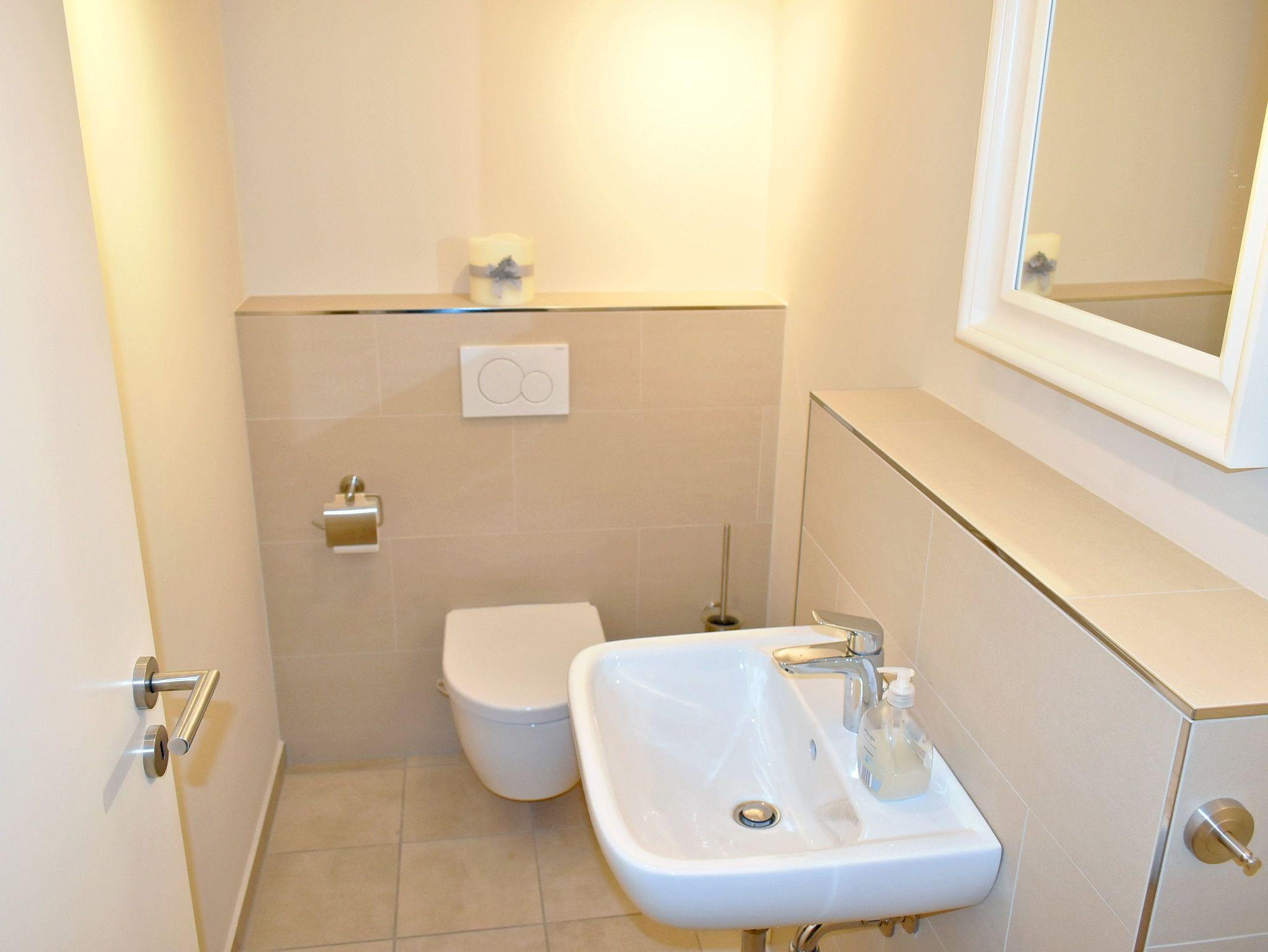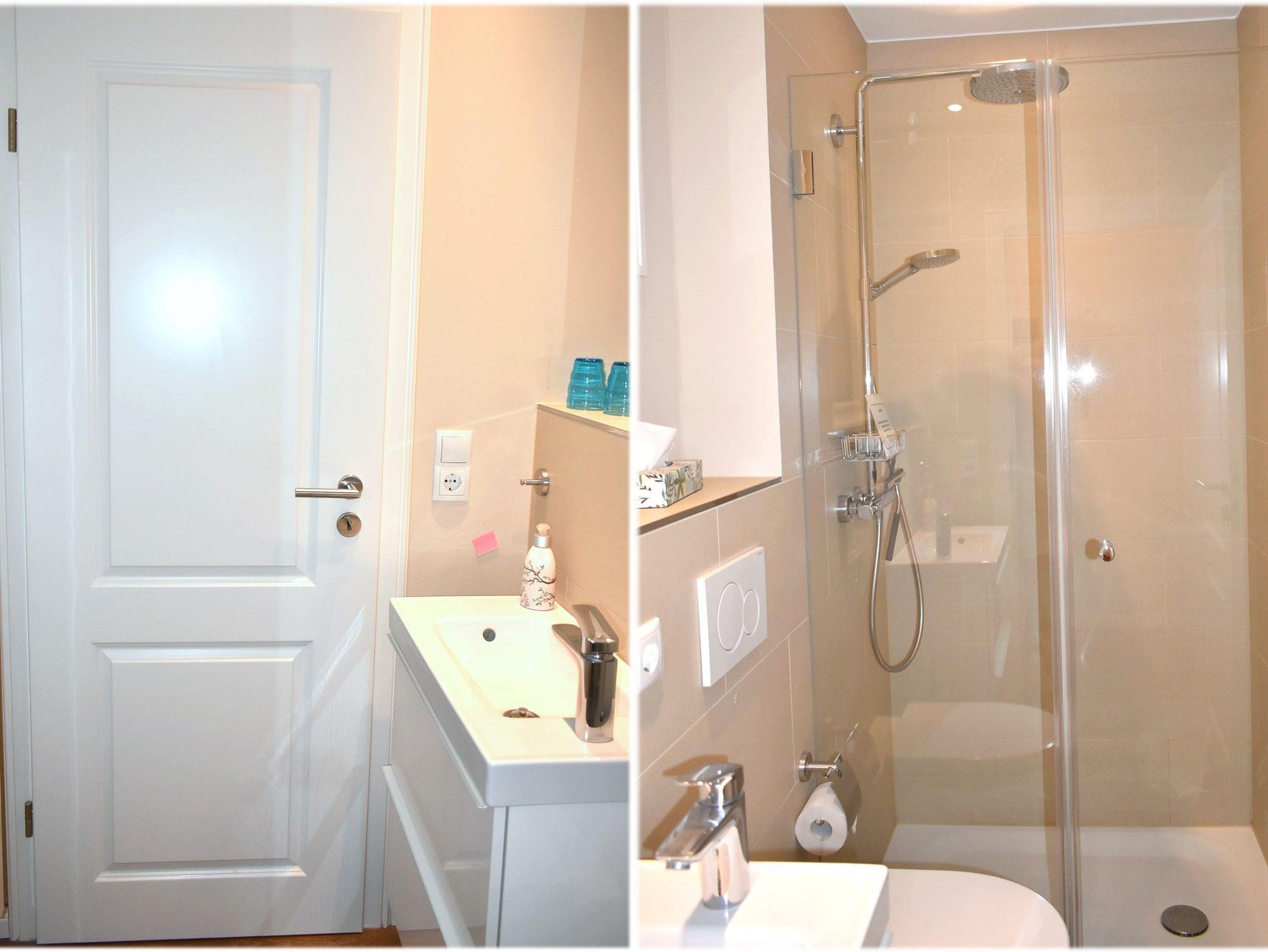 Bad 1: Duschkabine, Fön, Kosmetikspiegel, Regen-Dusche, Spiegel, Unterschrank, Waschtisch, WC