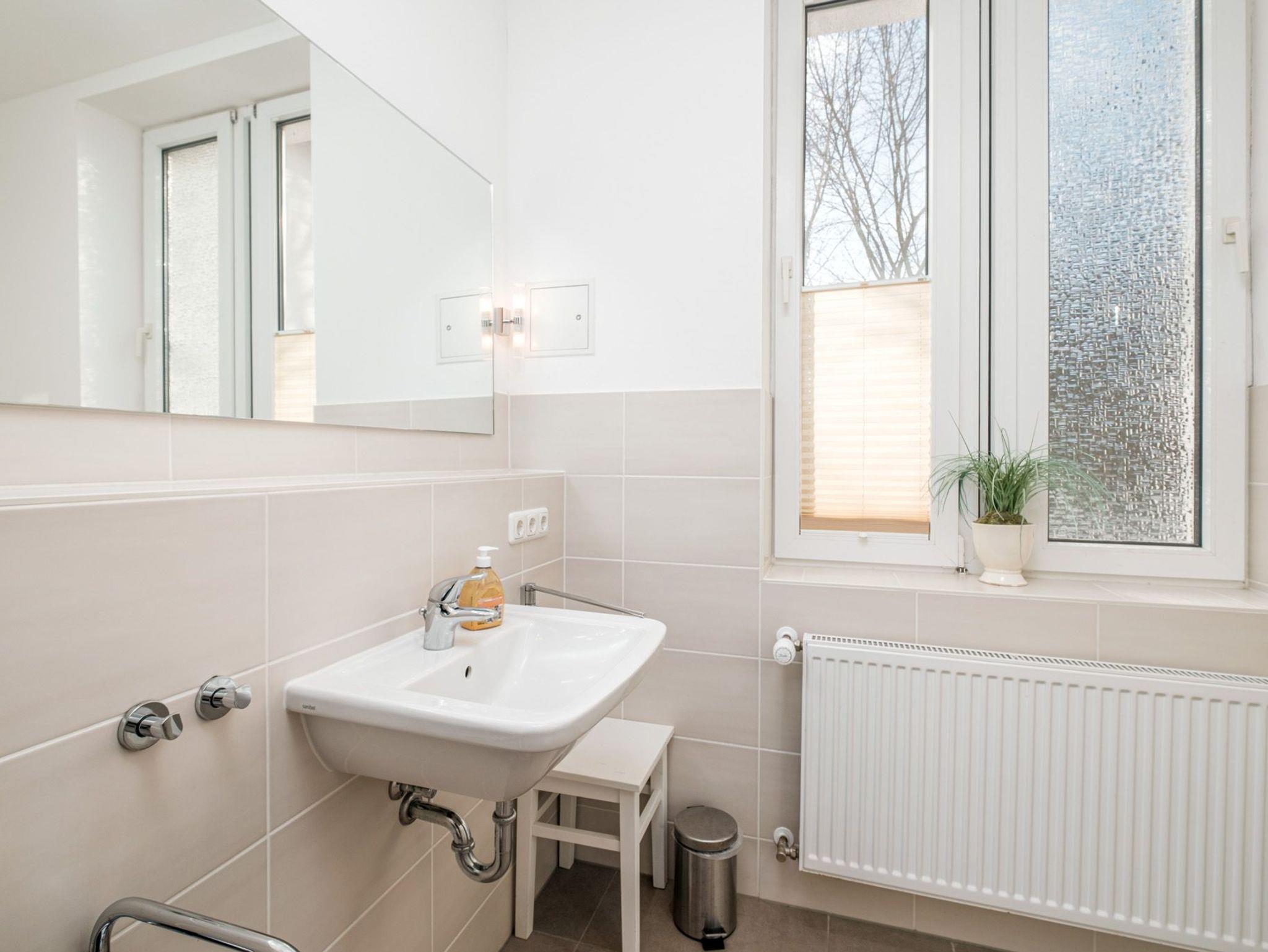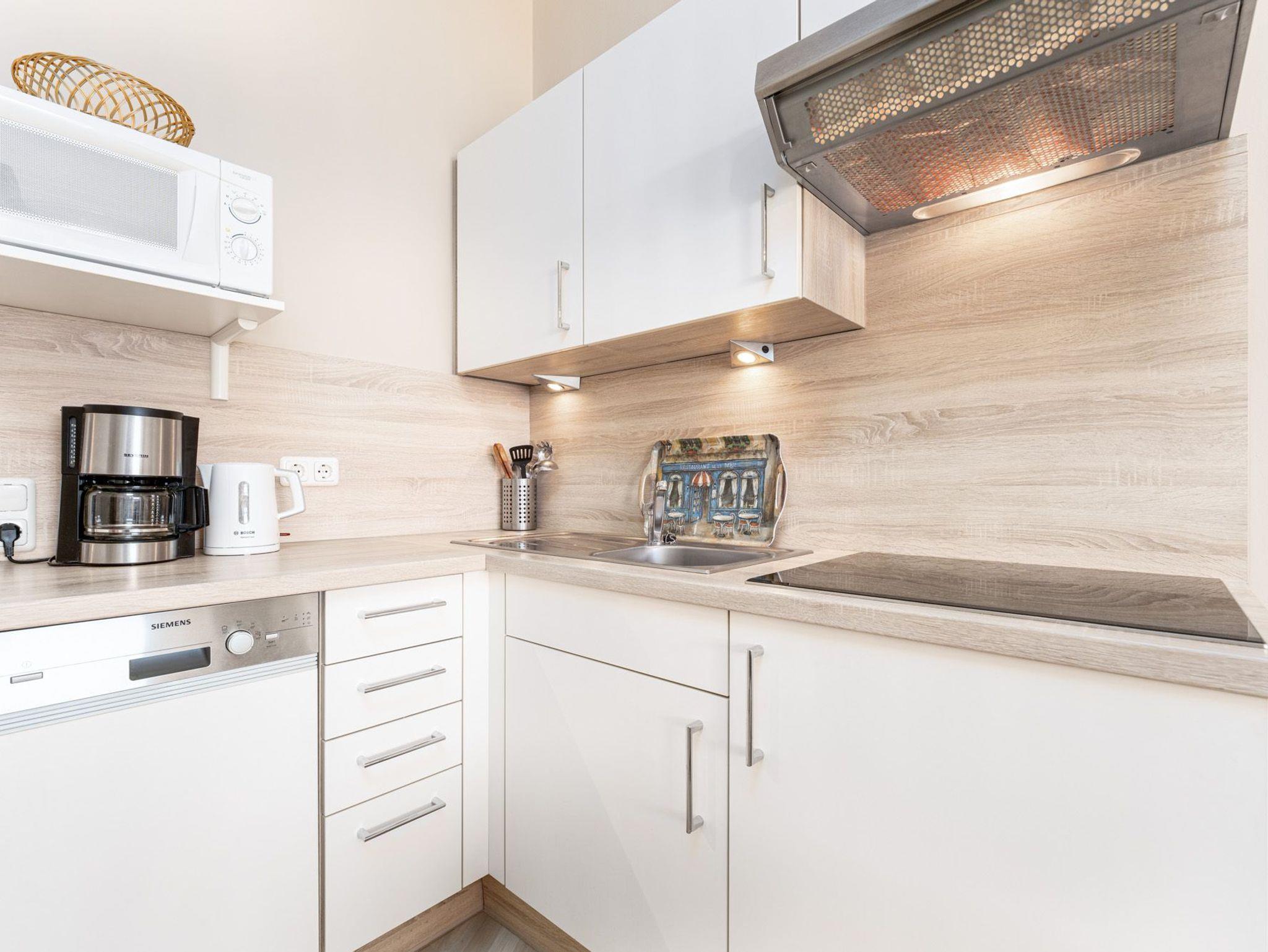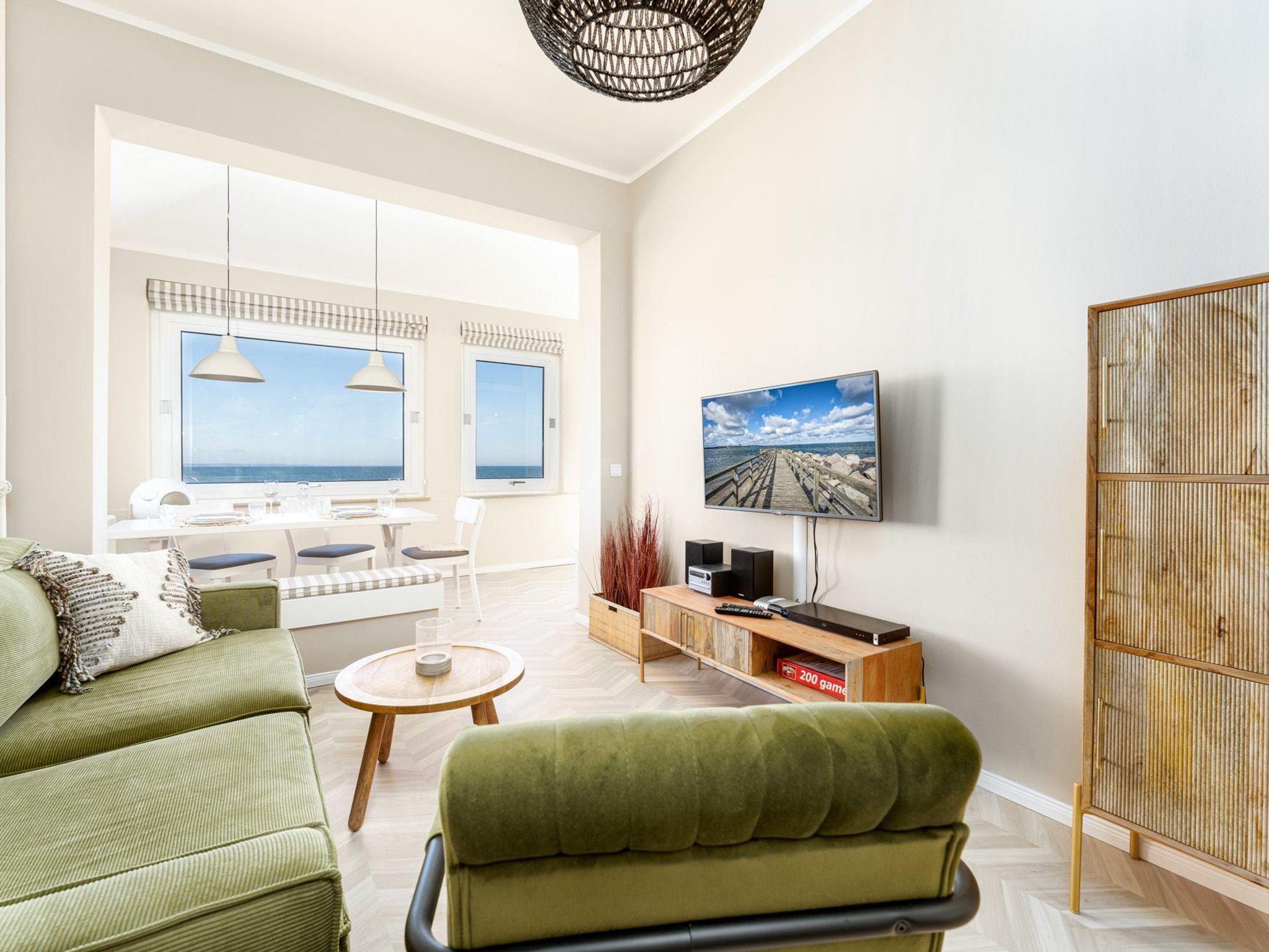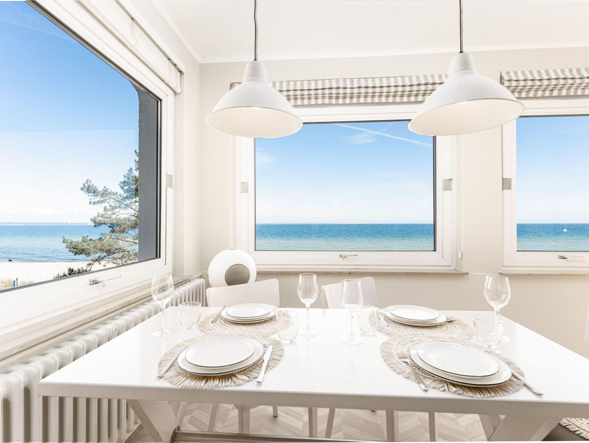 Hell und modern eingerichtet, verfügt das Wohnzimmer für eine bequeme Couchgarnitur mit Flachbild-TV, Blu-Ray-Player und HiFi-Anlage sowie eine integrierte Einbauküche mit Geschirrspüler und Mikrowelle. Von hier aus betreten Sie die Wohnveranda, wo sich ein geräumiger Essbereich befindet und Sie einen traumhaften Meerblick auf die Ostsee genießen können.