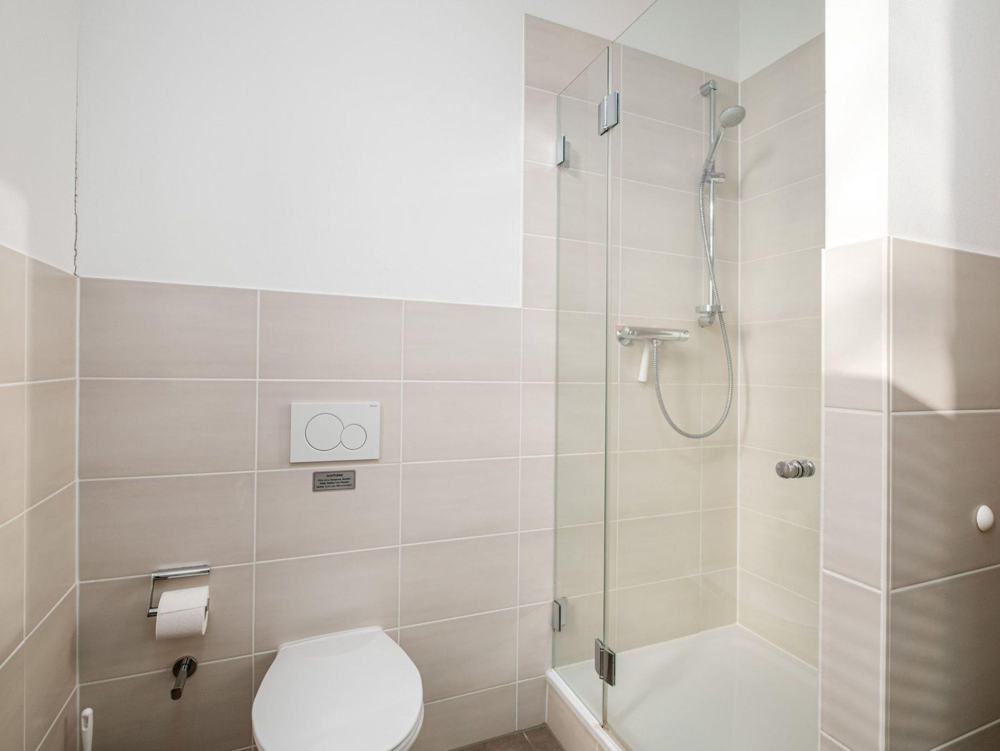 Das Badezimmer verfügt über eine Dusche, WC, einen Fön und Kosmetikspiegel.