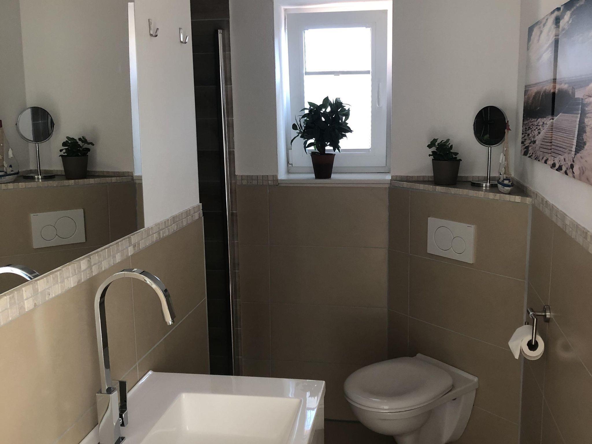 Das Badezimmer verfügt über eine Dusche, einen Waschtisch mit Abstellmöglichkeiten und es gibt ein Fenster.