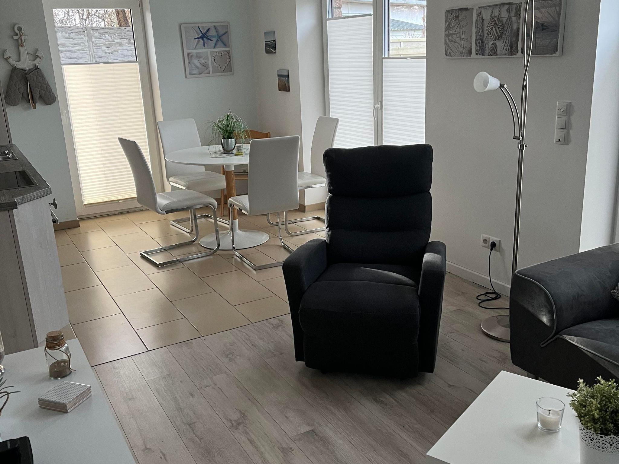 Der Wohnbereich und Küchenbereich ist durch 3 Terrassentüren lichtdurchflutet und es gibt einen direkten Zugang zur Terrasse, wo ein Tisch mit vier Stühlen zur Verfügung steht. Ausserdem steht den Gästen ein Grill zur Verfügung .