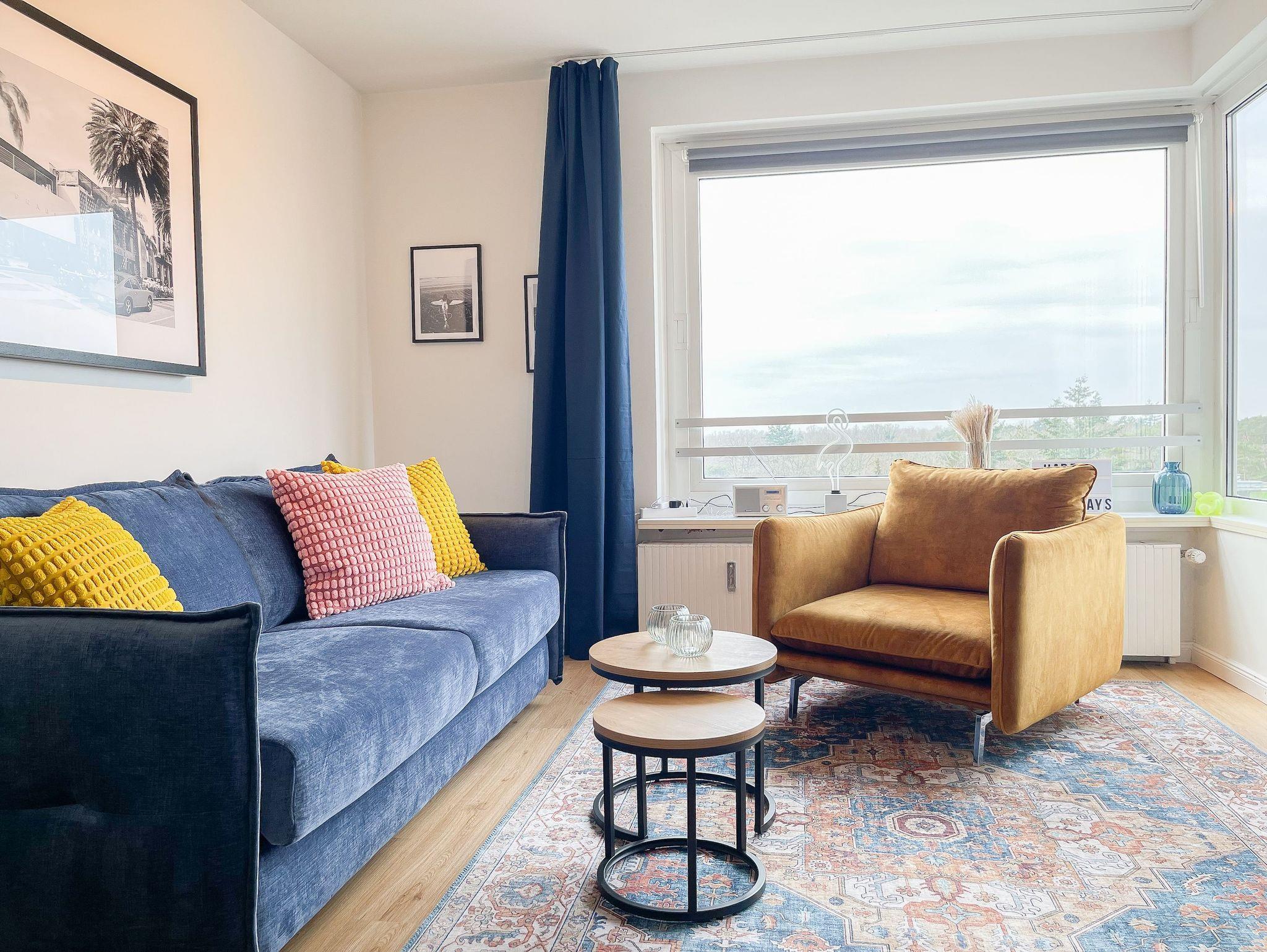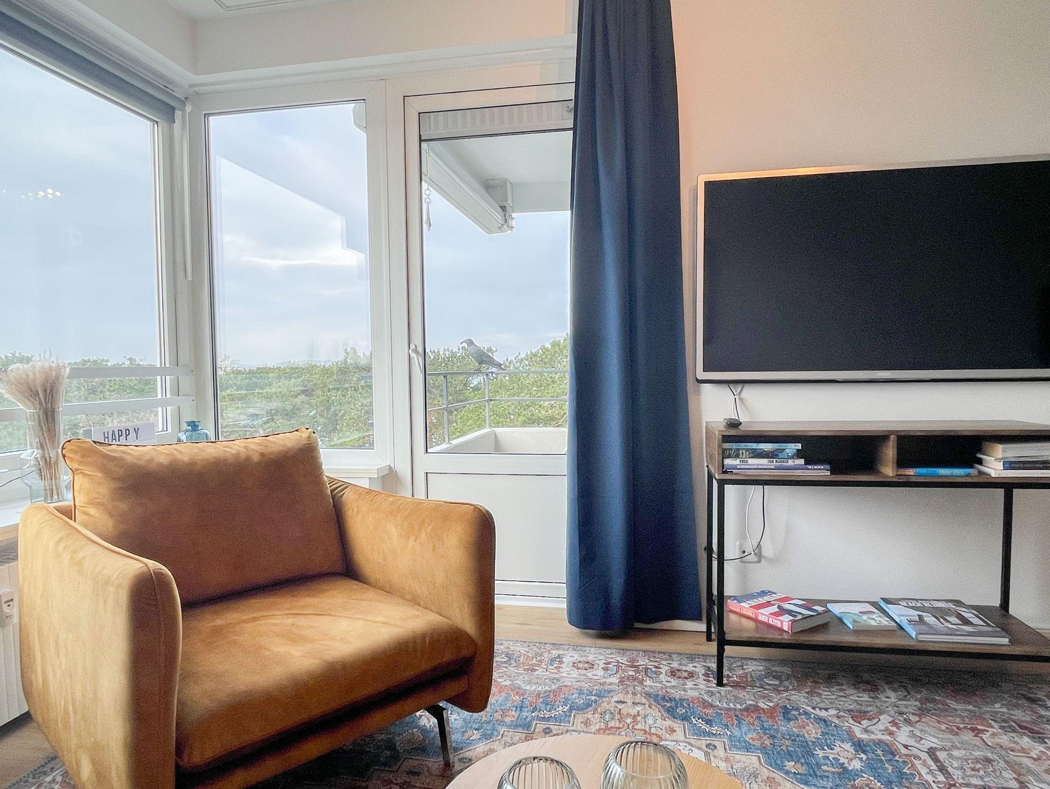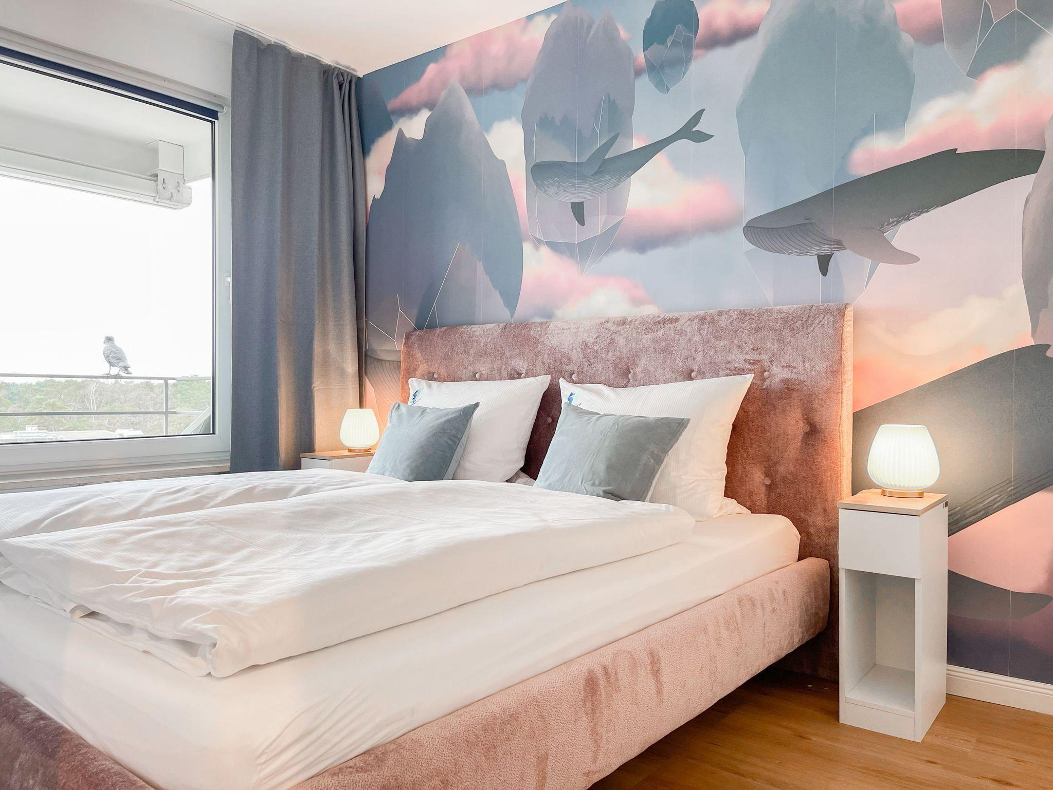 Die aufwendig renovierte und mit viel Liebe zum Detail eingerichtete Ferienwohnung befindet sich in der Endetage im Carpe Diem, einer gepflegten Wohnanlage. Es erwartet Sie ein lichtdurchfluteter Wohnbereich mit schönem Panoramablick, eingerichtet mit einem hochwertigen Schlafsofa, TV, Radio und WLAN sowie einem gemütlichen[nbsp] [nbsp]Essbereich. Die offene, neue Einbauküche ist gut ausgestattet und verfügt über einen Backofen, Cerankochfeld und einen Kühlschrank mit Gefrierfach. Der Balkon in Südwestausrichtung ist mit Gartenmöbeln und einer Markise ausgestattet und bietet einen herrlichen Ausblick, teilweise kann man die Ostsee durch die Bäume blitzen sehen.[nbsp] Meeresrauschen und die frische Seeluft sind garantiert. Das separate Schlafzimmer ist mit einem Doppelbett (180x200)und einem Kleiderschrank mit reichlich Stauraum für die Urlaubsgarderobe ausgestattet. Die Fenster sind mit Jalousien und Vorhängen zur Abdunkelung versehen. Zur Wohnung gehört ein Tiefgaragenstellplatz[nbsp] (Einfahrthöhe 1,95m). Der Fahrstuhl geht bis in die 6. Etage, von dort ist die Endetage über Treppen zu erreichen.