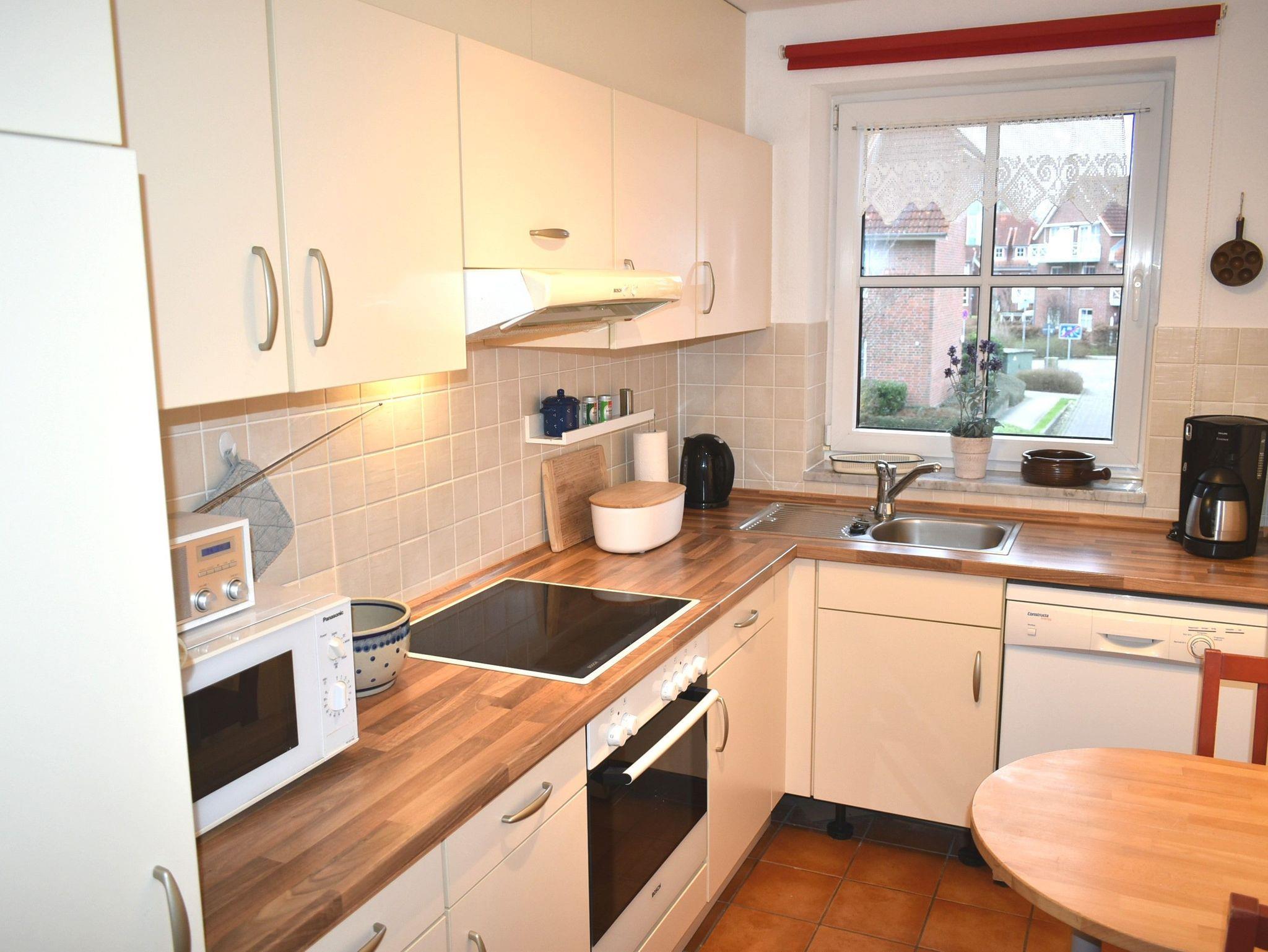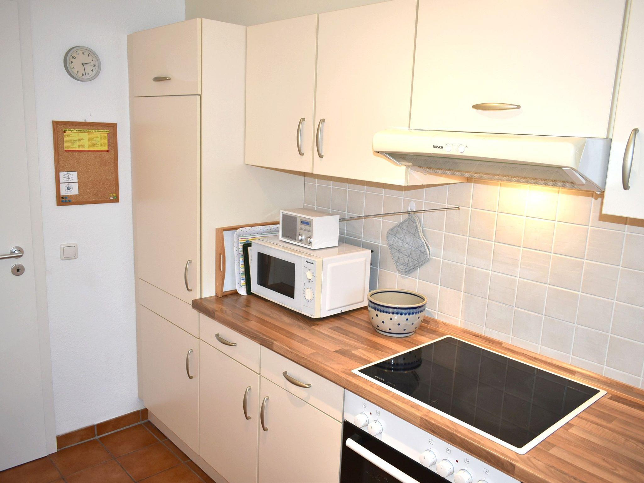 Küche: 4 Plattenherd mit Ceranfeld und Backofen, Dunstabzugshaube, Einbauküche, Geschirr, Handmixer, Kaffeemaschine, Kochtöpfe, Kühlschrank mit 3* Gefrierfach, Mikrowelle, Spülmaschine, Toaster, Wasserkocher, 2 Stühle, Esstisch, Radio