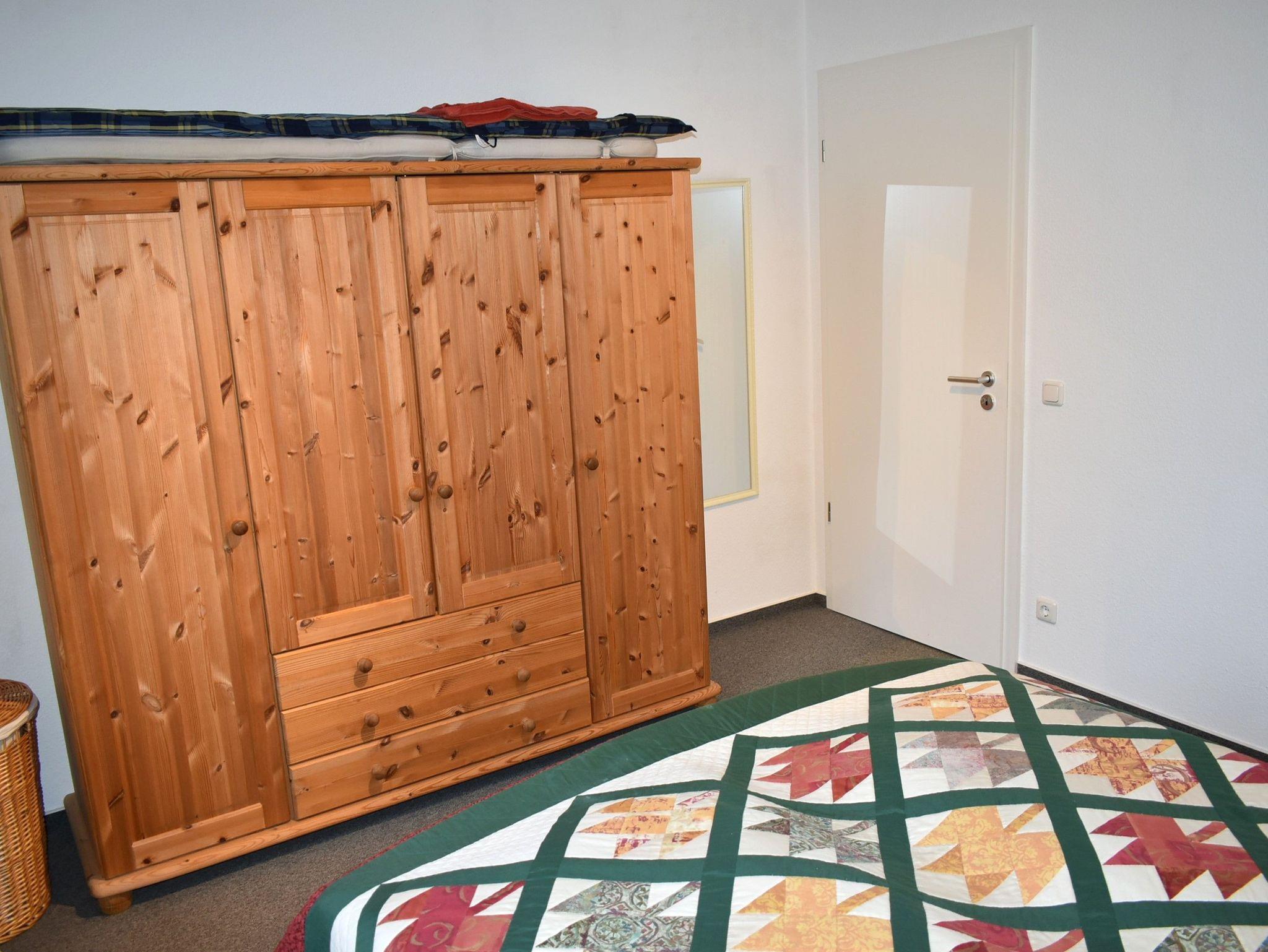 Schlafzimmer 1: Spiegel, Wäschekorb, 2 Matratzen, 2 Nachttische, Doppelbett 2,00 x 2,00 m, Kleiderschrank, Stuhl, Wandlampe