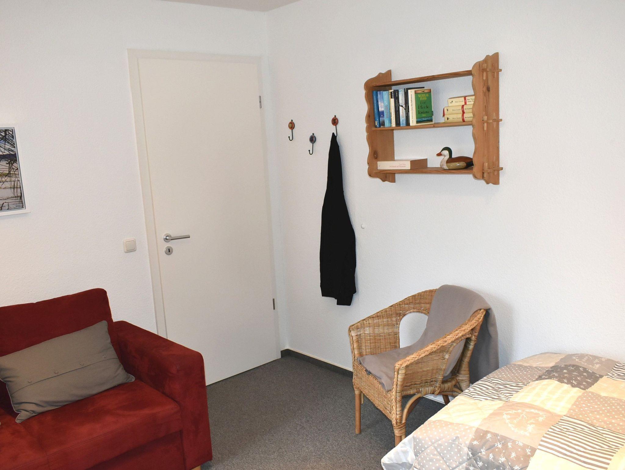 Schlafzimmer 2: Einzelbett 2,00 x 0,90 m, Nachttisch, Anrichte, Couchtisch, Flachbildschirm, Kabel-TV, Korbsessel, Schlafcouch 2,00 x 1,25 m, Stehlampe