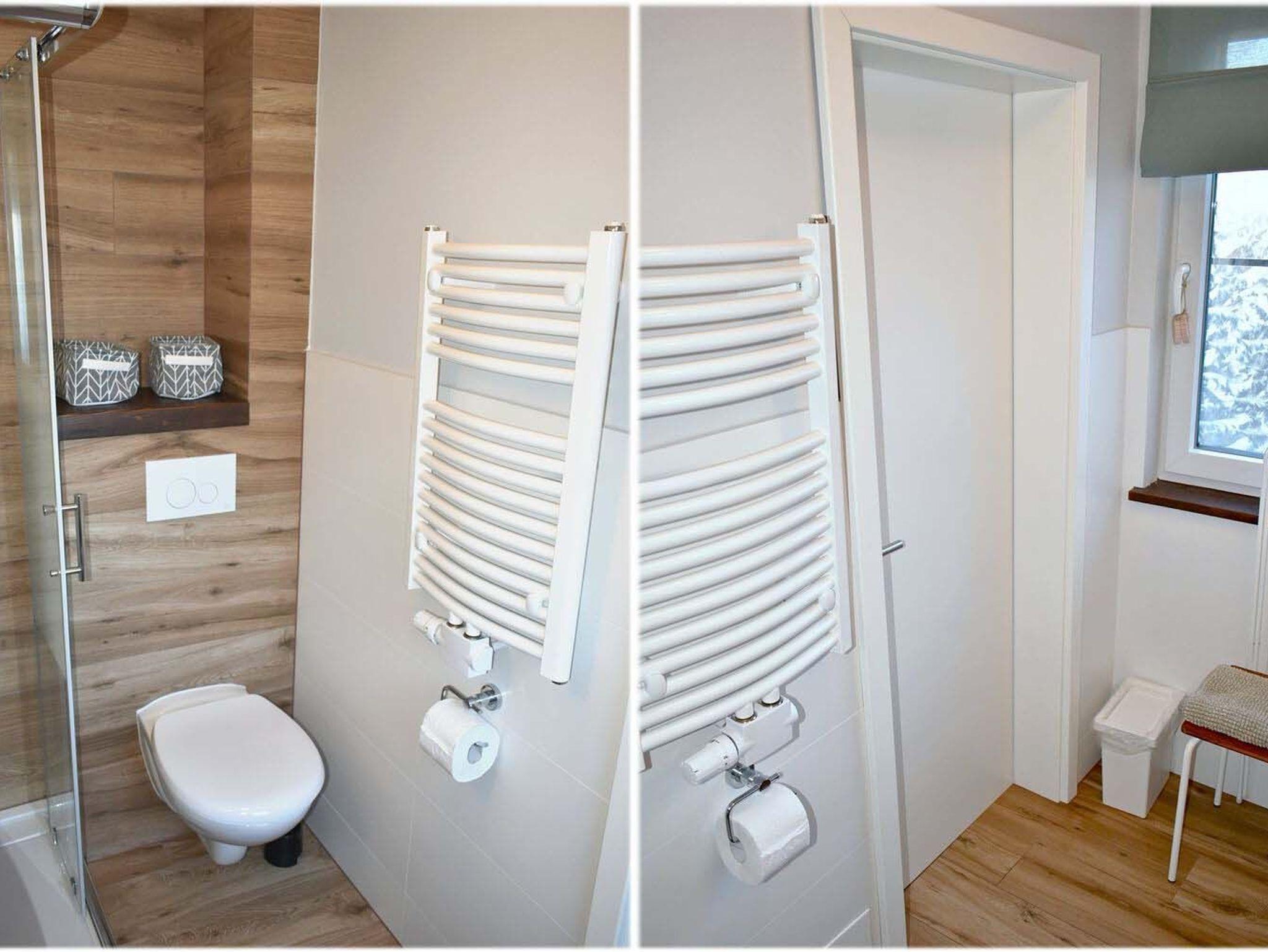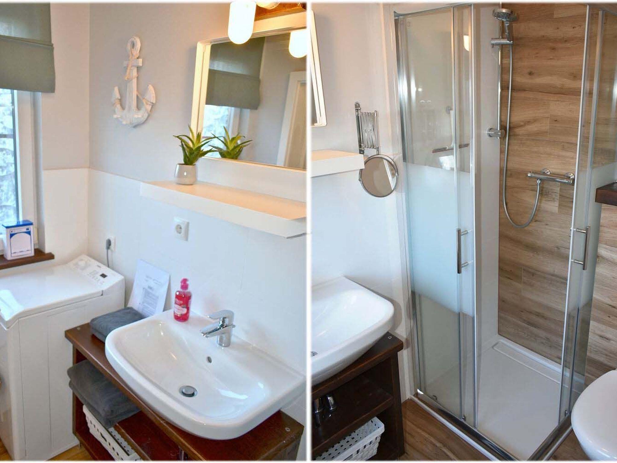 Bad 1: Dusche, Duschkabine, Hocker, Kosmetikspiegel, Regal, Spiegel, Waschbecken, Wäscheständer, Waschmaschine, WC