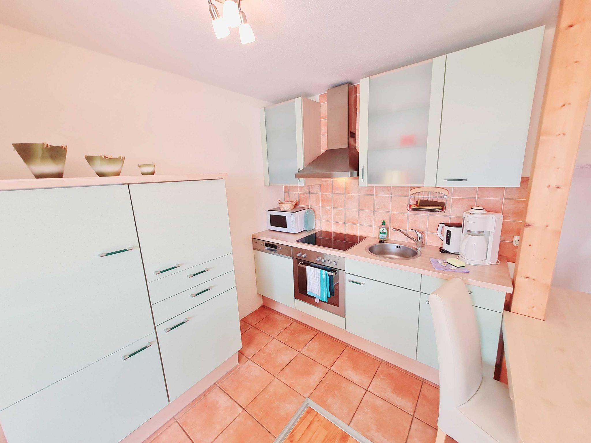• Küche und Essbereich für 4 Personen + Zustelltisch für 2 weiter Personen, offen zur Diele und Wohnzimmer, komplett eingerichtete Einbauküche, mit Backofen, Ceranfeld, Toaster, Kaffeemaschine, Wasserkocher, Kühlschrank mit Gefrierfach, Geschirrspüler, Mikrowelle