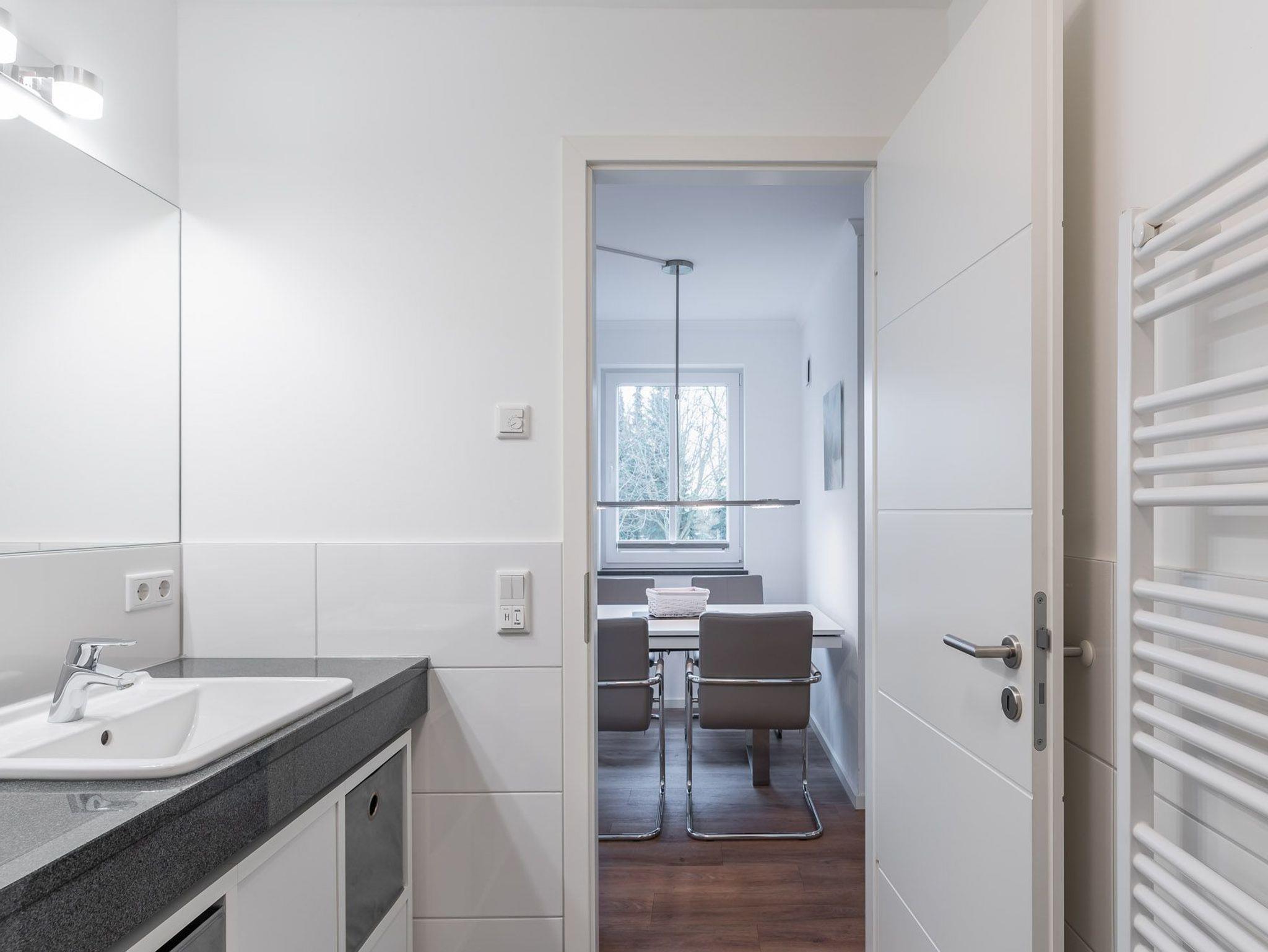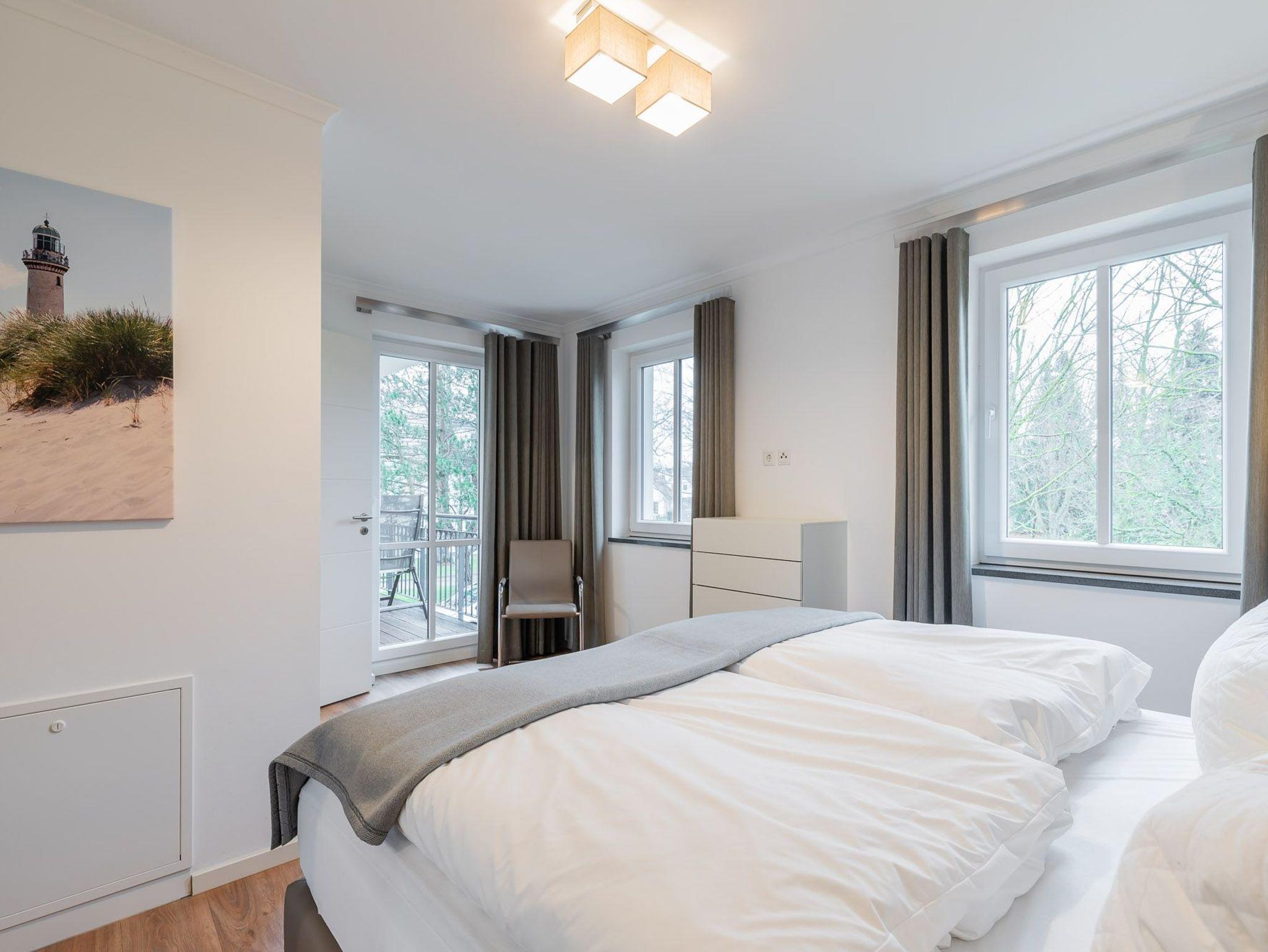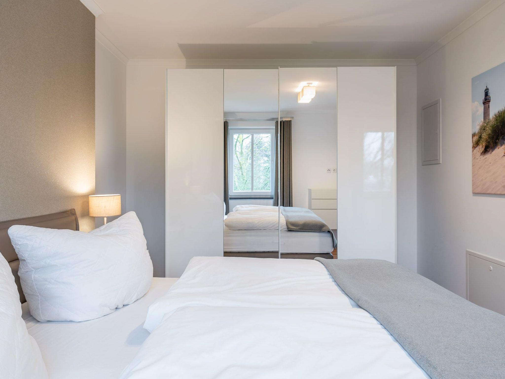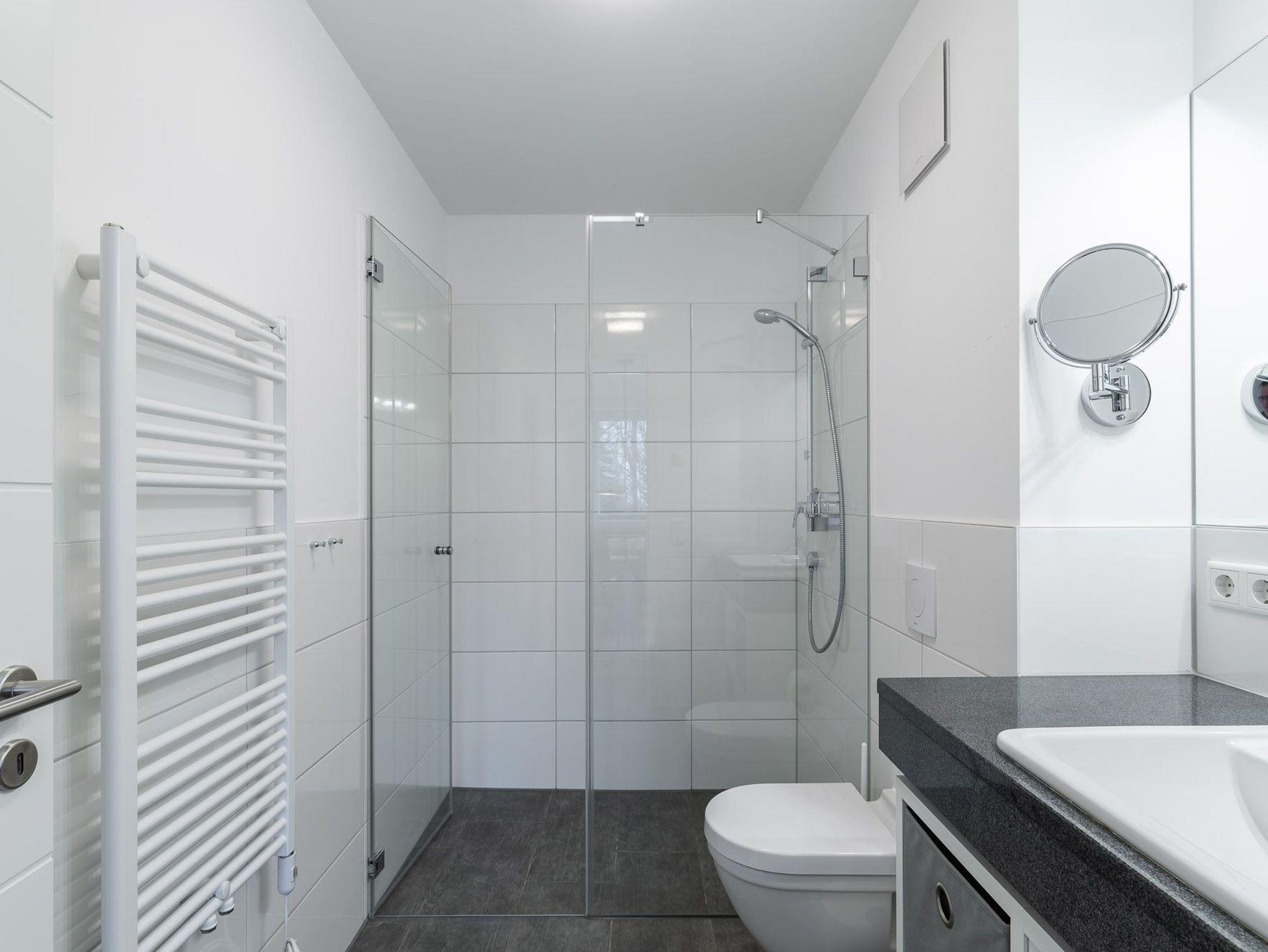 Weiterhin bietet die Ferienwohnung ein geräumiges Schlafzimmer mit einem großzügigen Kleiderschrank. Ein Boxspringbett mit einer durchgehenden Matratze/Topper (1,80x2,00 m) sorgt für einen erholsamen Schlaf. Das Badezimmer ist mit einer bodengleichen Dusche, einem großen Waschtisch, einem Wandspiegel und einem Fön ausgestattet.