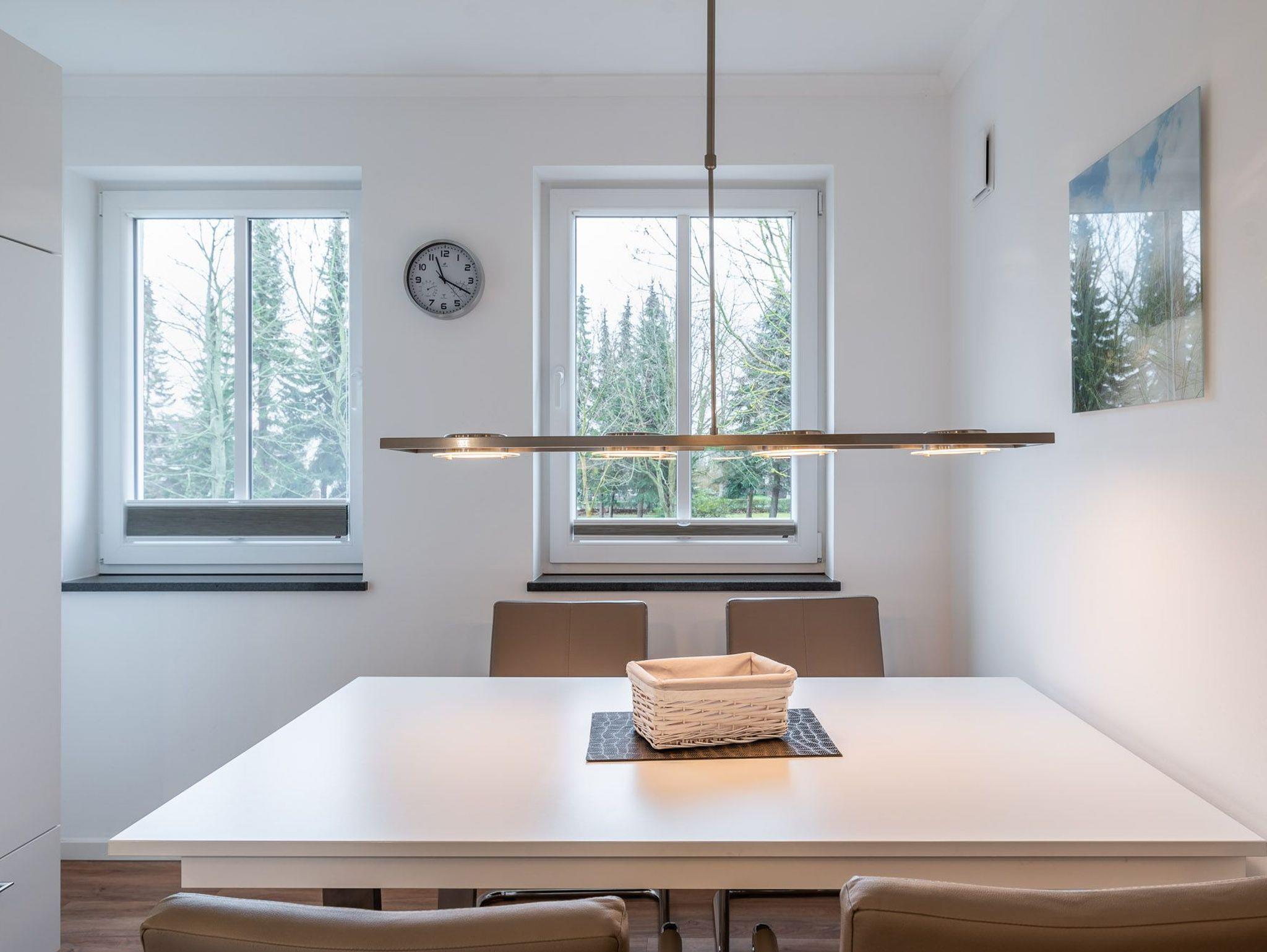 Die Küche ist ausgestattet mit einer hochwertigen Einbauküche, einem Esstisch und vier Stühlen, Geschirrspüler, Kühlschrank mit Gefrierfach, Kaffeemaschine, Wasserkocher, Toaster, Mixer, ausreichend Geschirr und Besteck, 4-Platten-Herd (Ceran) mit Backofen und einer Mikrowelle.