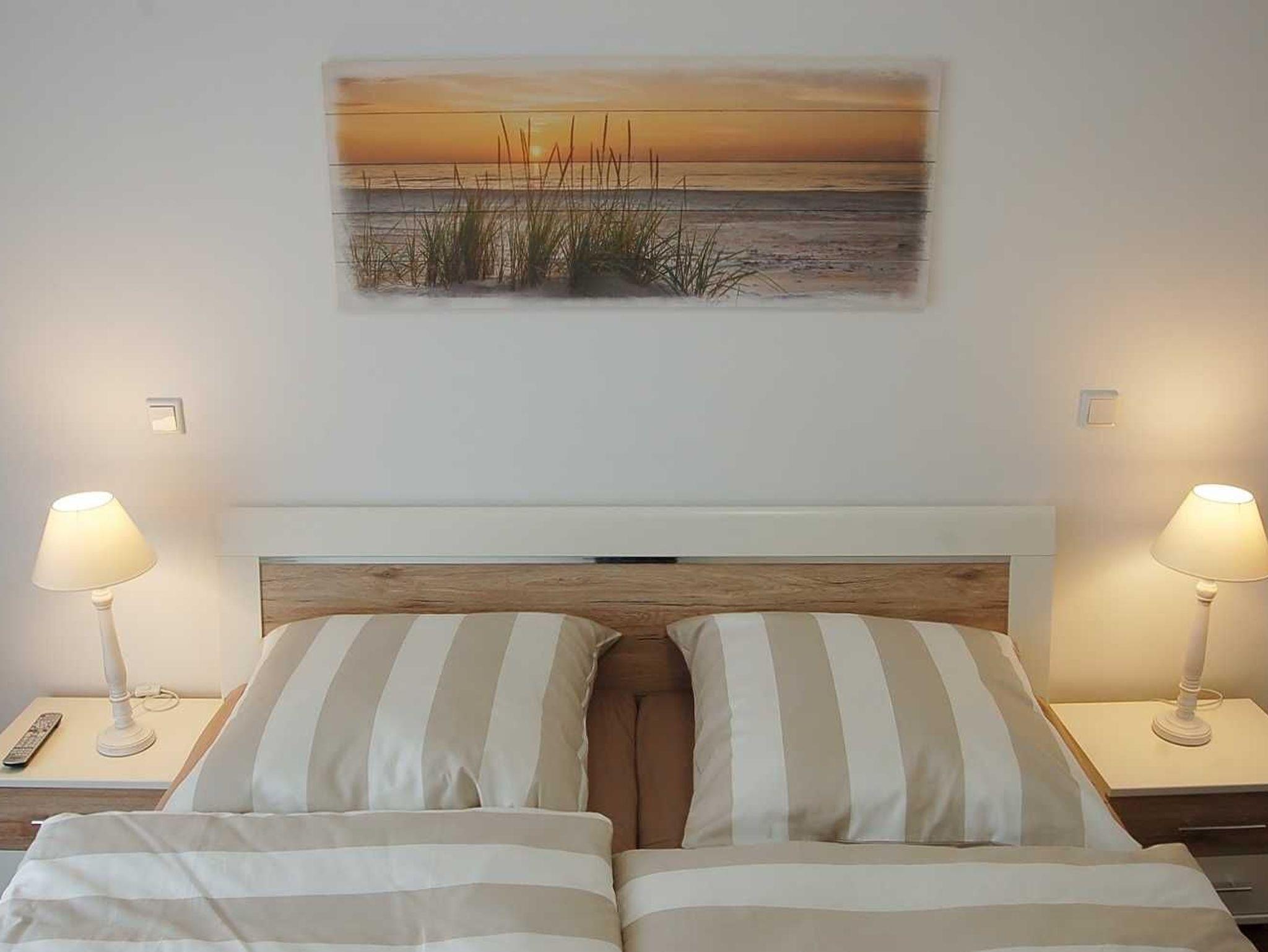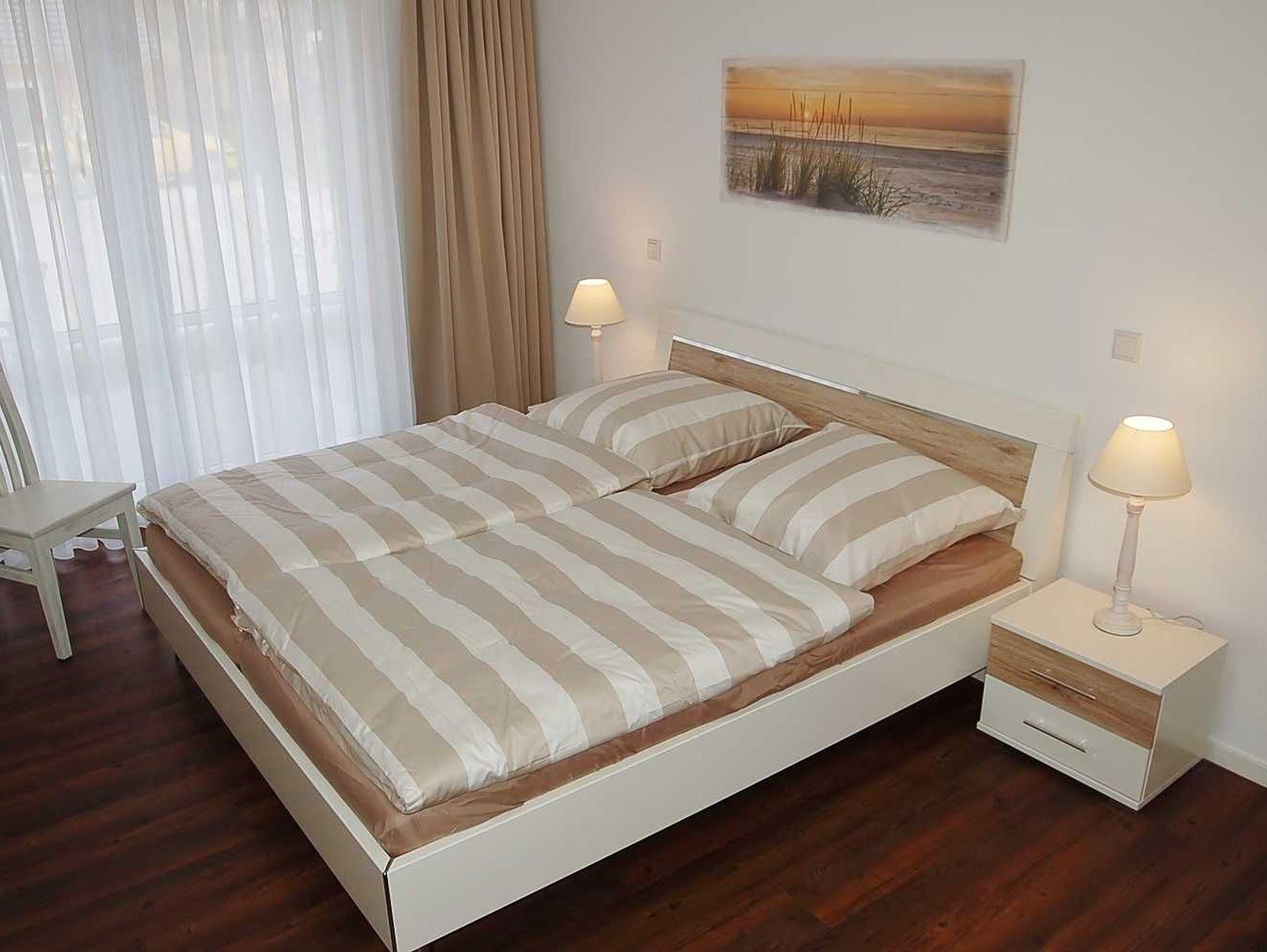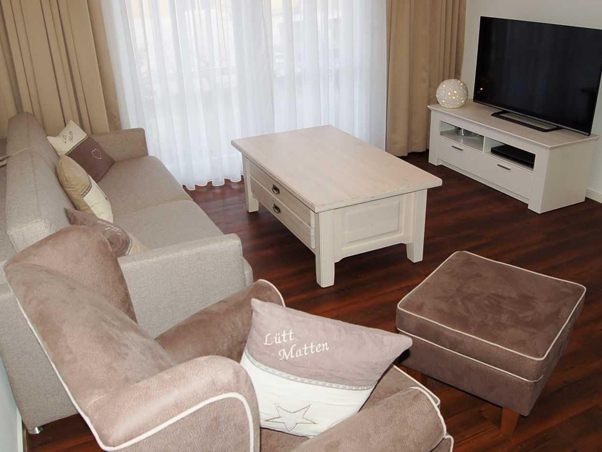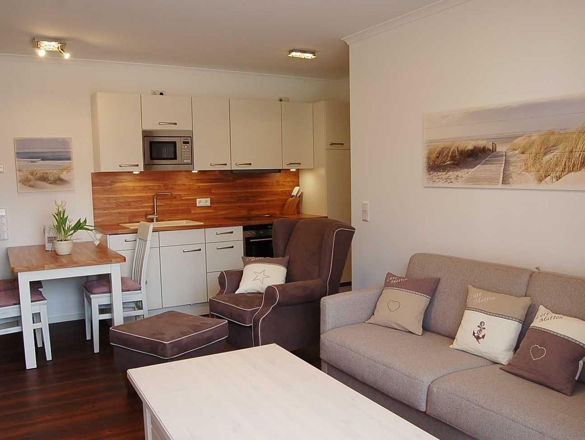 Freuen Sie sich auf wunderbare Tage am Strand und gleichzeitig auf die gediegene Atmosphäre Ihres 59 Quadratmeter großen Apartments im bequem erreichbaren Erdgeschoss mit einem großzügigen Koch-, Ess- und Wohnbereich. Der Wohnbereich verfügt über eine große und gemütliche Schlafcouch. Weiterhin bietet dieses wunderschöne Appartment zwei geräumige Schlafzimmer mit einem Doppelbett und einem Bett mit Ausziehfunktion für eine zweite Person und großzügigen Kleiderschränken. Das Duschbad ist mit einer bodengleichen Dusche, einem großen Waschtisch und Wandspiegel ausgestattet. Auf der mit Tisch und sechs Relaxstühlen möblierten Terrasse können Sie viele gemütliche Sonnen- oder Abendstunden verbringen.
