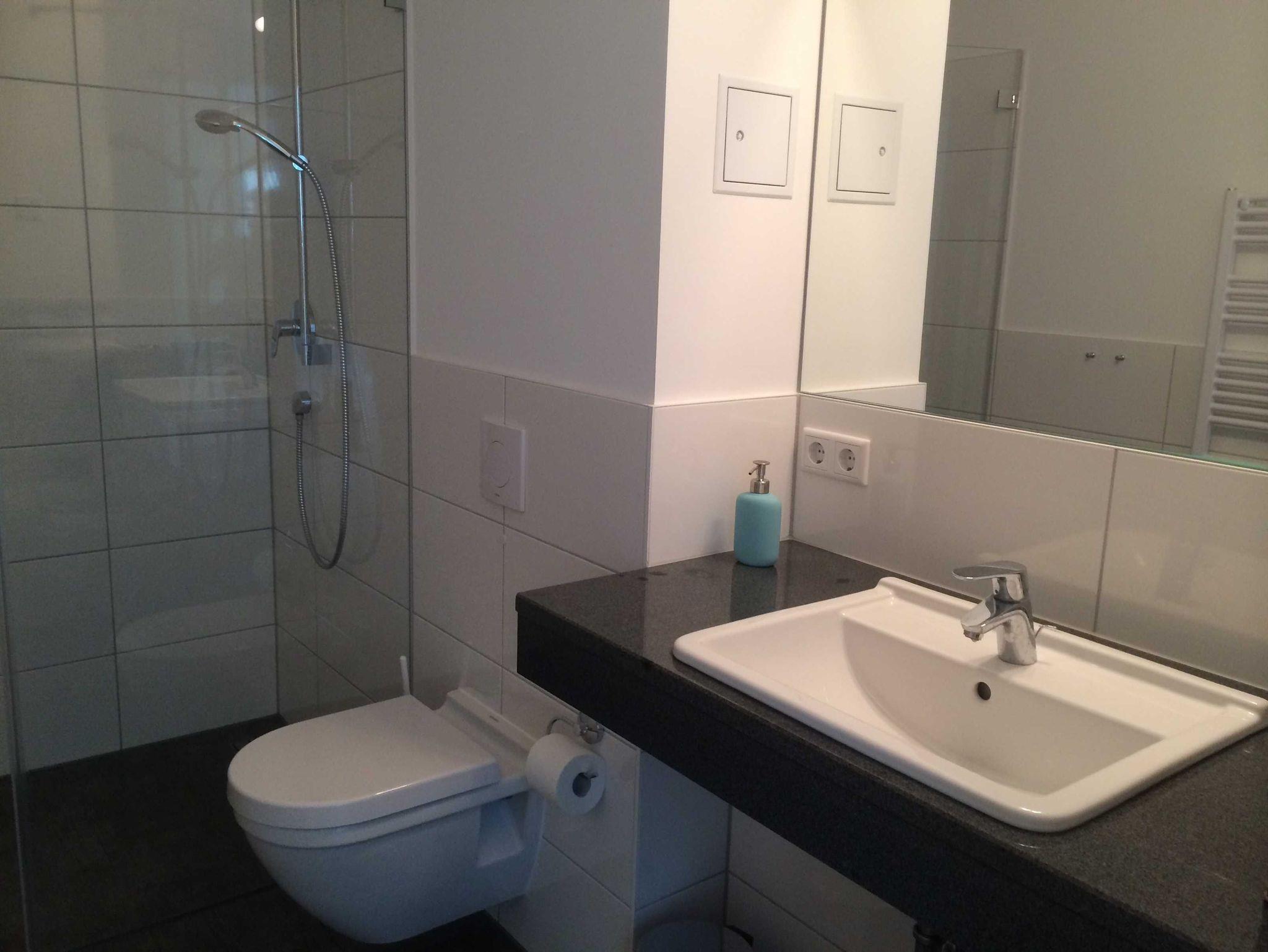 1Duschbad mit bodengleicher Dusche und Haartrockner,
